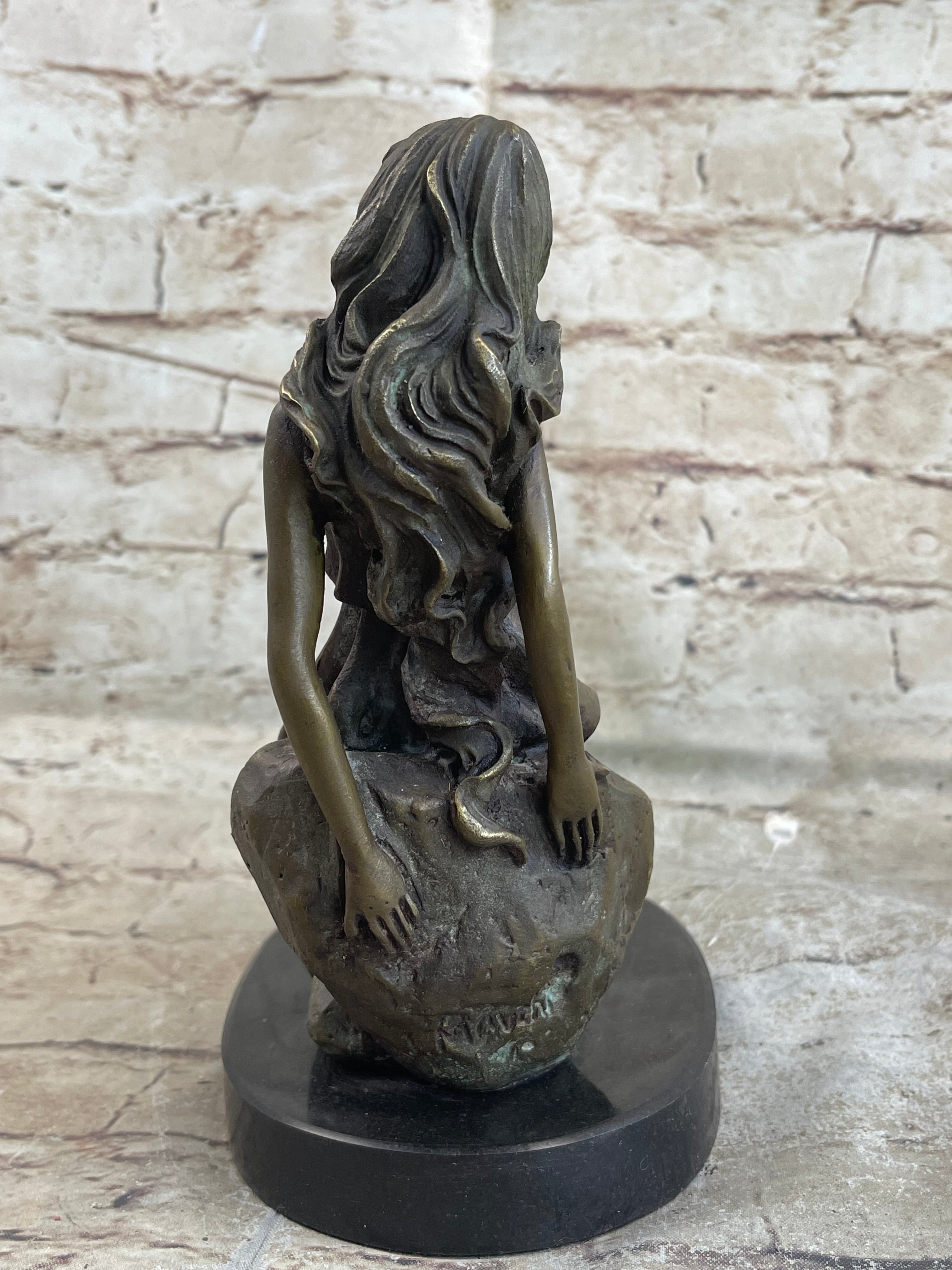 The artist has meticulously crafted each aspect of her pose, where her hands rest gently on the rock, and her hair cascades over her face and spills off the stone surface. Every detail is finely rendered, from the delicate strands of hair to the precise depiction of her fingers and toes. This attention to detail invites viewers to appreciate the intricacies of human form and emotion captured in bronze.