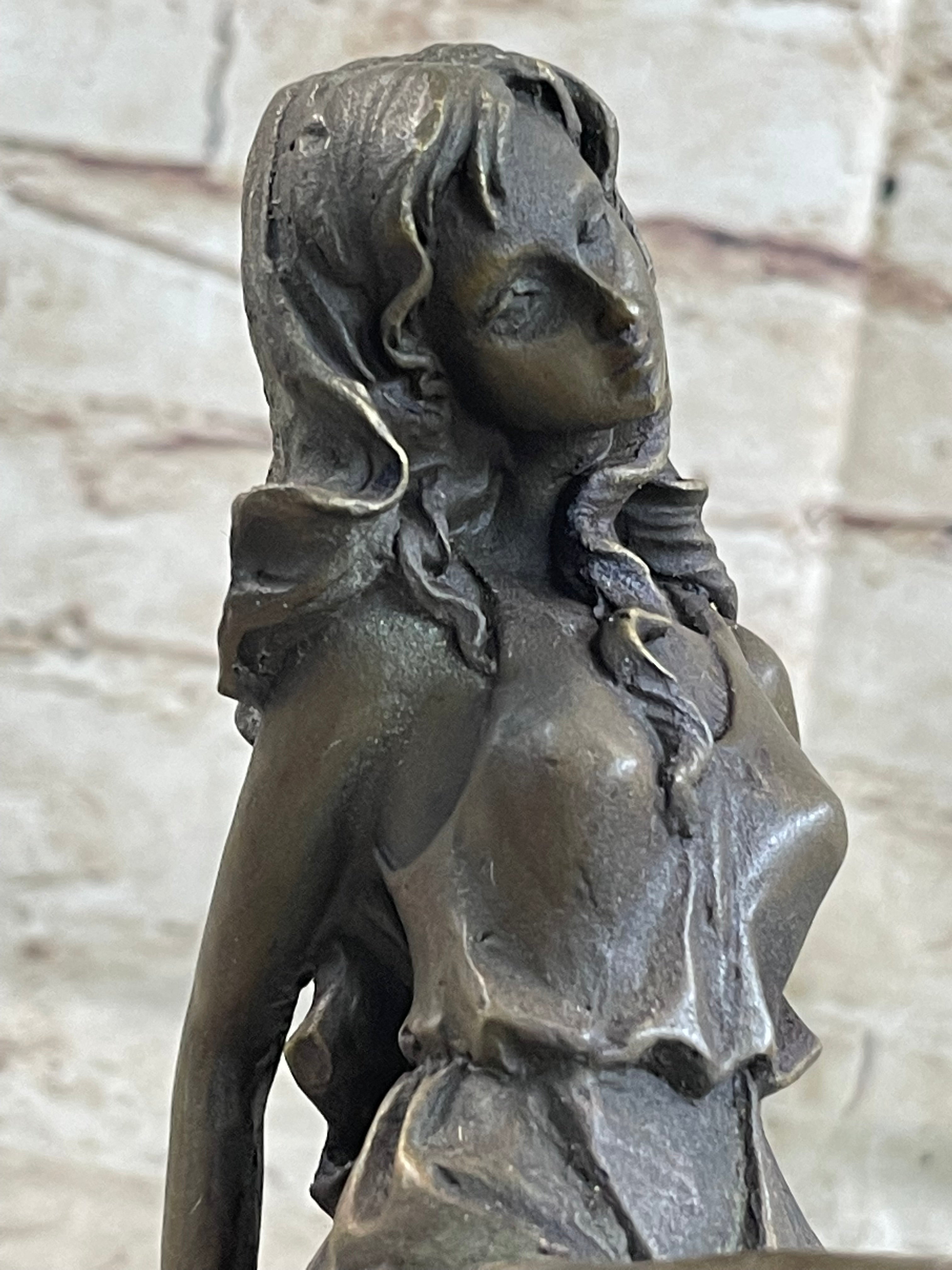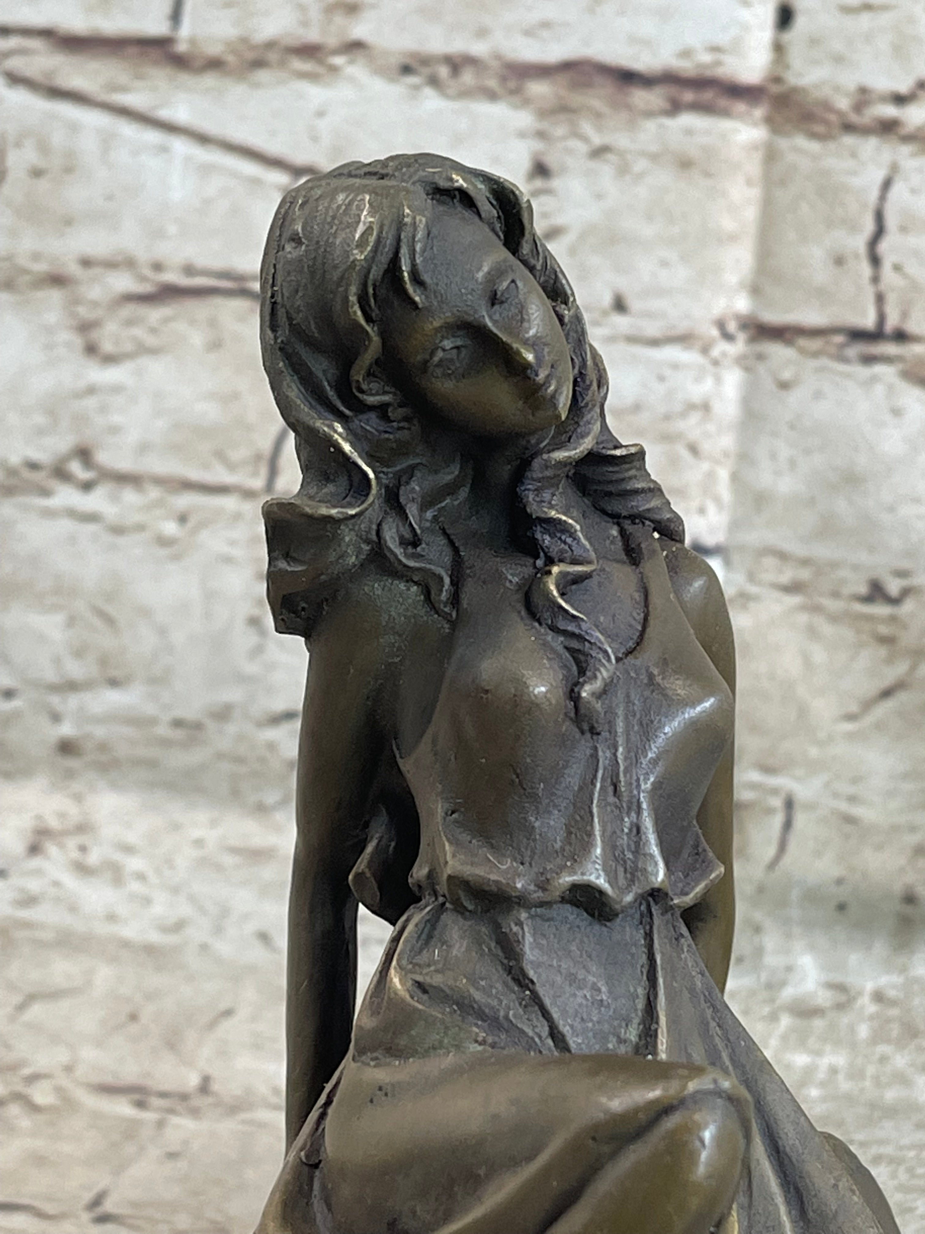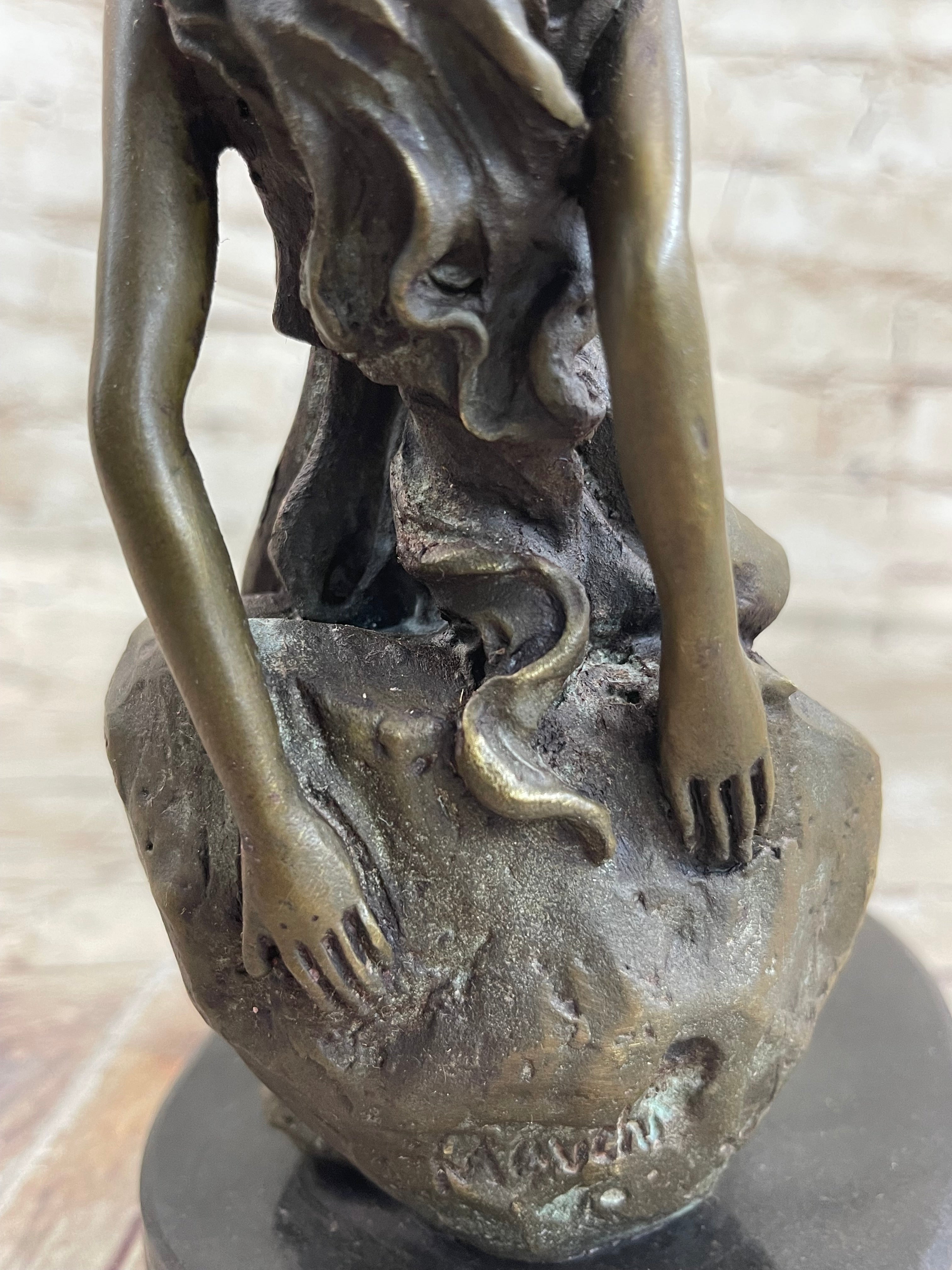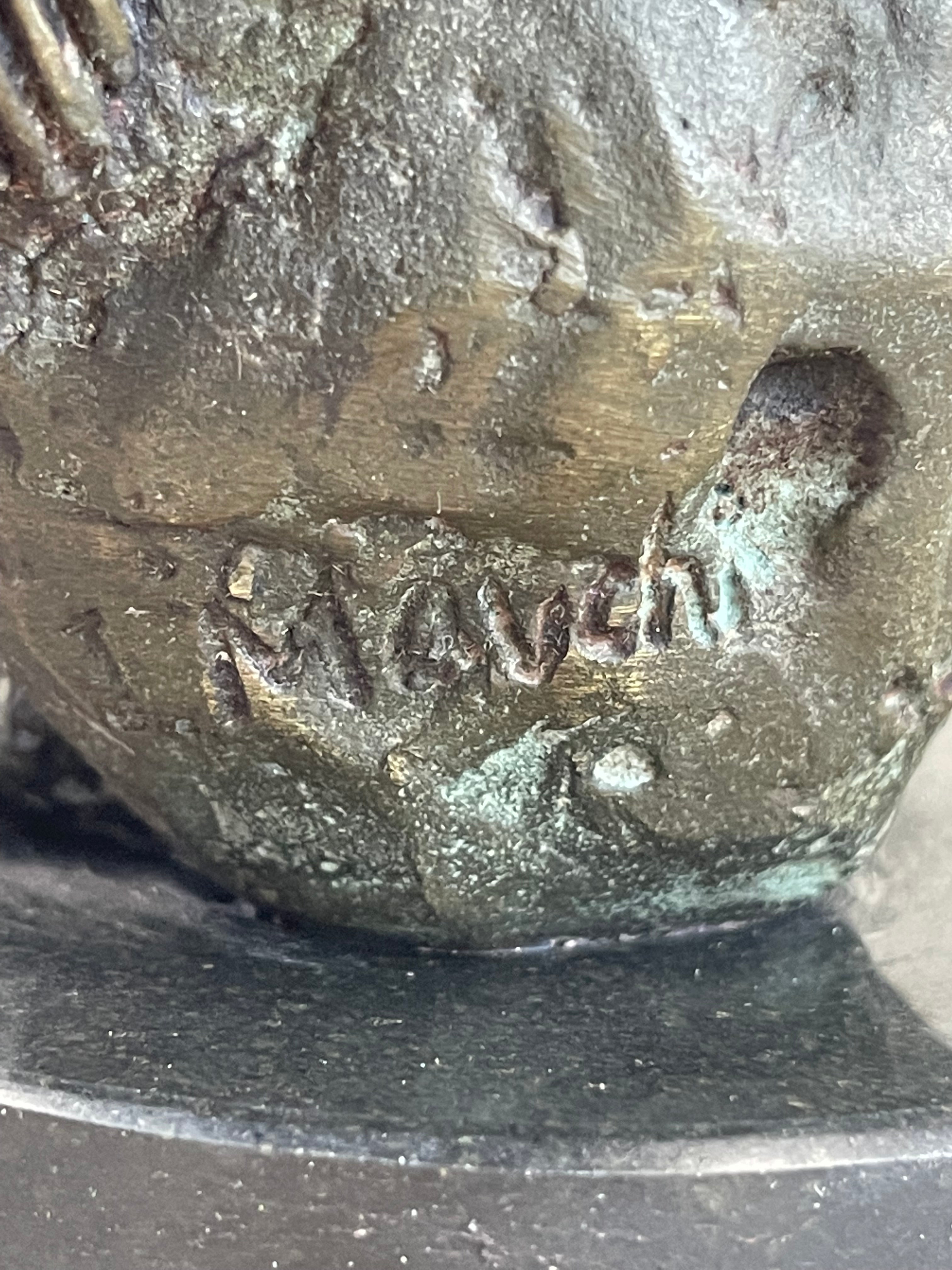 Created using the "Lost Wax Method," this sculpture exhibits a rich brown patina, enhancing its lifelike appearance and timeless appeal. Signed by the artist Mavchi, it stands as a testament to both artistic skill and emotional expression. This piece not only celebrates the beauty of the human body but also conveys a deeper narrative of inner strength and emotional fortitude.Bronze Dimensions with Marble Base: Height 8" X Width 6"