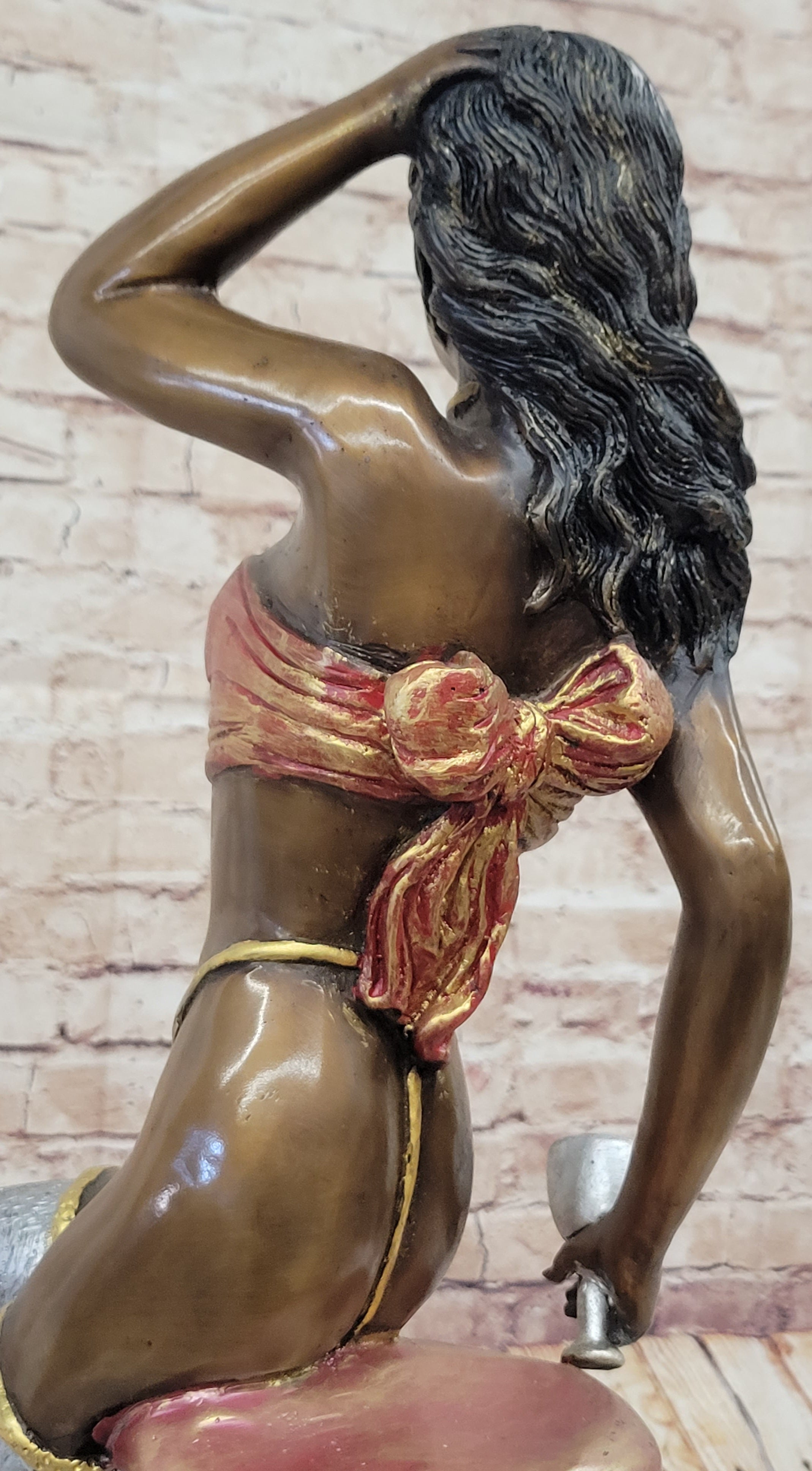 This captivating bronze statue portrays a graceful female figure in a serene seated position, delicately touching her hair as she holds a cup in her hand. The sculpture exudes a sense of poise and elegance, showcasing the artist's attention to detail and skill in capturing the beauty of the human form. With a stunning multi-color patina finish, the sculpture emanates a timeless charm, making it a valuable addition to any art collection.