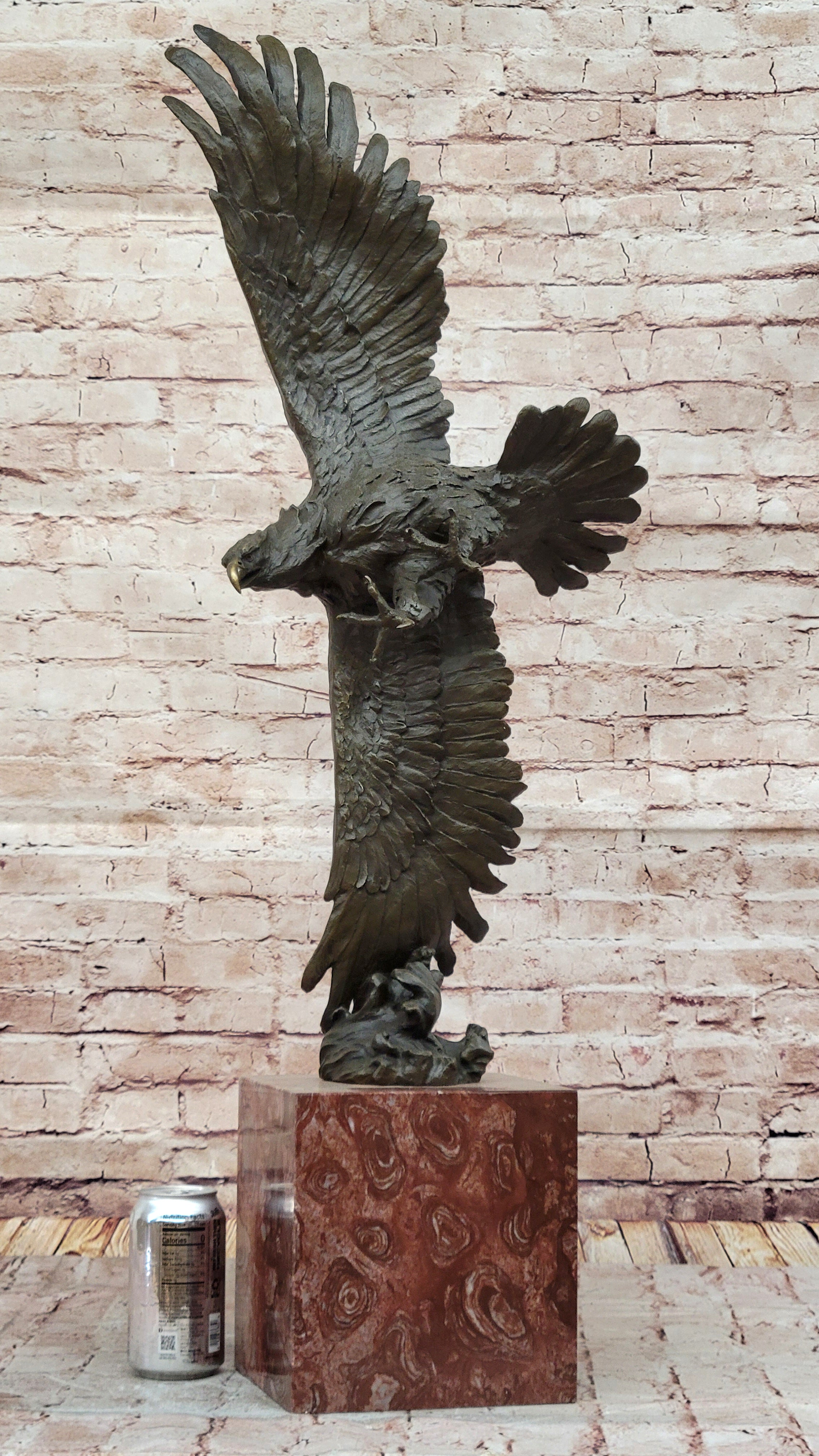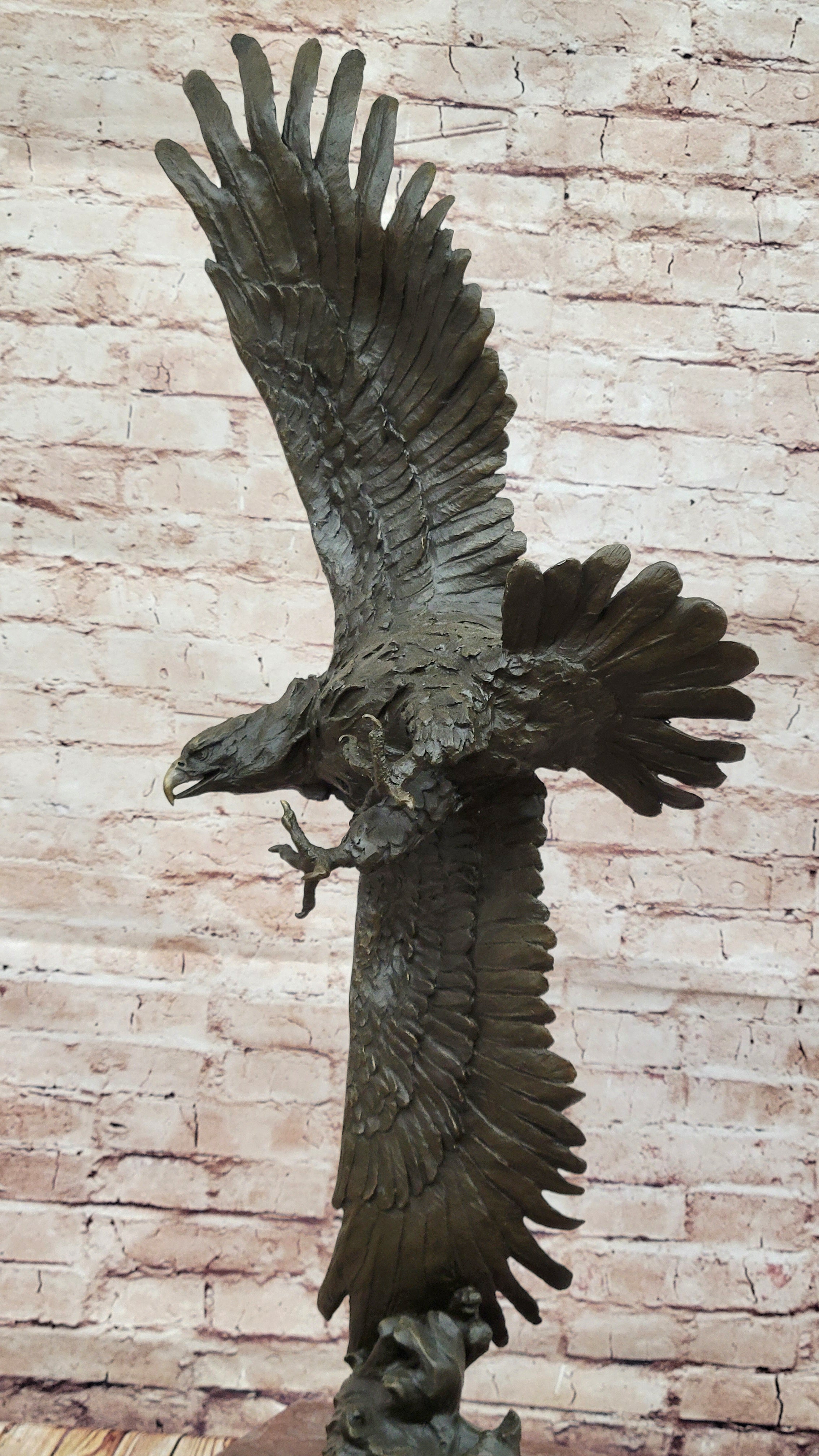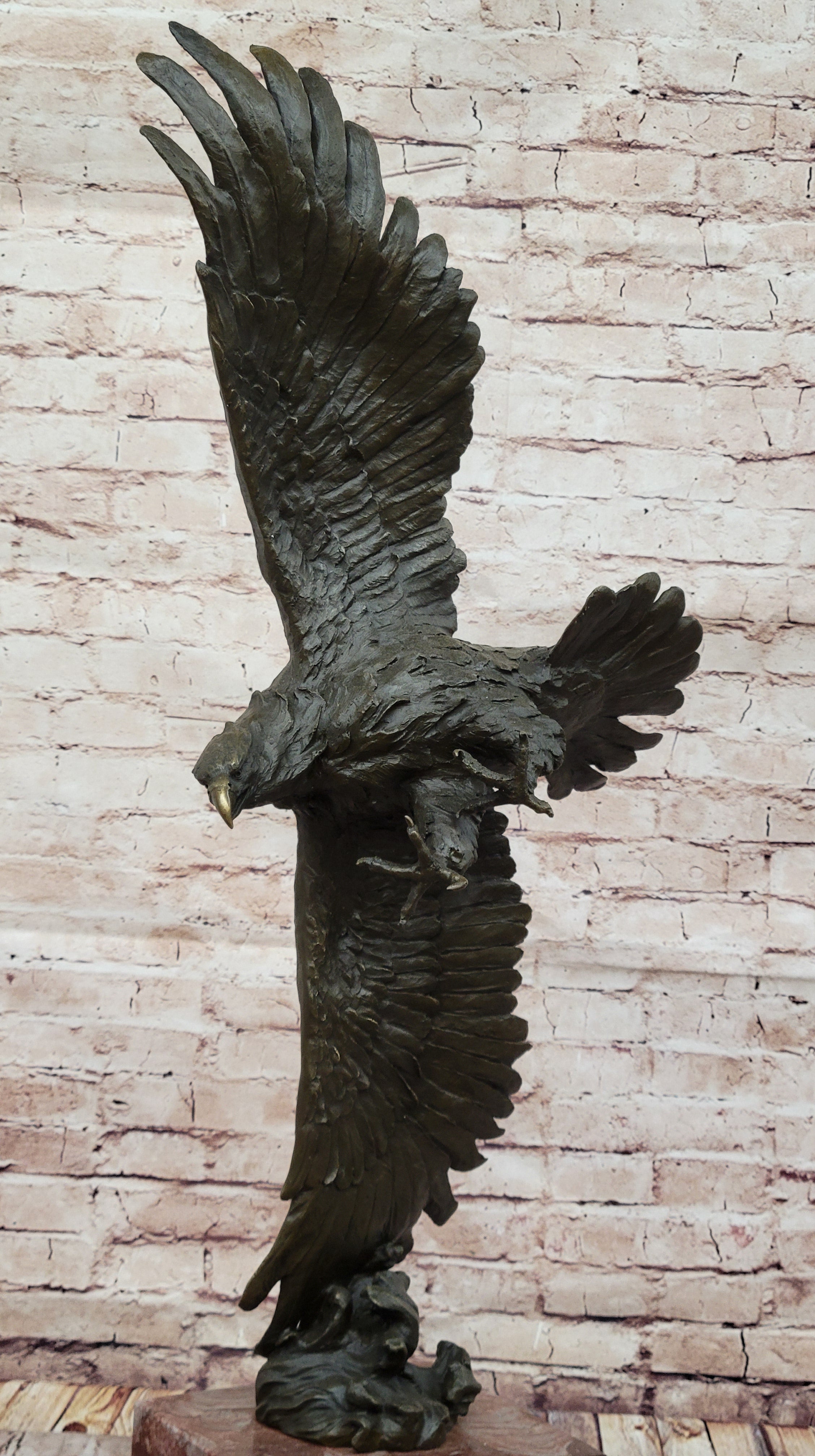 This extraordinary bronze sculpture pays tribute to the majestic American bald eagle, a symbol of strength and freedom. Capturing a breathtaking moment, the sculpture depicts the eagle in full flight, its wings and claws extended wide as it swoops down toward the earth. With intricate craftsmanship, the artist has meticulously rendered the eagle's feathers, talons, and beak, bringing this powerful creature to life. The rich dark brown patina enhances the sculpture's depth, adding an elegant and lifelike appeal.