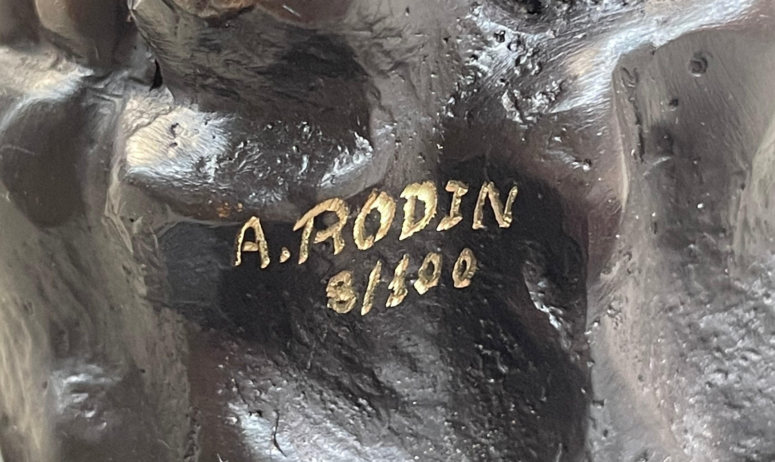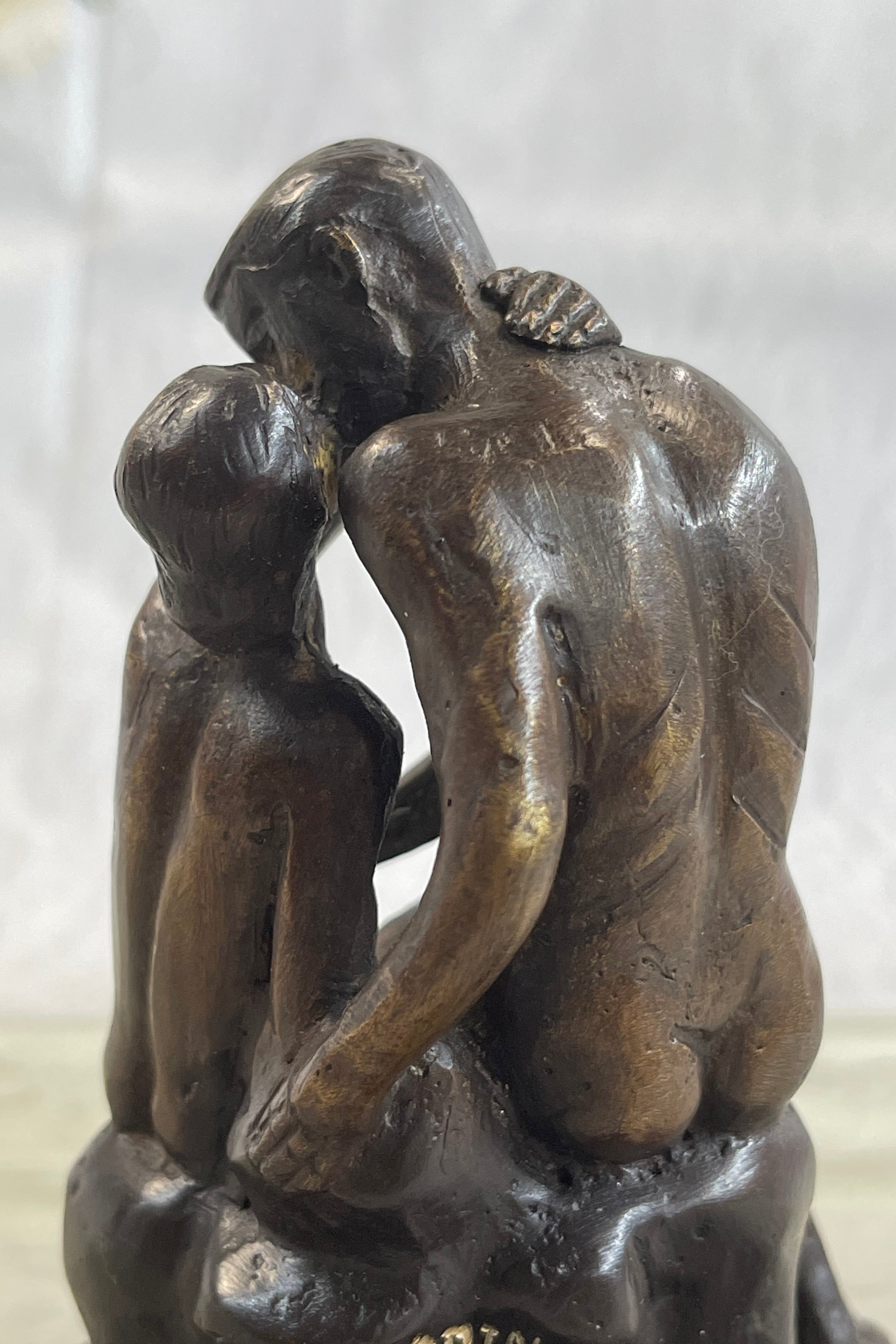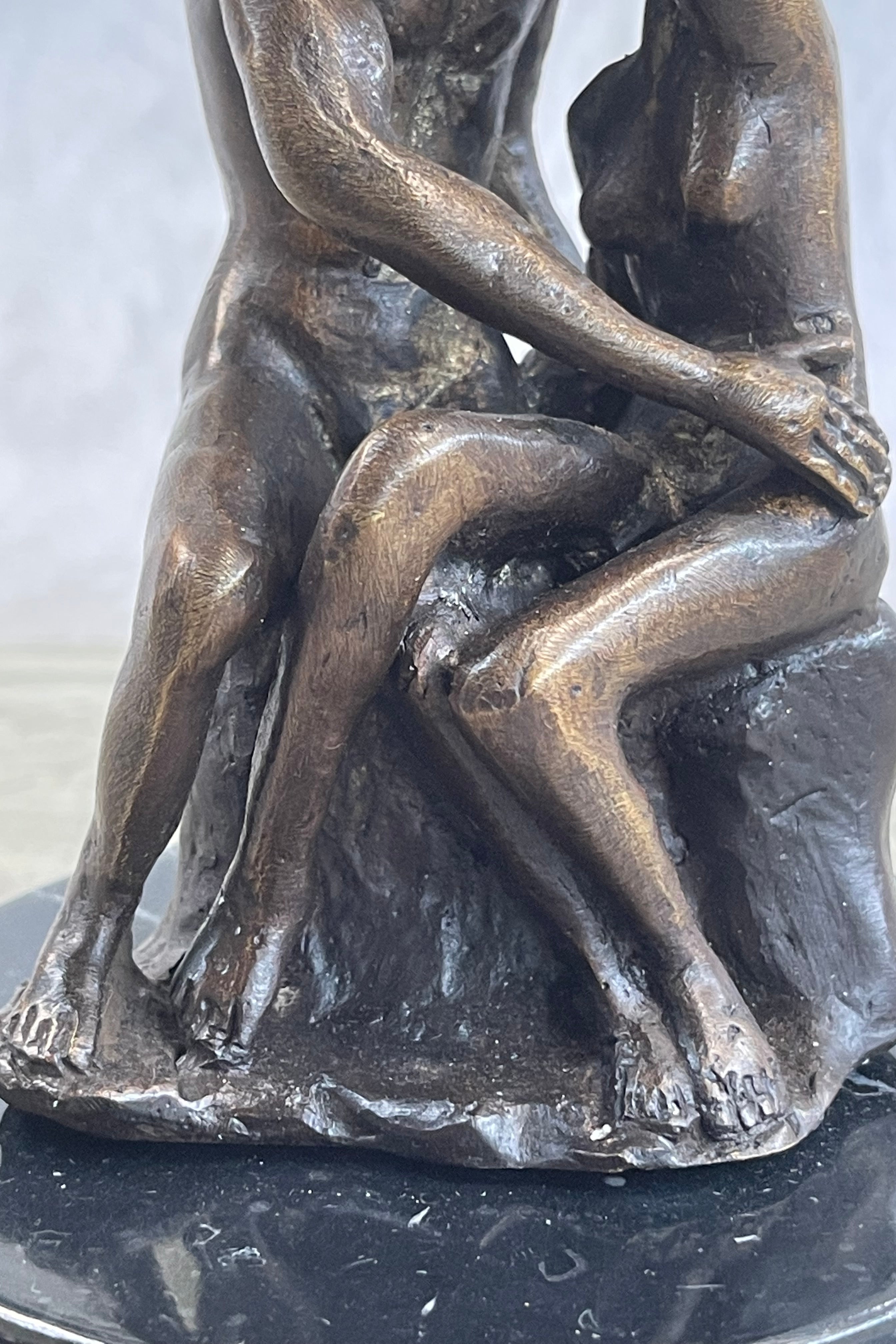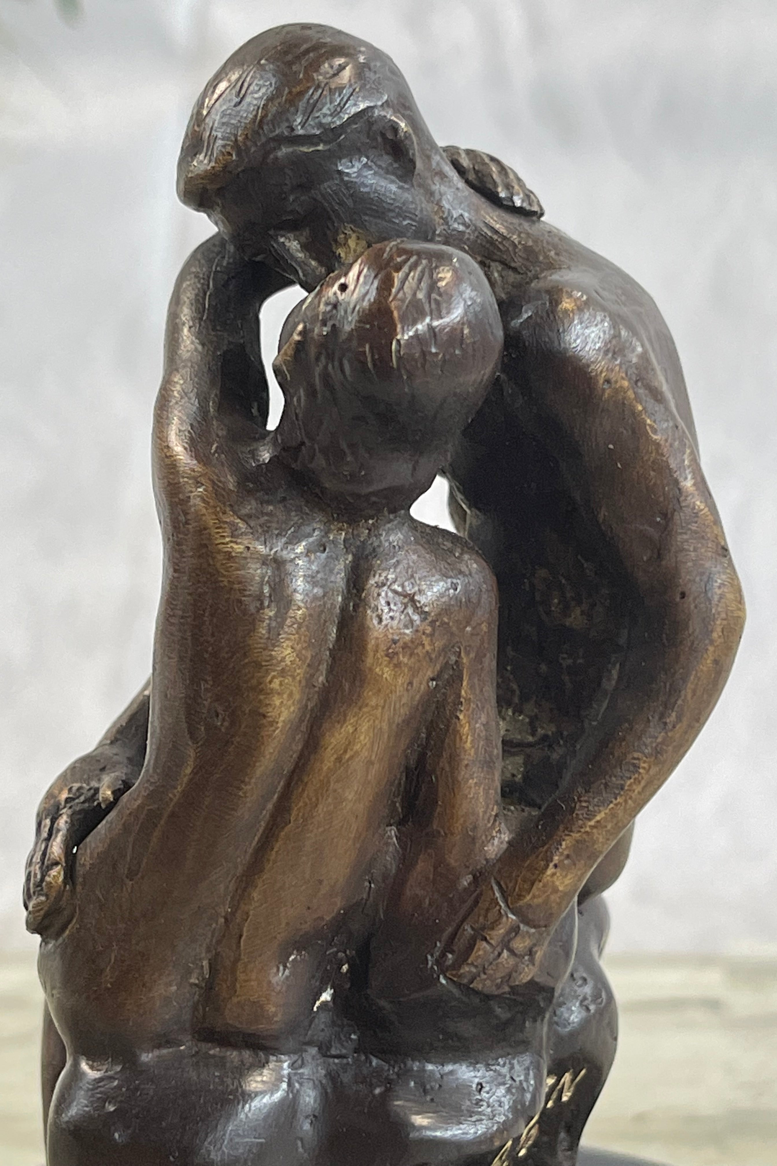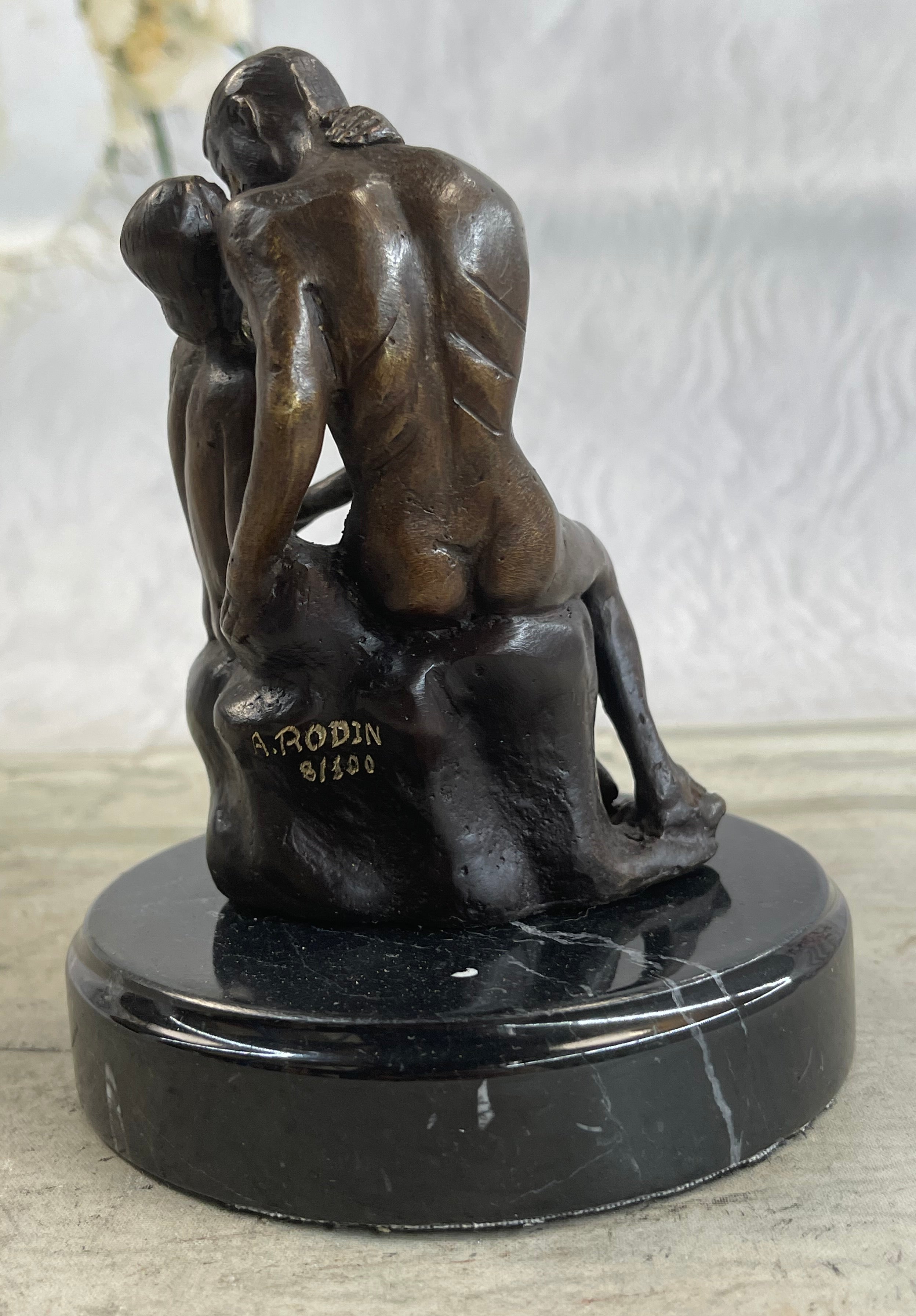 Lovers embrace passionately on the edge of a rock on the beach. Completely enveloped in each other’s arms, these two cannot be separated even by the cruelest of fates. The woman drapes her leg over his and rests her other foot on his, craving to be closer. She wraps her arm around his neck and pulls him into her kiss. The careful details are in the kiss. You can see where their lips meet and never part. A sheet gathers to the side of their nude bodies and she leans back slightly on it. 100% bronze and handmade, this sculpture was cast using the “Lost Wax Method”. The hand-sized kissing duo are in a brown patina and mounted on a marble base and is signed Rodin.Weight : 4 LBS