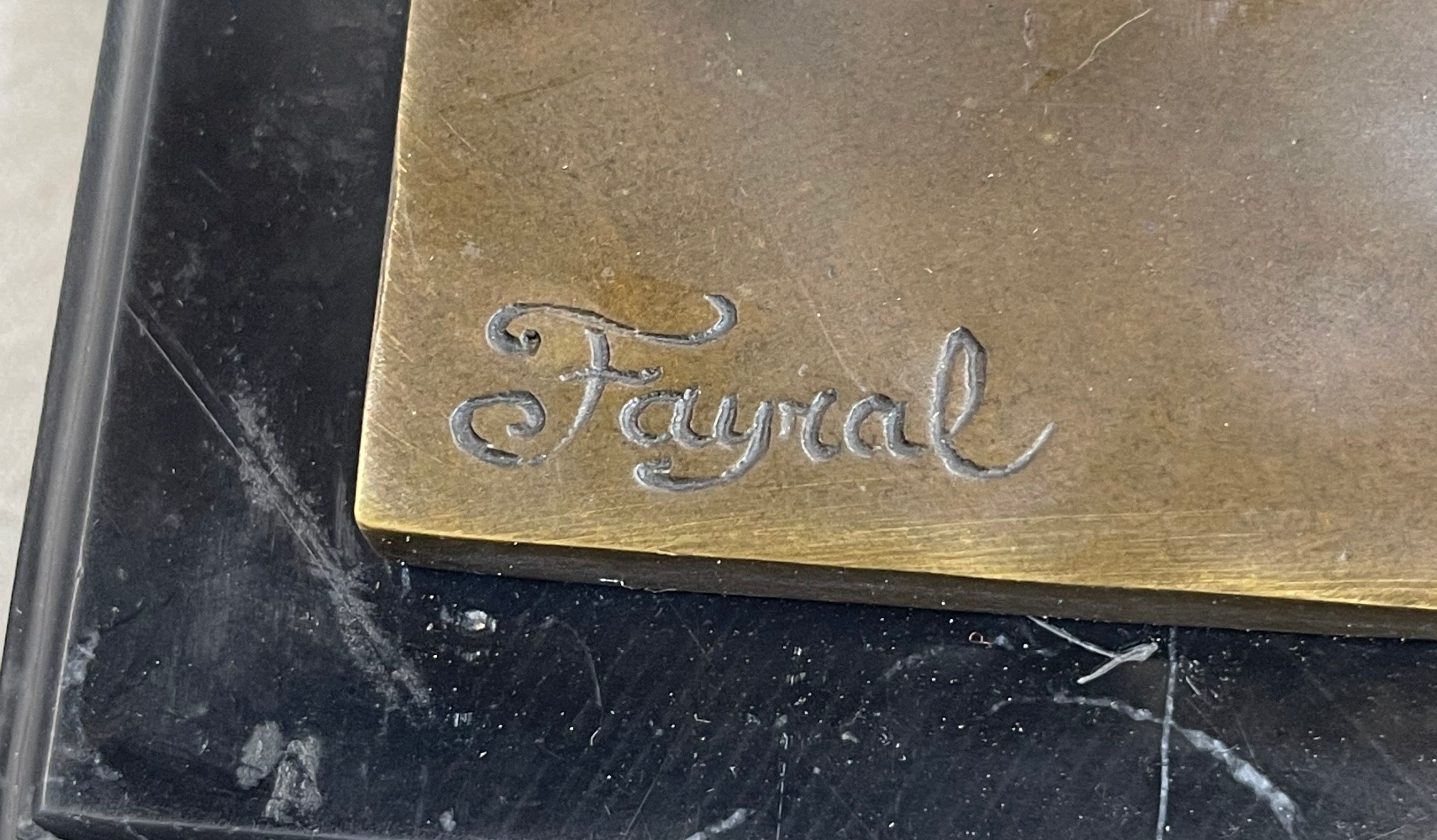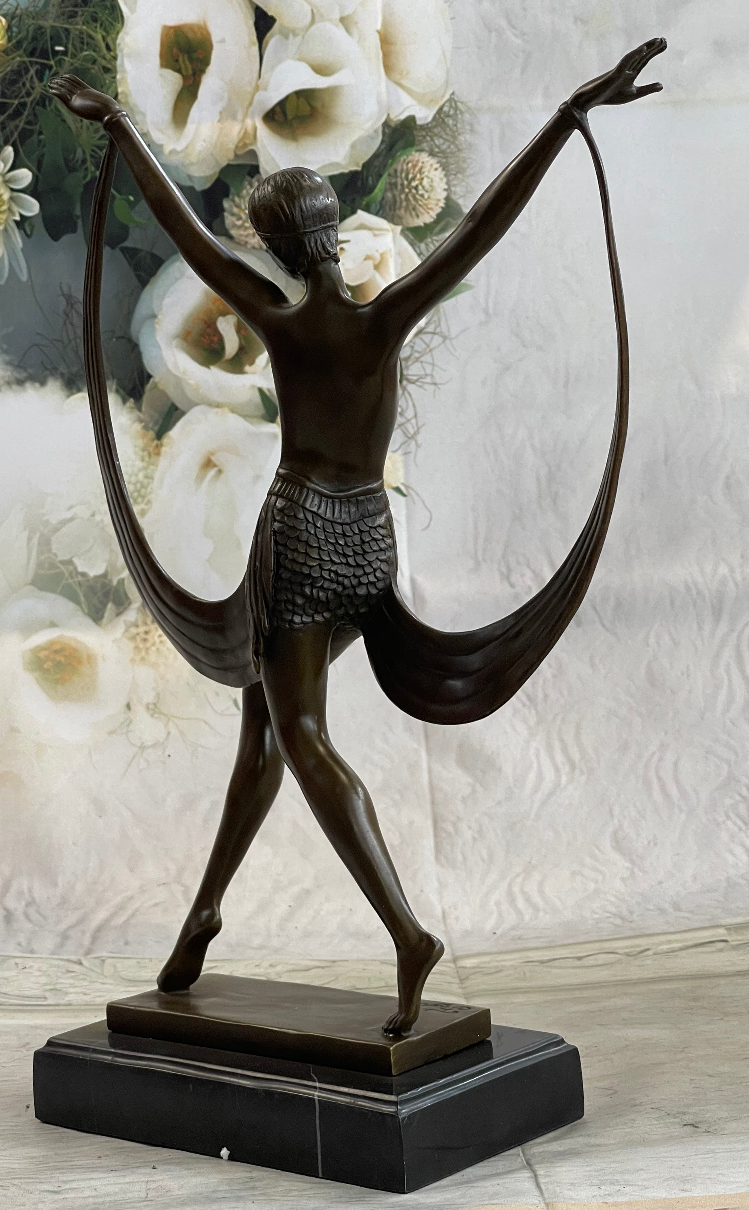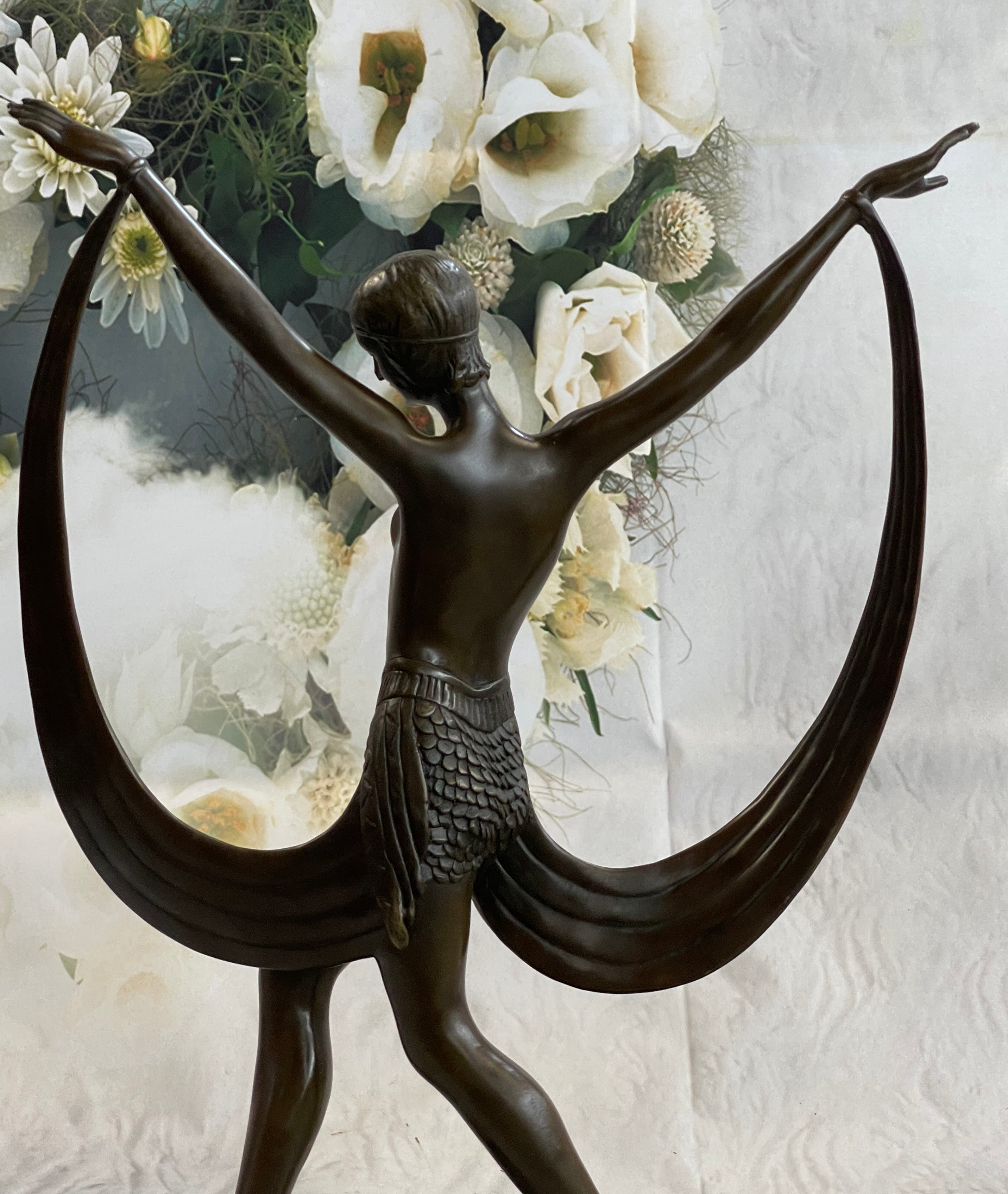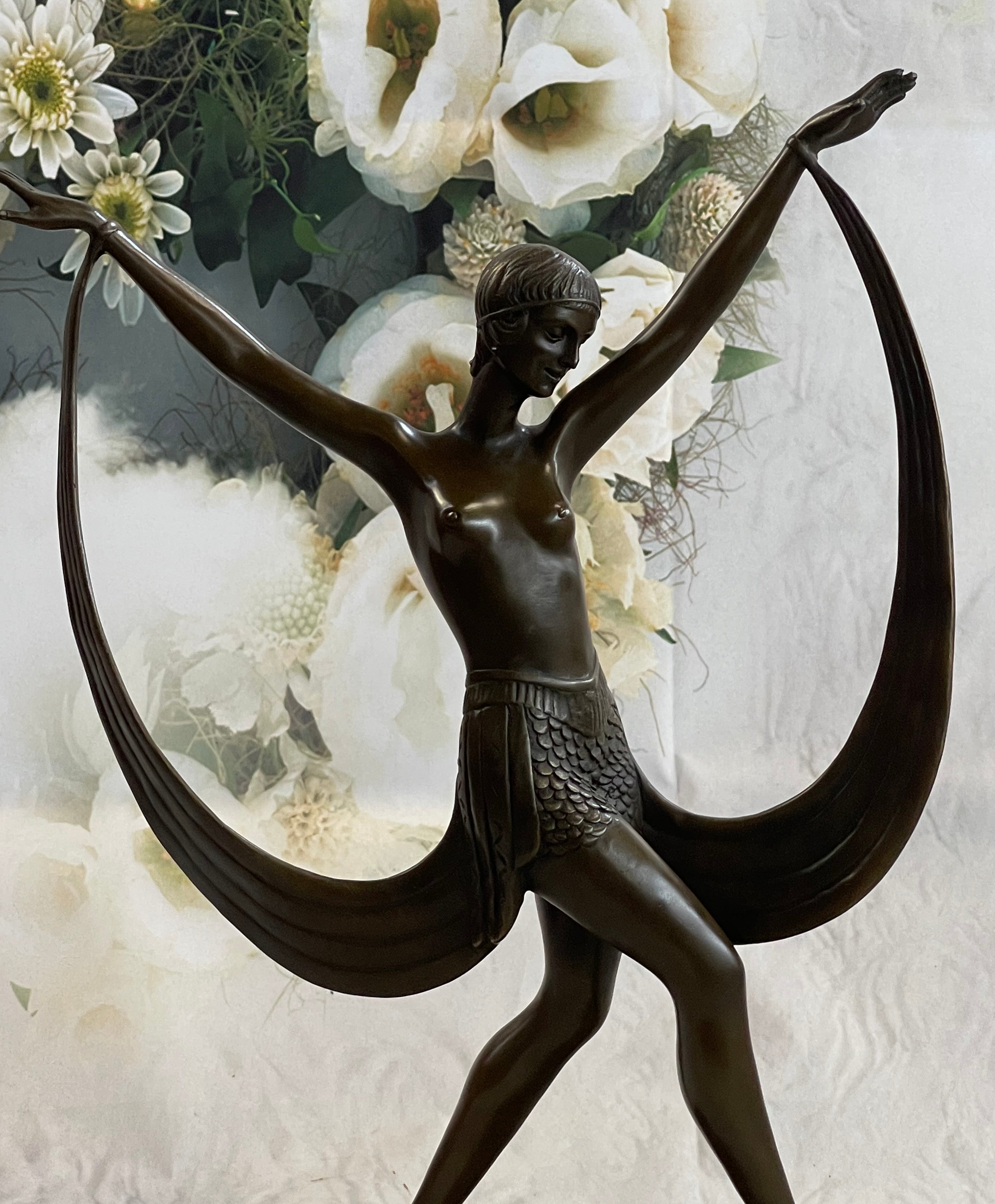 EXQUISITE FAYRAL ART DECO DANCER BRONZE MUSEUM QUALITY SCULPTURE . Beautiful elegant version of this Fayral artwork. It is truly elegant, the photo does not do it justice. This is an excellent Museum quality bronze work of art. This faithfully reproduction of distinguished highly regarded Fayral, prized for his well-known sensual works. Features a young sophisticated beauty poised in mid motion arms gently swaying and body raised on tip toes. A subtle gesture of refined movement and power. Beautifully mounted on a solid marble base. Would make a great gift for yourself or any person who appreciates an extraordinary work of art! Our version is particularly stunning, with a striking patina of bronze and copper tones, highlighted by a subtle gunmetal silverish finish on the Lady`s dress. We mount it onto a heavily-veined marble base, and it stands 15" tall. This artwork has incredible detail, workmanship and quality. This is a stunning piece with wonderful movement, elegance and grace. This has been painstaking cast in Bronze using the highest quality lost wax" casting method. This beautiful Bronze sculpture is mounted onto a solid marble base. Each line, curve and detail has been painstakingly reproduced to achieve this captivating artwork. This elegant striking piece would make a splendid impression and fantastic statement in any home or office. This is a truly rare and unique artwork that you can enjoy for years to come. A great work of art that you will cherish for a lifetime, a stunning piece at a very affordable price.    This attractive artwork would make a splendid impression and statement anywhere. Features incomparable lines on this art piece. This piece is in excellent NEW MINT CONDITION and is Highly desirable. This item is available for a limited time only so act now. Don`t miss your opportunity to own this wonderful piece. WE CARRY THE FINEST Art works in our inventory and is signed FAYRALBronze Dimensions with Marble Base:Height 15" x Width 10"