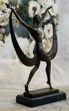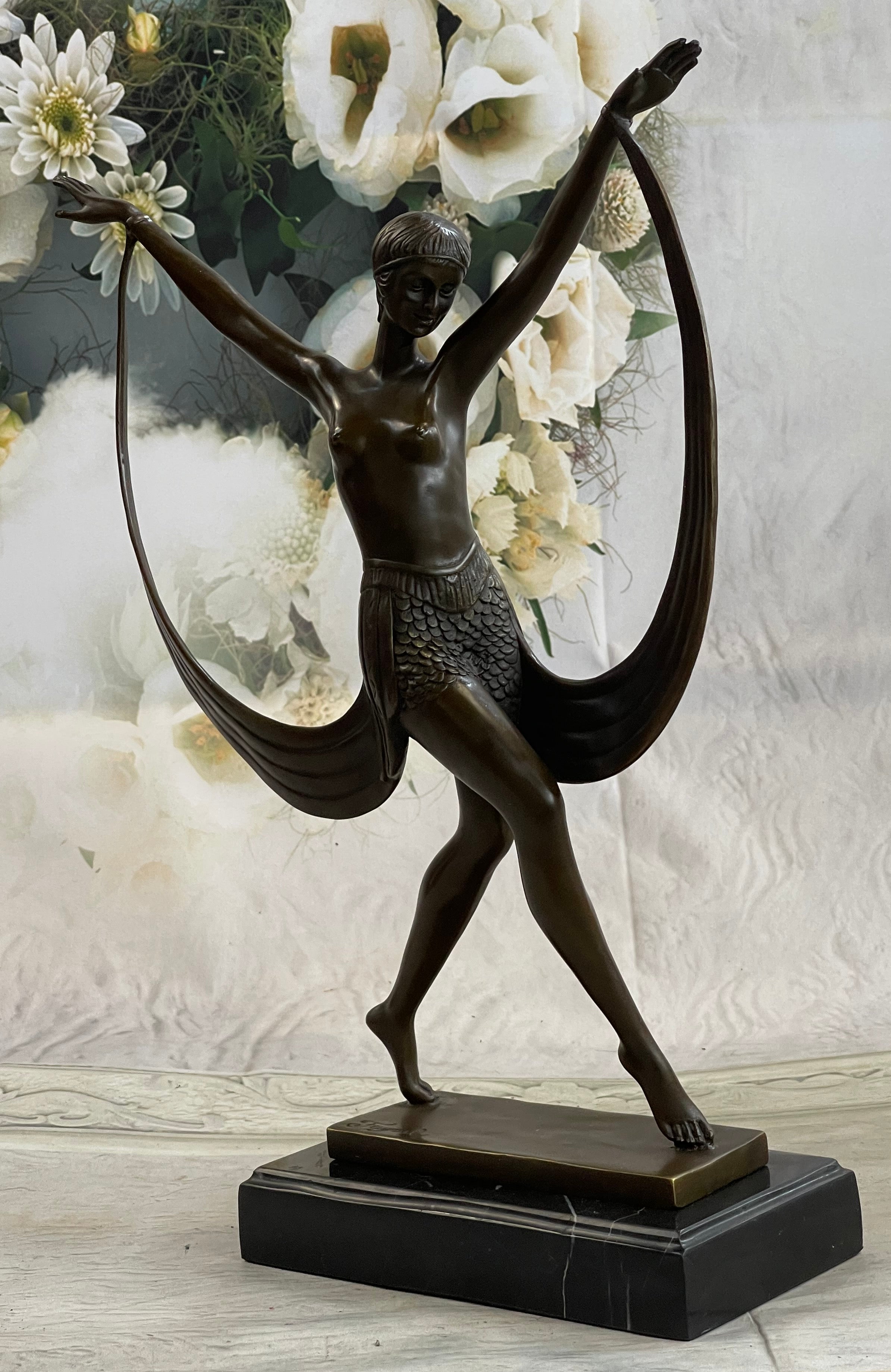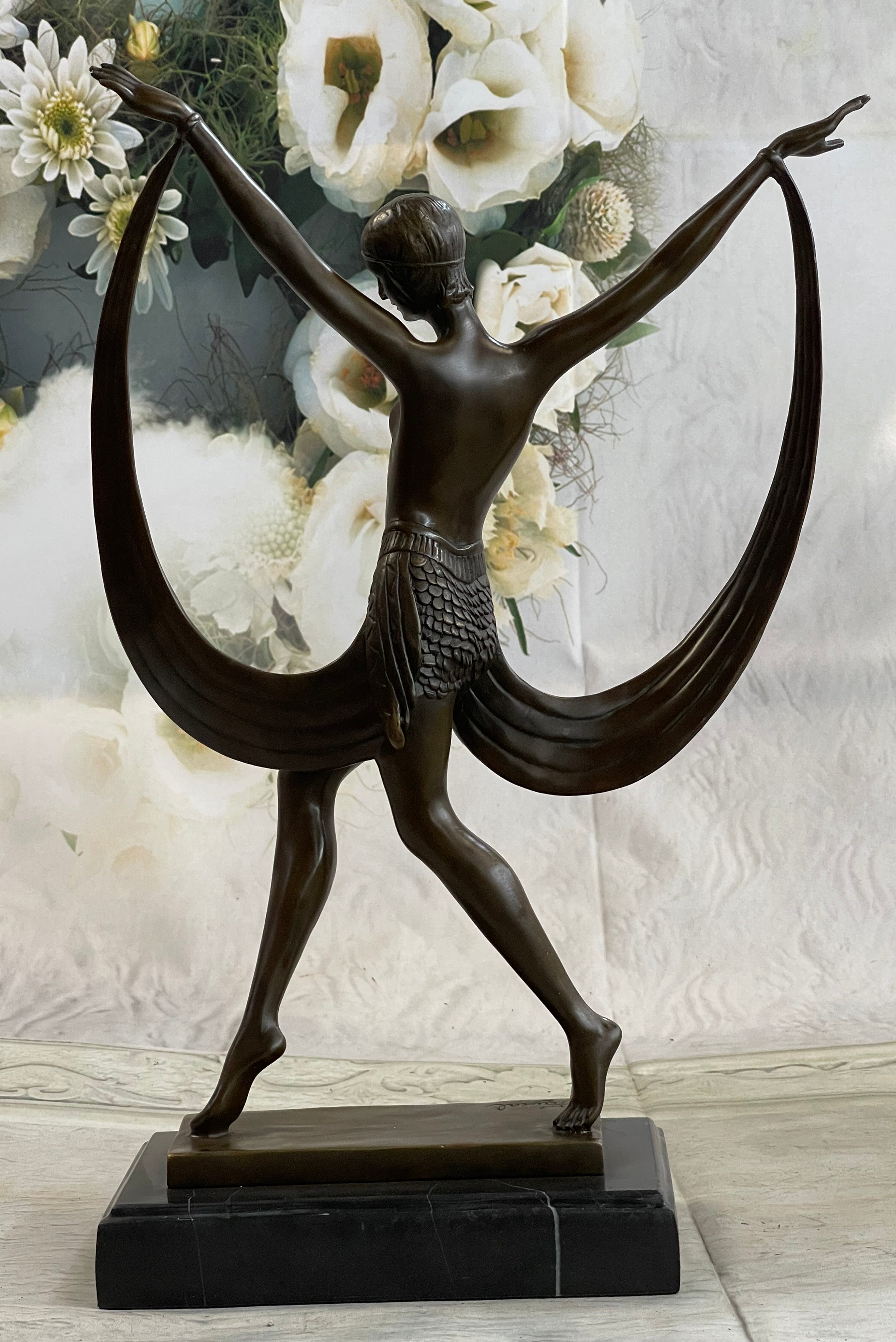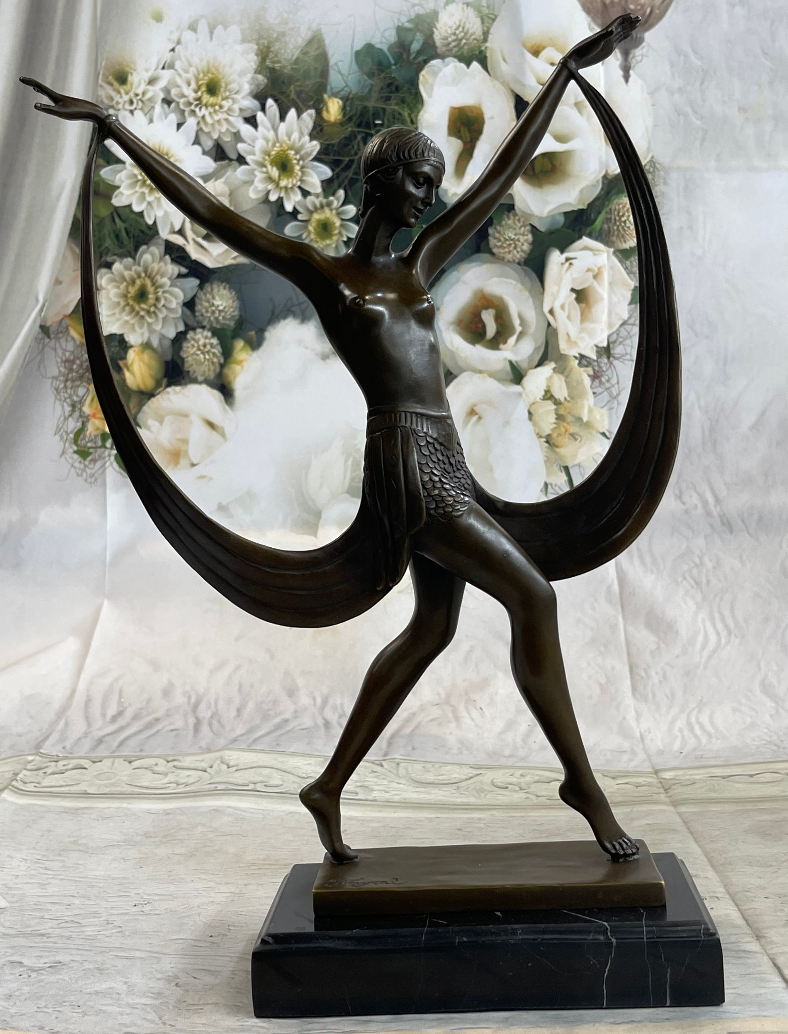 EXQUISITE FAYRAL ART DECO DANCER BRONZE MUSEUM QUALITY SCULPTURE . Beautiful elegant version of this Fayral artwork. It is truly elegant, the photo does not do it justice. This is an excellent Museum quality bronze work of art. This faithfully reproduction of distinguished highly regarded Fayral, prized for his well-known sensual works. Features a young sophisticated beauty poised in mid motion arms gently swaying and body raised on tip toes. A subtle gesture of refined movement and power. Beautifully mounted on a solid marble base. Would make a great gift for yourself or any person who appreciates an extraordinary work of art! Our version is particularly stunning, with a striking patina of bronze and copper tones, highlighted by a subtle gunmetal silverish finish on the Lady`s dress. We mount it onto a heavily-veined marble base, and it stands 15" tall. This artwork has incredible detail, workmanship and quality. This is a stunning piece with wonderful movement, elegance and grace. This has been painstaking cast in Bronze using the highest quality lost wax" casting method. This beautiful Bronze sculpture is mounted onto a solid marble base. Each line, curve and detail has been painstakingly reproduced to achieve this captivating artwork. This elegant striking piece would make a splendid impression and fantastic statement in any home or office. This is a truly rare and unique artwork that you can enjoy for years to come. A great work of art that you will cherish for a lifetime, a stunning piece at a very affordable price.    This attractive artwork would make a splendid impression and statement anywhere. Features incomparable lines on this art piece. This piece is in excellent NEW MINT CONDITION and is Highly desirable. This item is available for a limited time only so act now. Don`t miss your opportunity to own this wonderful piece. WE CARRY THE FINEST Art works in our inventory and is signed FAYRALBronze Dimensions with Marble Base:Height 15" x Width 10"