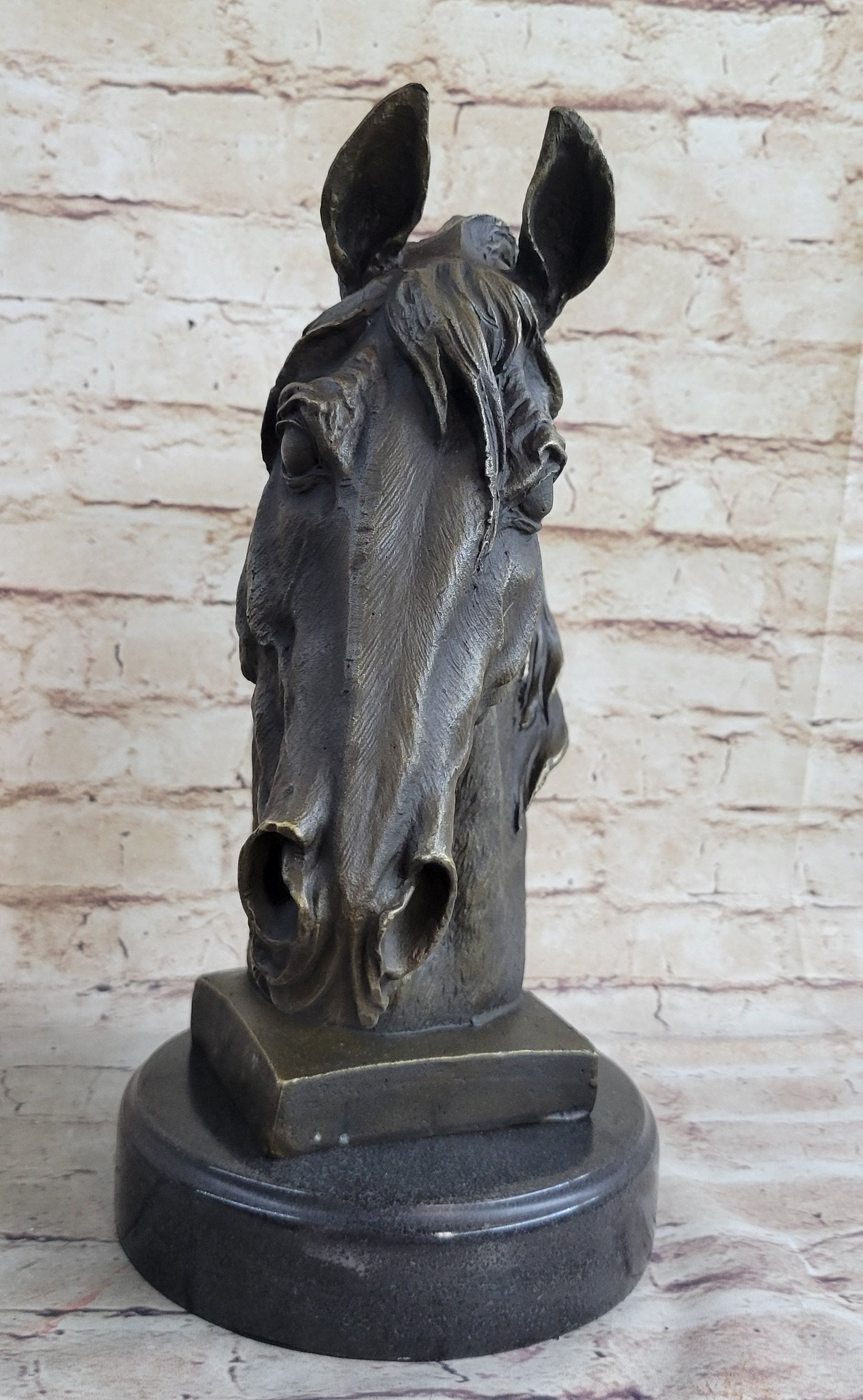 This bronze horse bust is more than just a decorative piece; it is a work of art that embodies the timeless beauty and majesty of equestrian subjects. The signature of the artist, Barye, adds to its authenticity and collectible value, making it a centerpiece for any art collection or a striking focal point in a room. Whether displayed on a mantelpiece, shelf, or table, this sculpture commands attention and admiration, celebrating the enduring bond between humans and horses.Bronze Dimensions with Marble Base: Height 12" X Width 10"