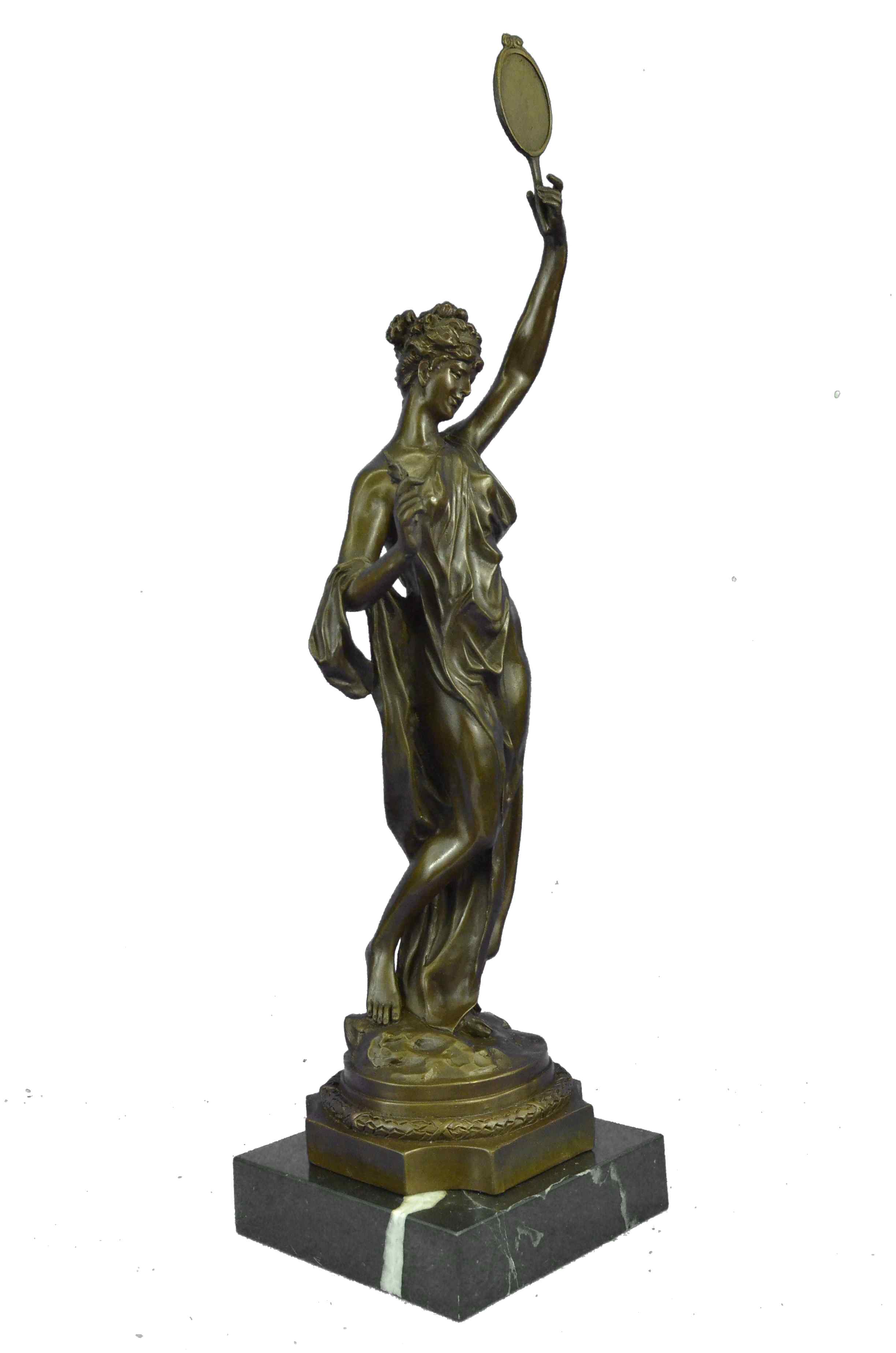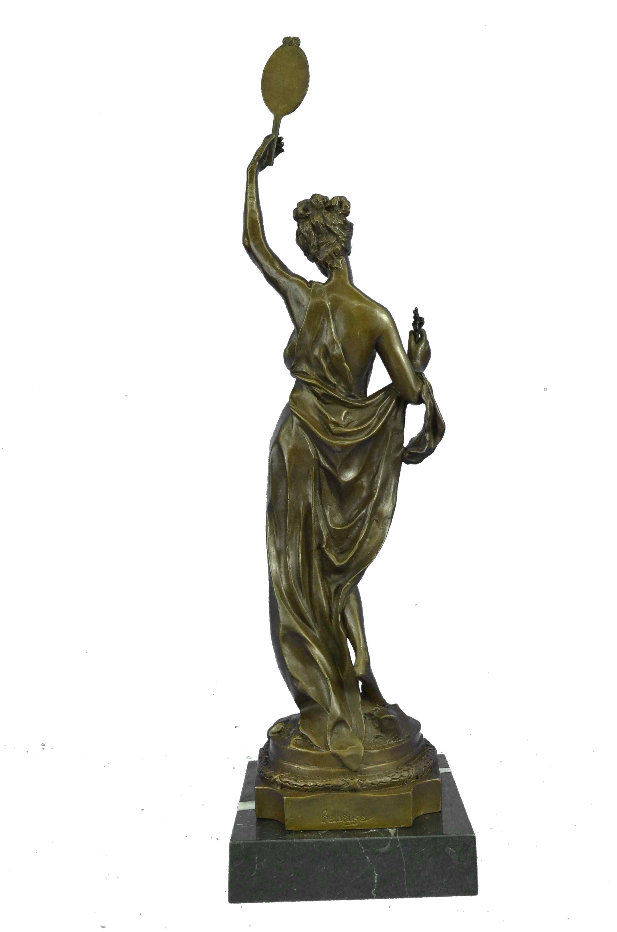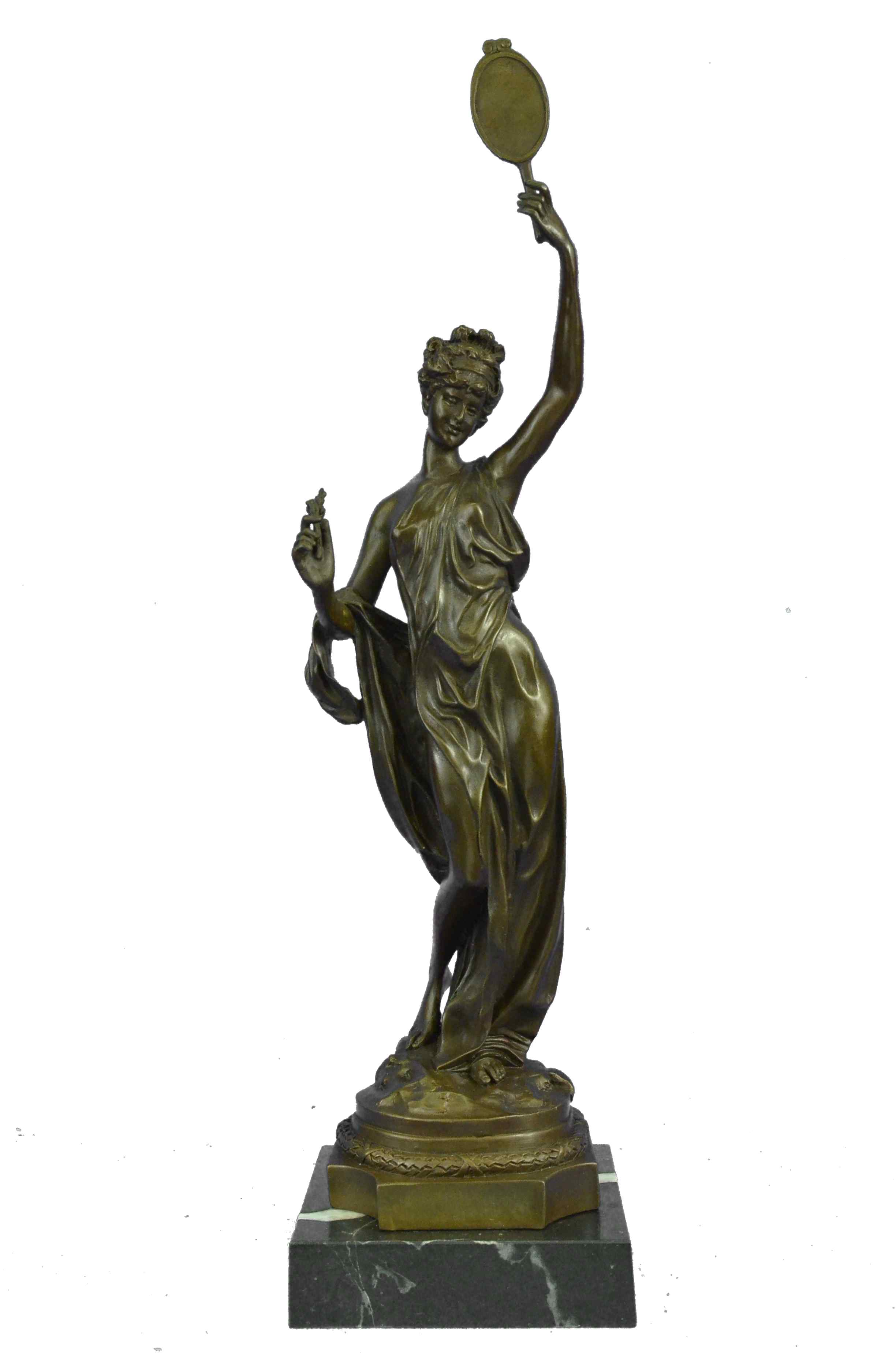 This sculpture is beautiful, would go perfect in Your or a Friends living room. She is wearing a robe dress that hangs real low to the floor and looks amazing on her body as it just lays on her frame. On one side she is completely covered and on the other side she lets the end rest on her right wrist, exposing some of her body. She gracefully smiles and look down at the floor, as her left arm is holding a gorgeous old fashion mirror. This sculpture is casted using the ancient old "Lost Wax Method" stained in brown patina. She is mounted atop a black marble base and is signed Carrier Belleuse.Original or Reproduction: Reproduction