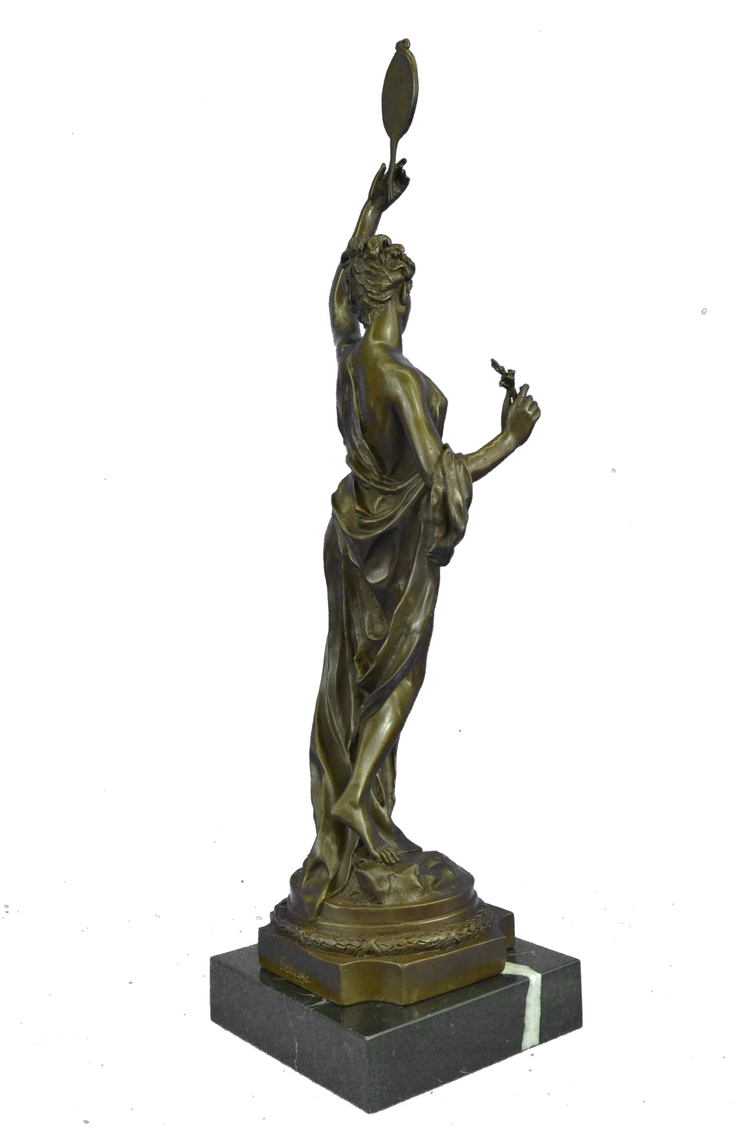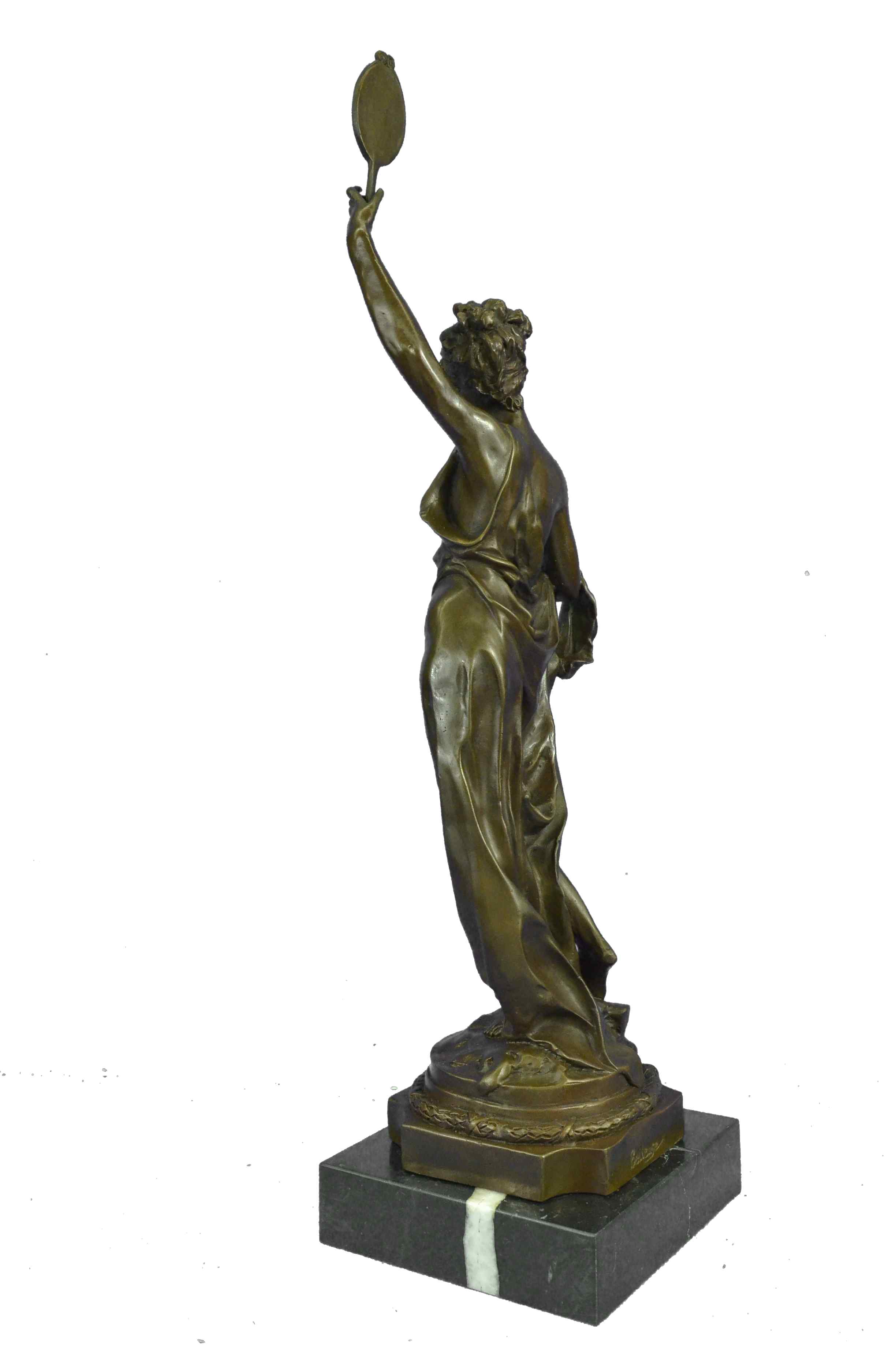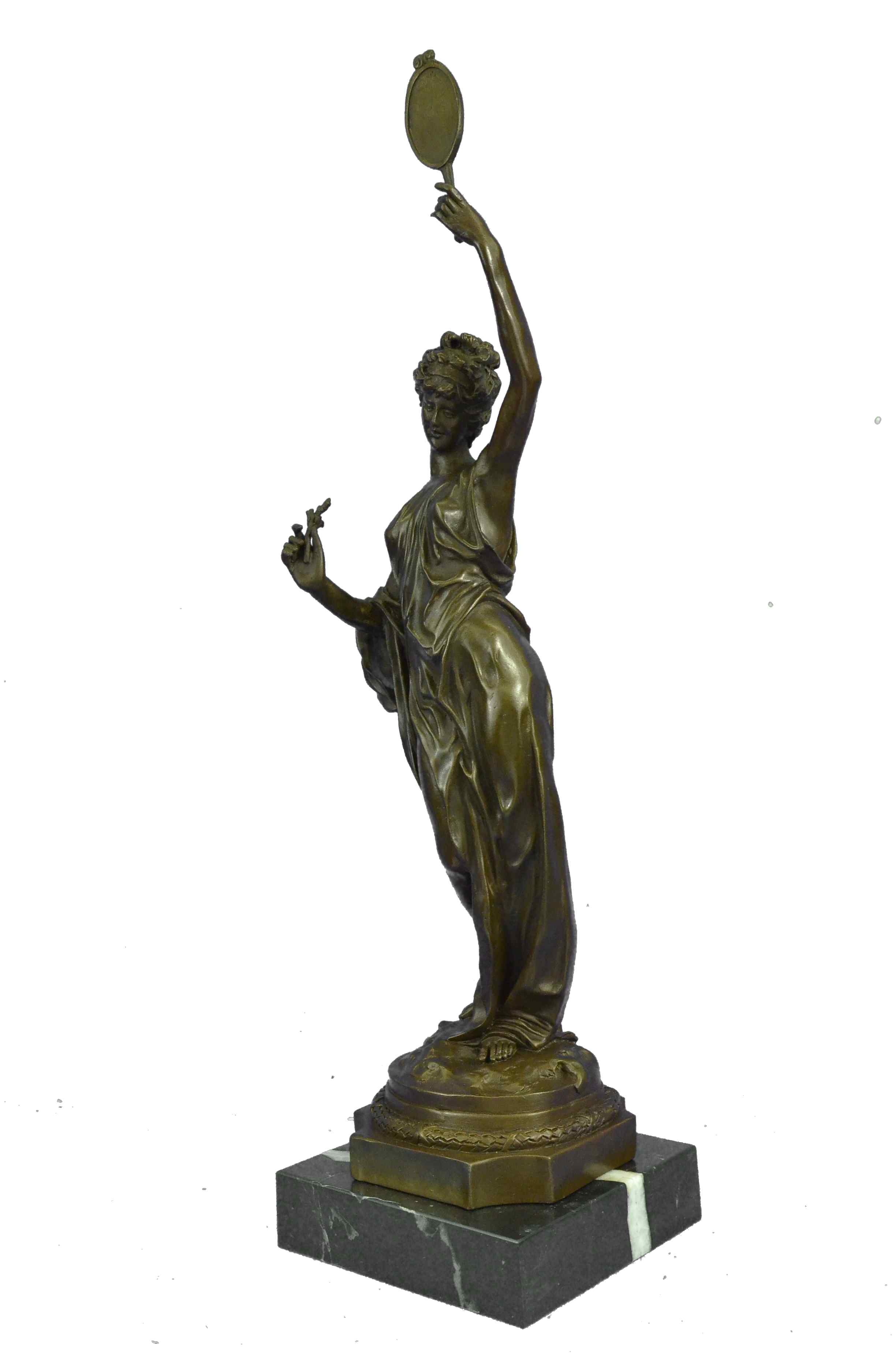 This sculpture is beautiful, would go perfect in Your or a Friends living room. She is wearing a robe dress that hangs real low to the floor and looks amazing on her body as it just lays on her frame. On one side she is completely covered and on the other side she lets the end rest on her right wrist, exposing some of her body. She gracefully smiles and look down at the floor, as her left arm is holding a gorgeous old fashion mirror. This sculpture is casted using the ancient old "Lost Wax Method" stained in brown patina. She is mounted atop a black marble base and is signed Carrier Belleuse.Original or Reproduction: Reproduction