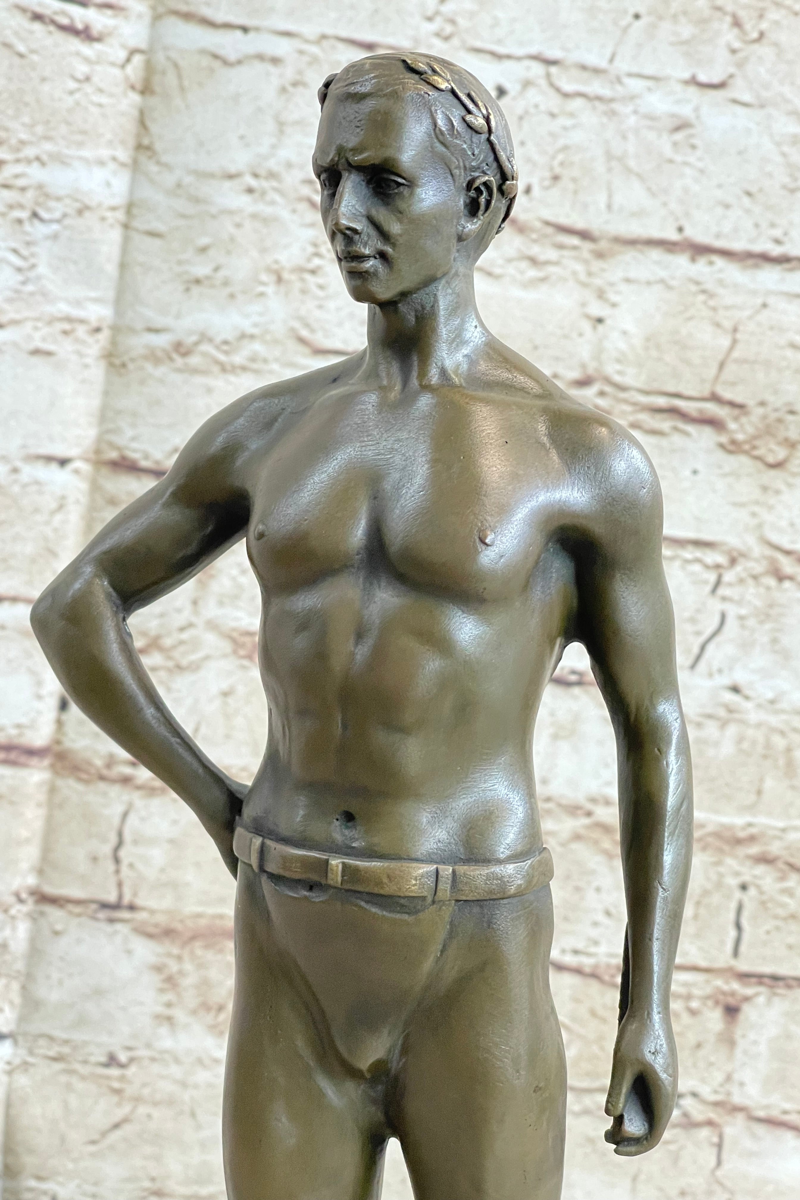 This striking bronze sculpture captures the essence of athleticism and strength, making it a captivating addition to any collection. The subject, with his well-defined muscles and poised stance, is a testament to physical prowess and readiness. His strong character is evident in his facial expression, suggesting a man of great determination and focus. Whether preparing for a game, sport, or an important task, his presence commands attention and respect, hinting that he may have been inspired by a historical or literary figure known for similar virtues.
