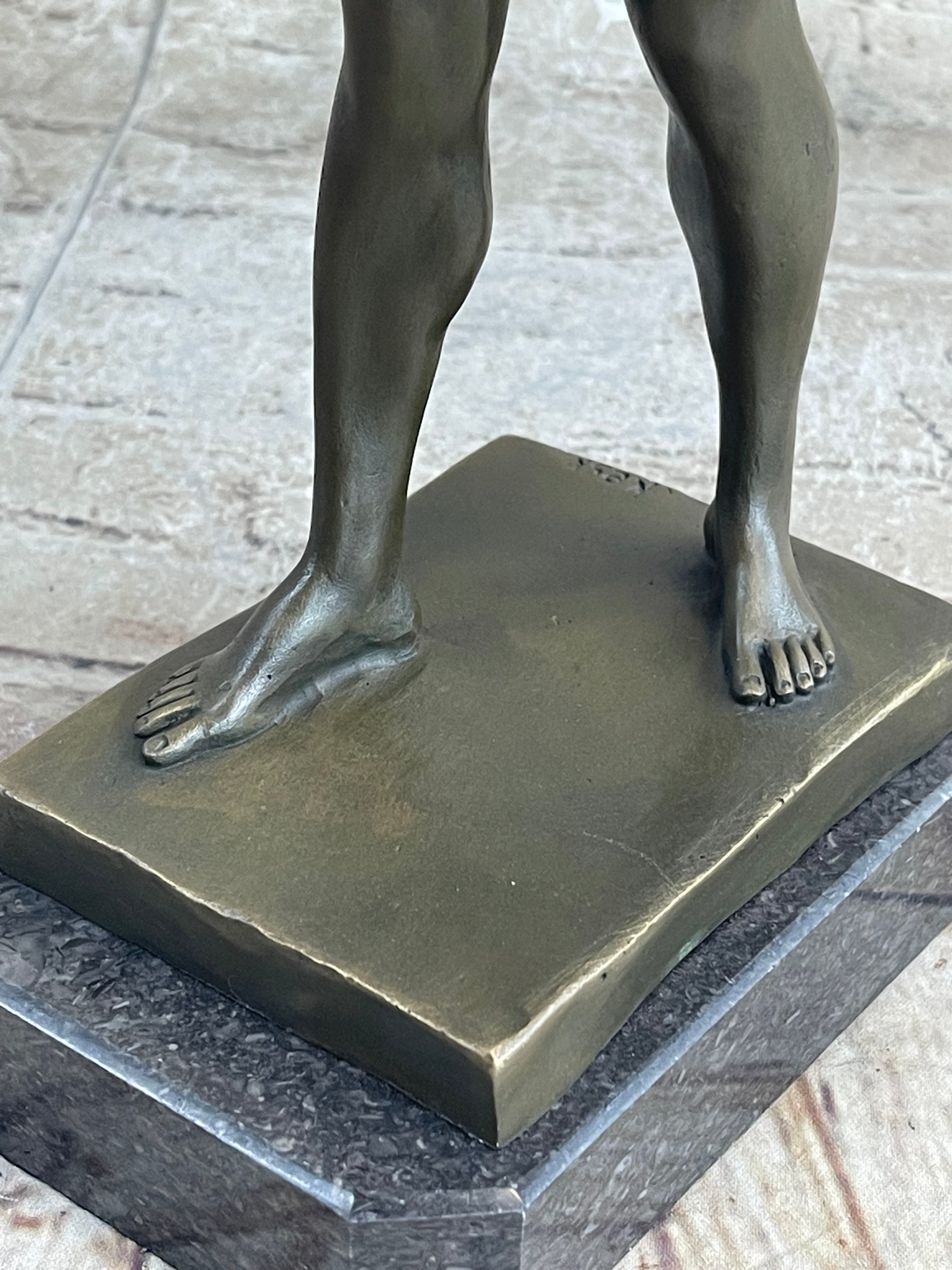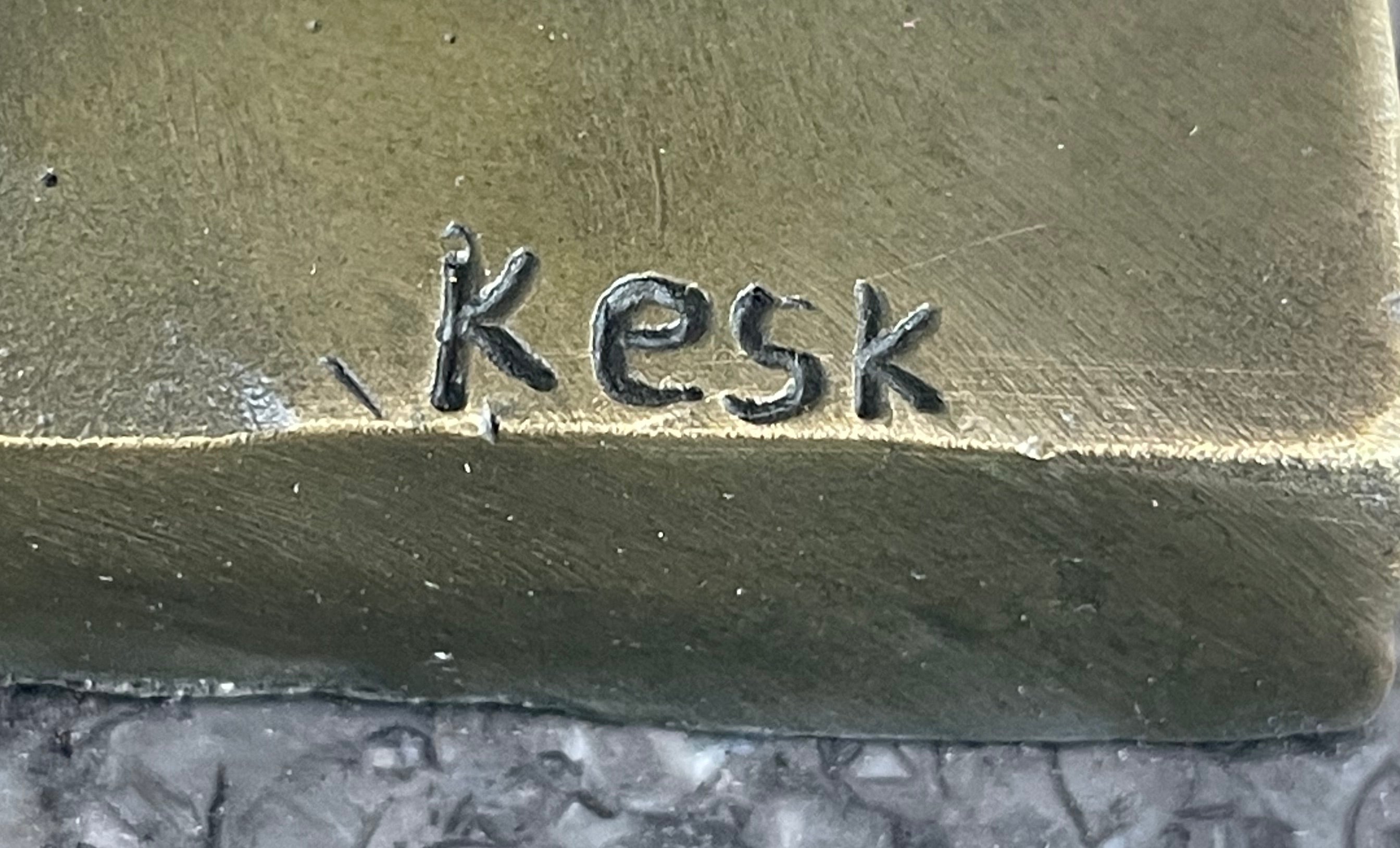 Mounted atop a sleek black marble base, this 100% handmade bronze sculpture is a symbol of both artistic skill and the timeless human spirit of perseverance and strength. Signed by the artist Kesk, it represents a unique fusion of classical technique and modern interpretation, making it an ideal piece for art enthusiasts, history buffs, or anyone who appreciates the portrayal of the human form in its most powerful and dynamic state.Bronze Dimensions with Marble Base: Height 15" X Width 6"