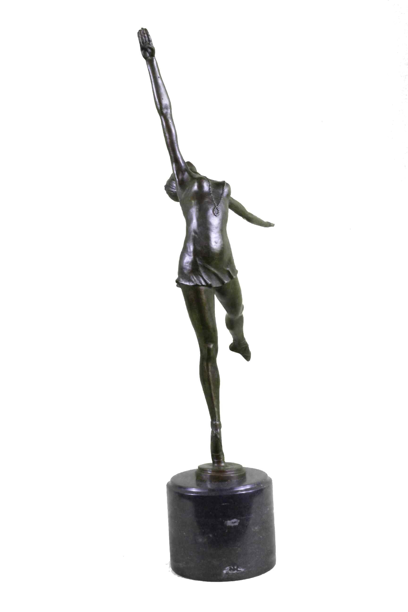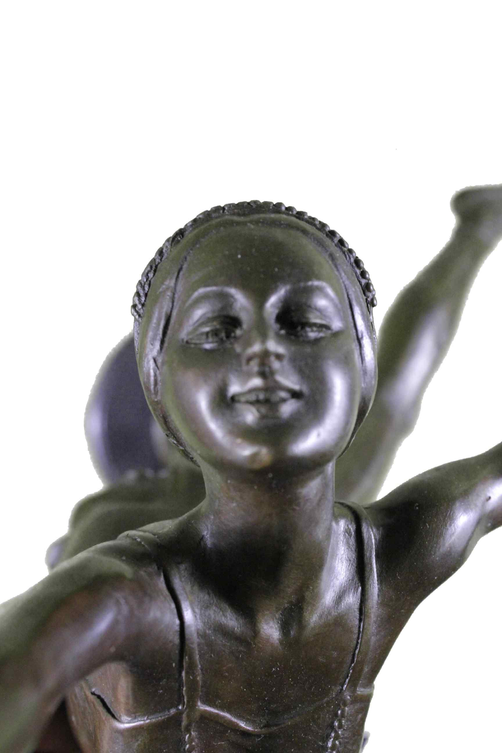 The beautiful young girl bounds and leaps through a meadow as moths and butterflies rush away from her fleeting feet. The whirling world about her, is received by her heart and returned back to everything through the motions of her gracefully hanging arms. The handmade bronze sculpture was molded using the ancient method of lost-wax casting and stained with a brown patina finish for preservation. It is mounted upon a variegated red Tennessee marble base with the European Bronze Finery stamp of quality and the artist B. Zach`s signature.Original or Reproduction: Reproduction