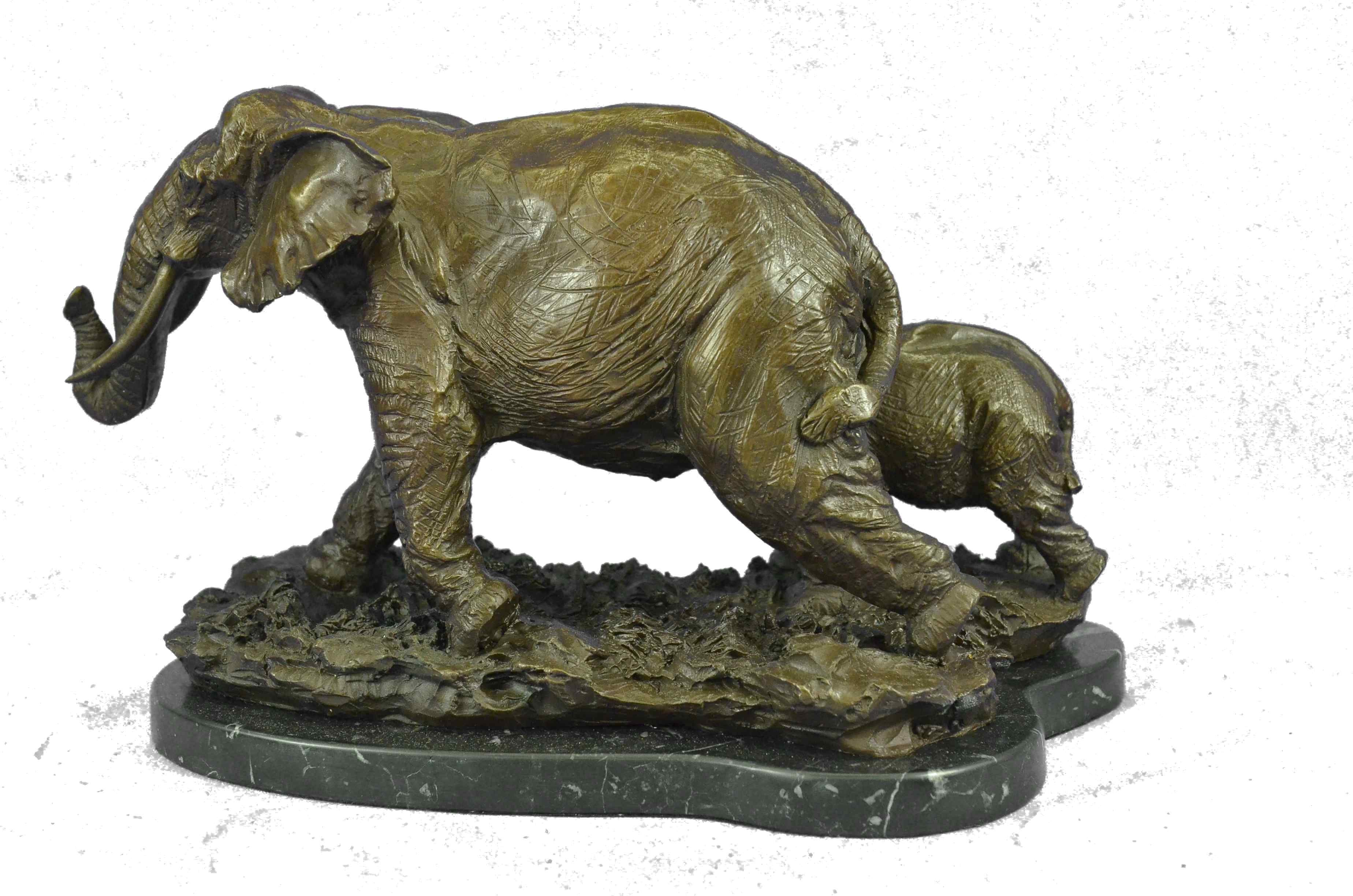 Mother and child as it is in the animal kingdom. The mother elephant walks beside her little elephant but a bit ahead for protection. The two animals walking in sync is such a pleasant and happy moment. These wondrous animals will surely delight your home. The piece is set on a black marble base. It is signed Bugatti. The lost wax method was used to craft this piece and allowed for the detail present throughout the entire sculpture.Original or Reproduction: Reproduction