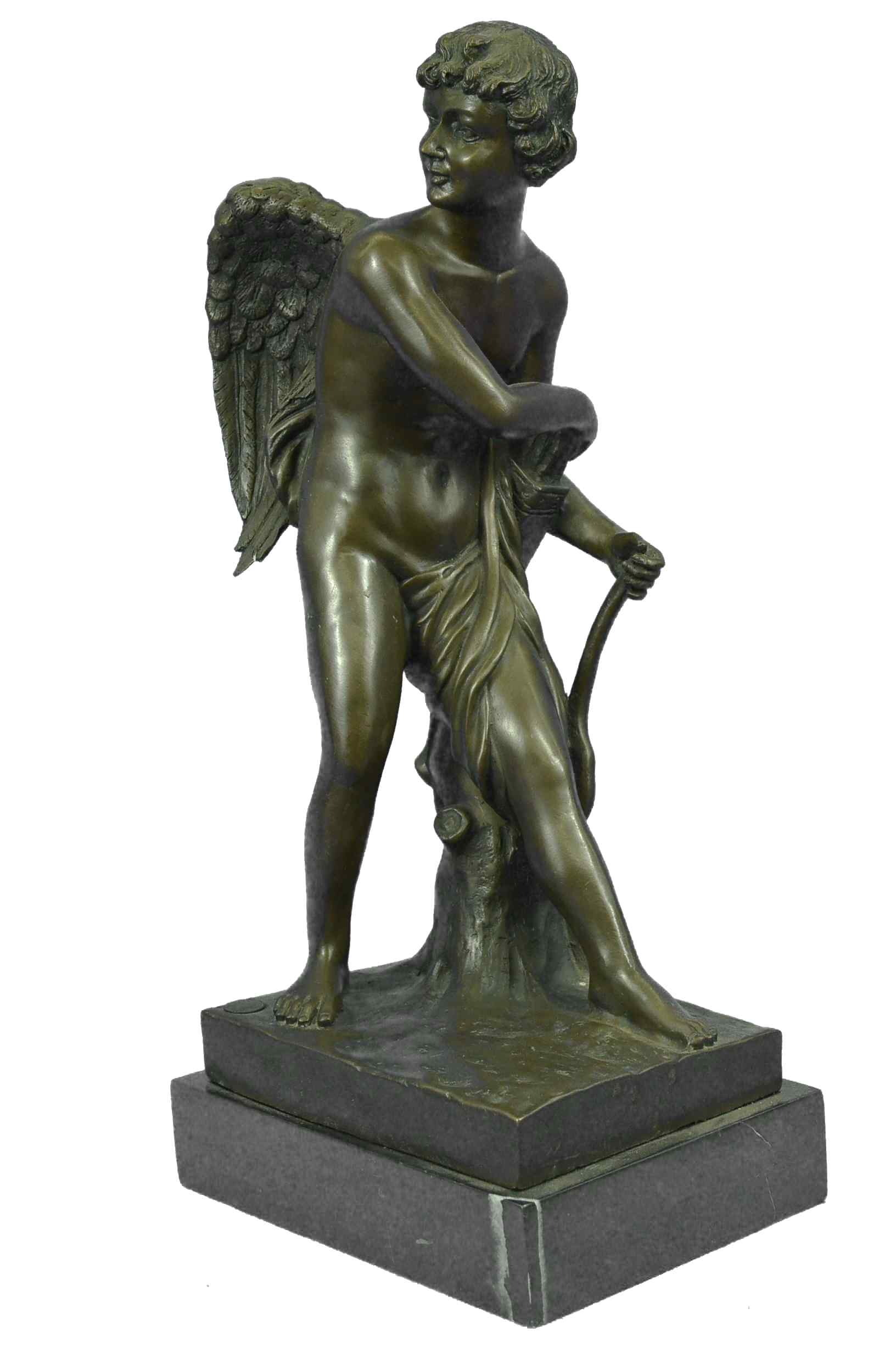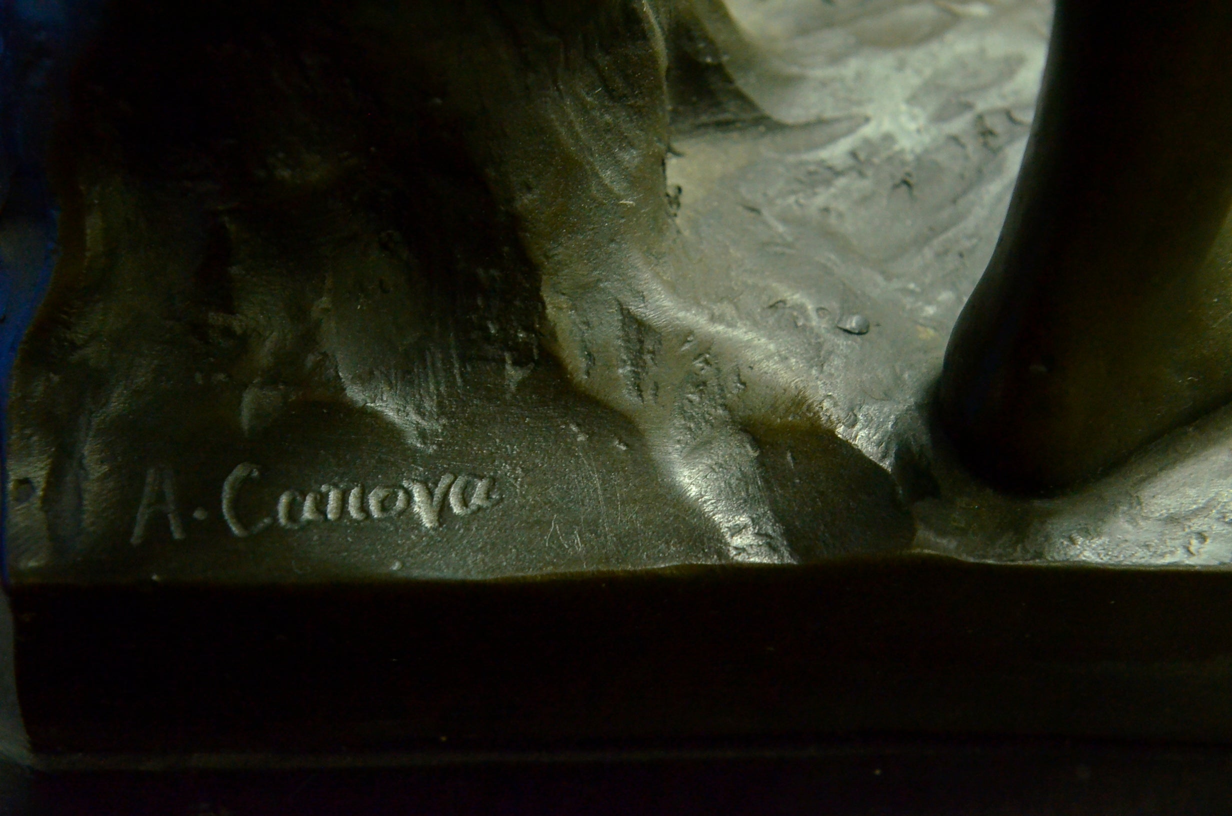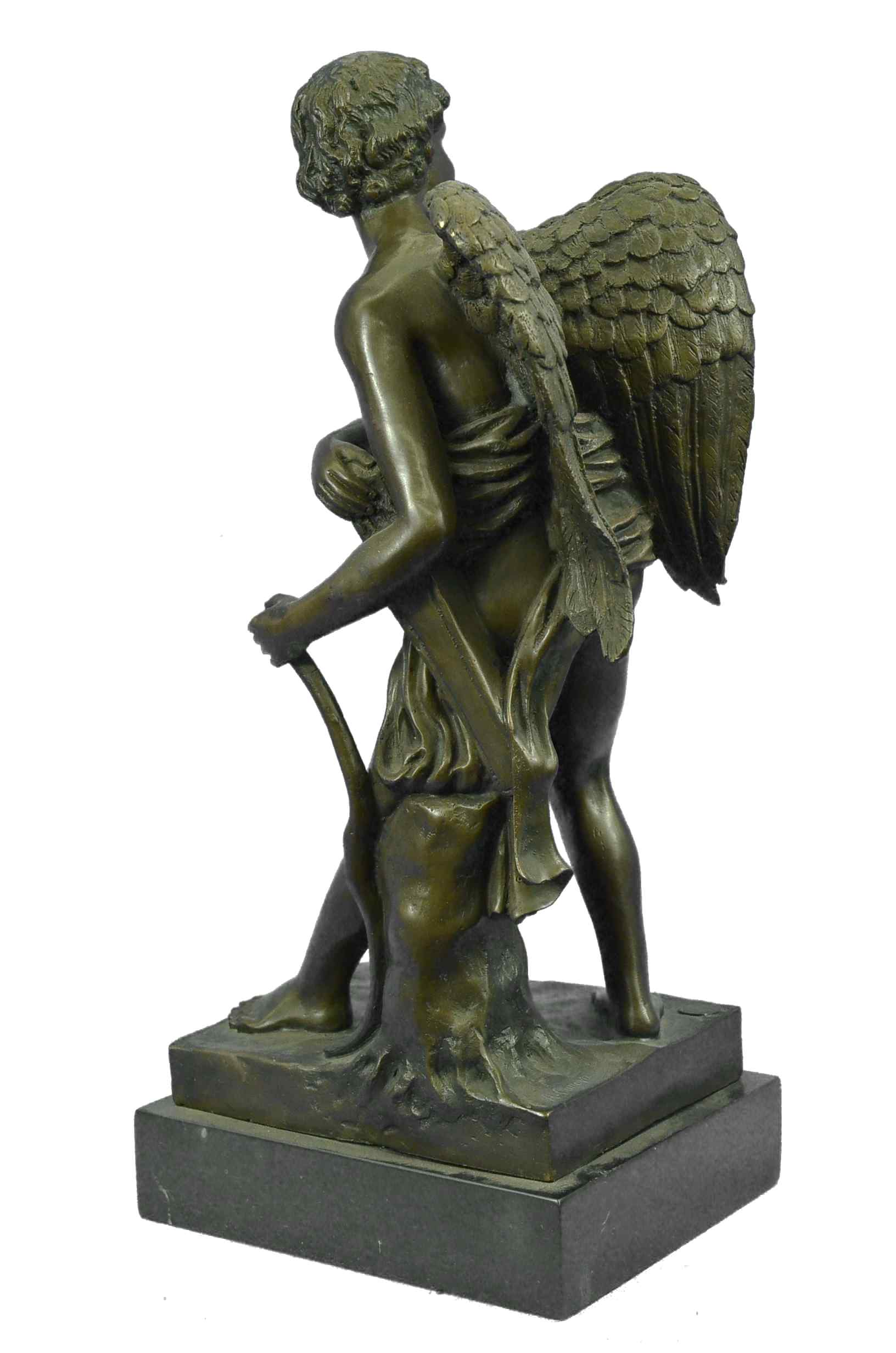 In legendary mythology Cupid-also known as Eros, is the god of love, desire and affection. He is the son of goddess Venus and god Mars. He is always associated with carrying a bow and arrow handy when frolicking through the open skies. Those that are pierced by his arrow are quickly inspired to fall in love with the first person that crosses their longing gaze. In pop culture he is frequently portrayed as a chubby cute mischievous cherub who draws back his bow with reckless abandon . He is frequently blamed for misguided love and relationships. This sculpture depicts Cupid all grown up and in the midst of stalking his love target. He reaches to his satchel of bows, which is slung to his side. He leans on his bow that he clutches to beside him. His face is mischievous and sly. His target won`t know what hit him. His young body is muscular and his nude demeanor showcases it. 100% bronze and handmade, this brown patina sculpture was cast using the "Lost Wax Method" and mounted on a black marble base and is signed A. Canova.Original or Reproduction: Reproduction