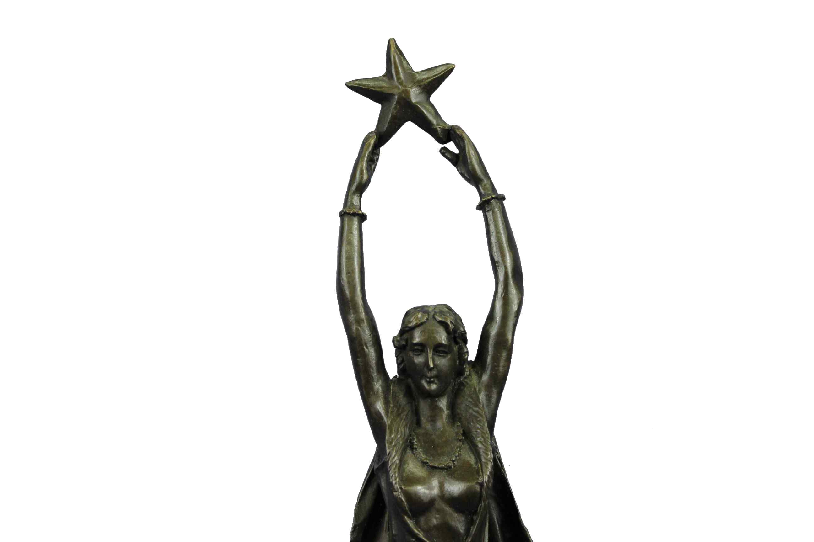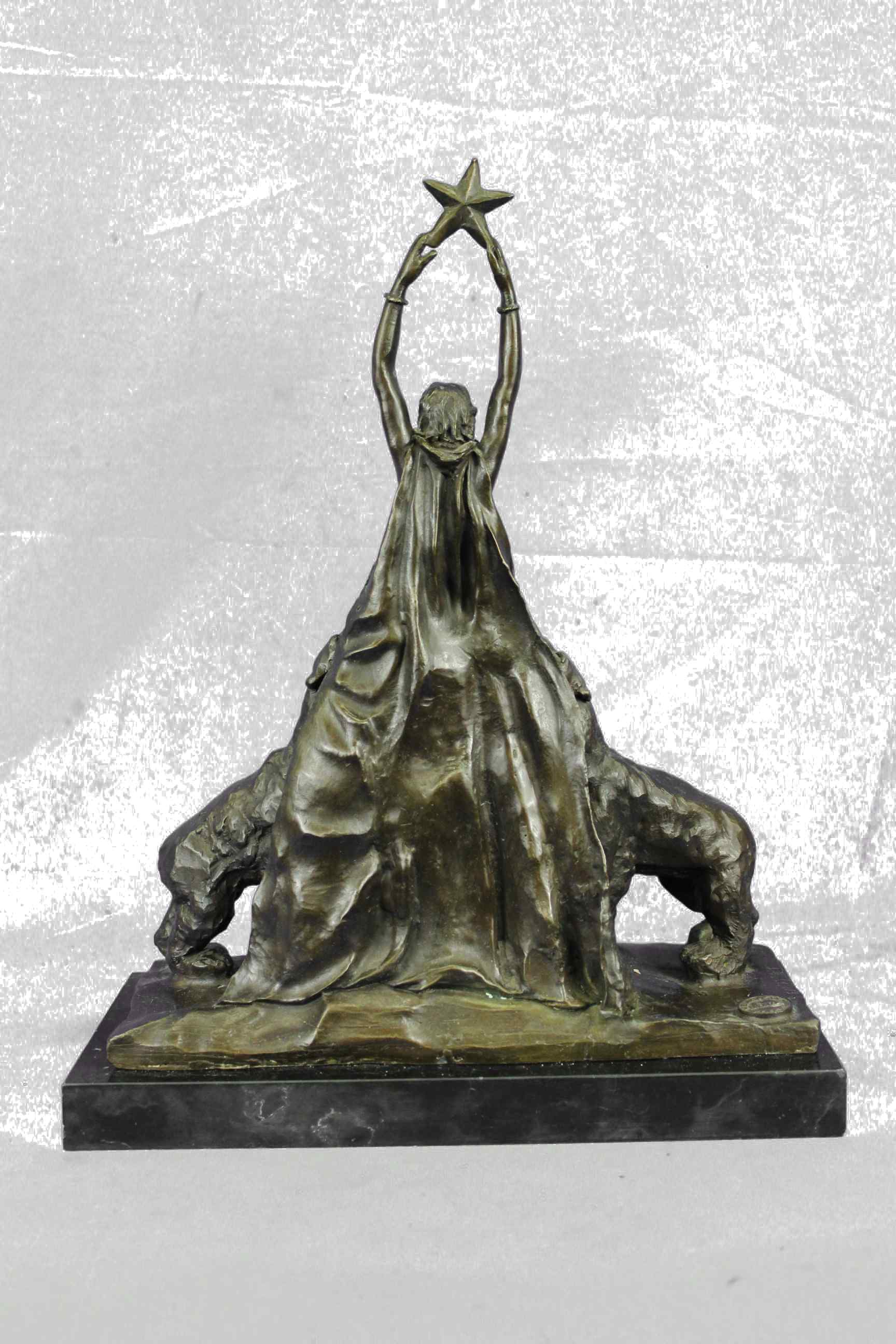 This sculpture of a woman holding a five point star above her head with both hands while two big bears howls beside her is amazing. She is wearing this very long gown that falls down to her ankles and its fitted tight to her beautiful frame that some how you can still notice. She is not remarkably scared in any shape or form of the two big bears next to her. She looks straight ahead. The sculpture is casted using the ancient old "Lost Wax Method" stained in brown patina. Mounted atop a gorgeous black marble base and signed by Ernst Seger.Original or Reproduction: Reproduction