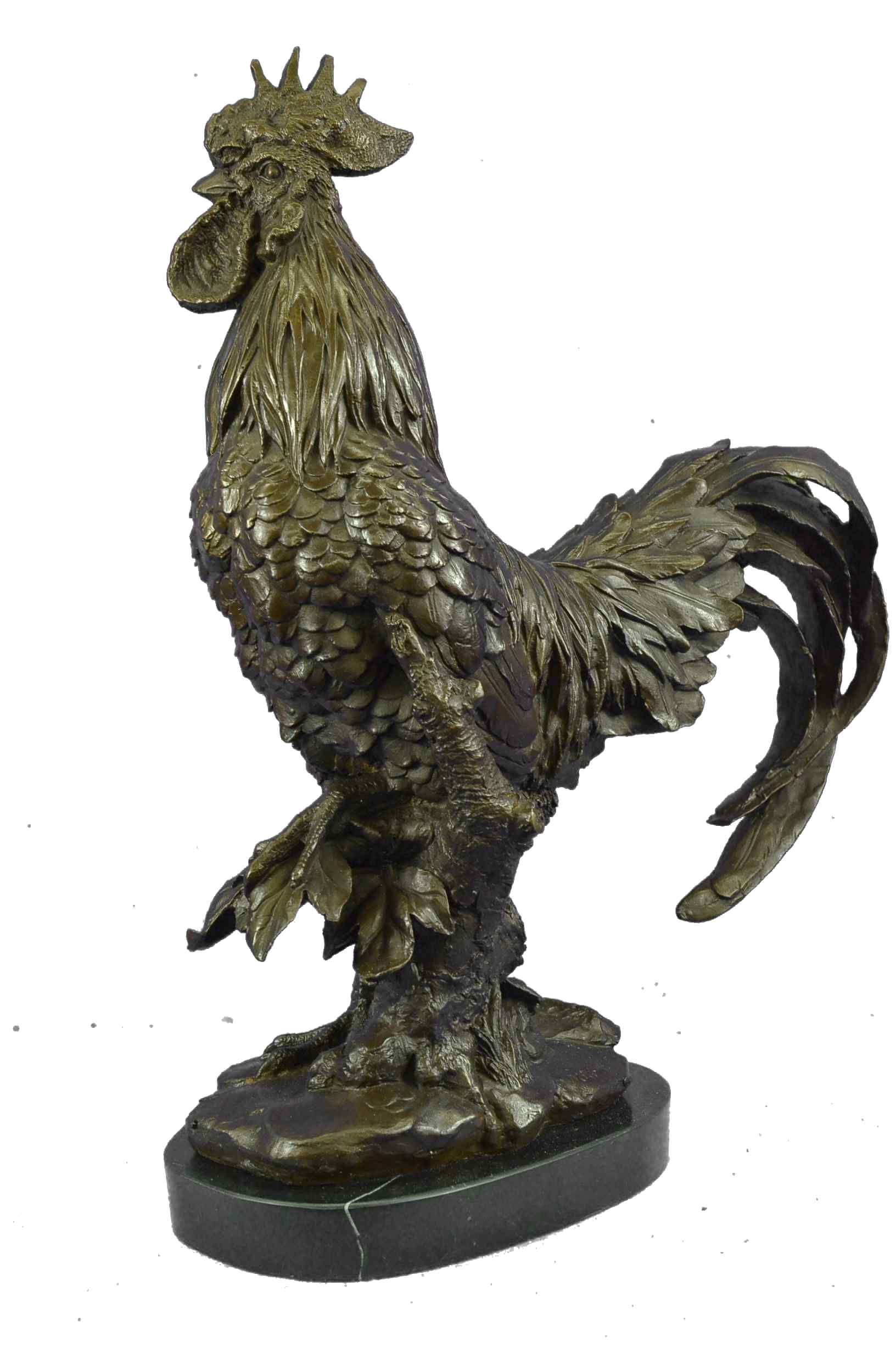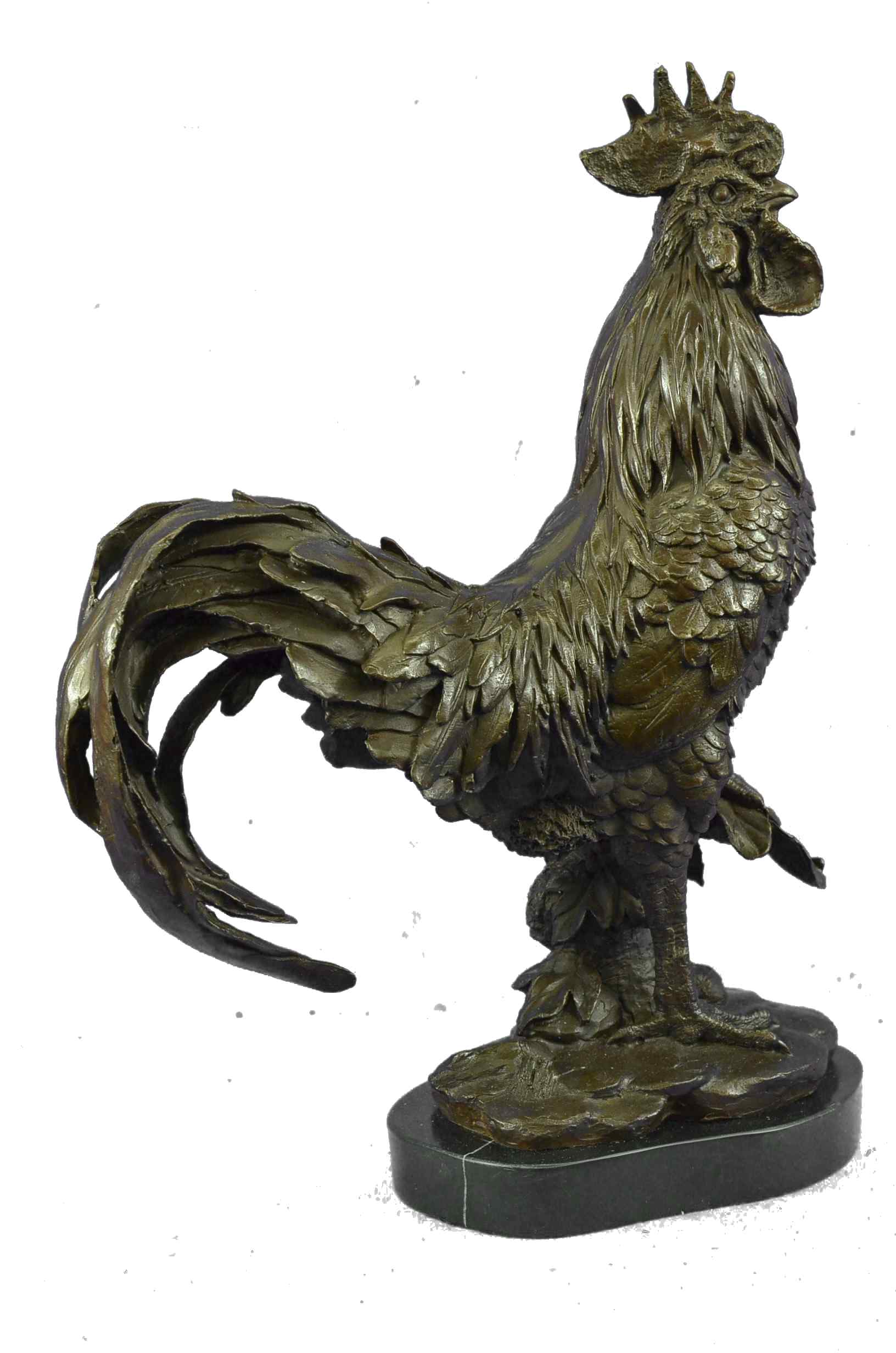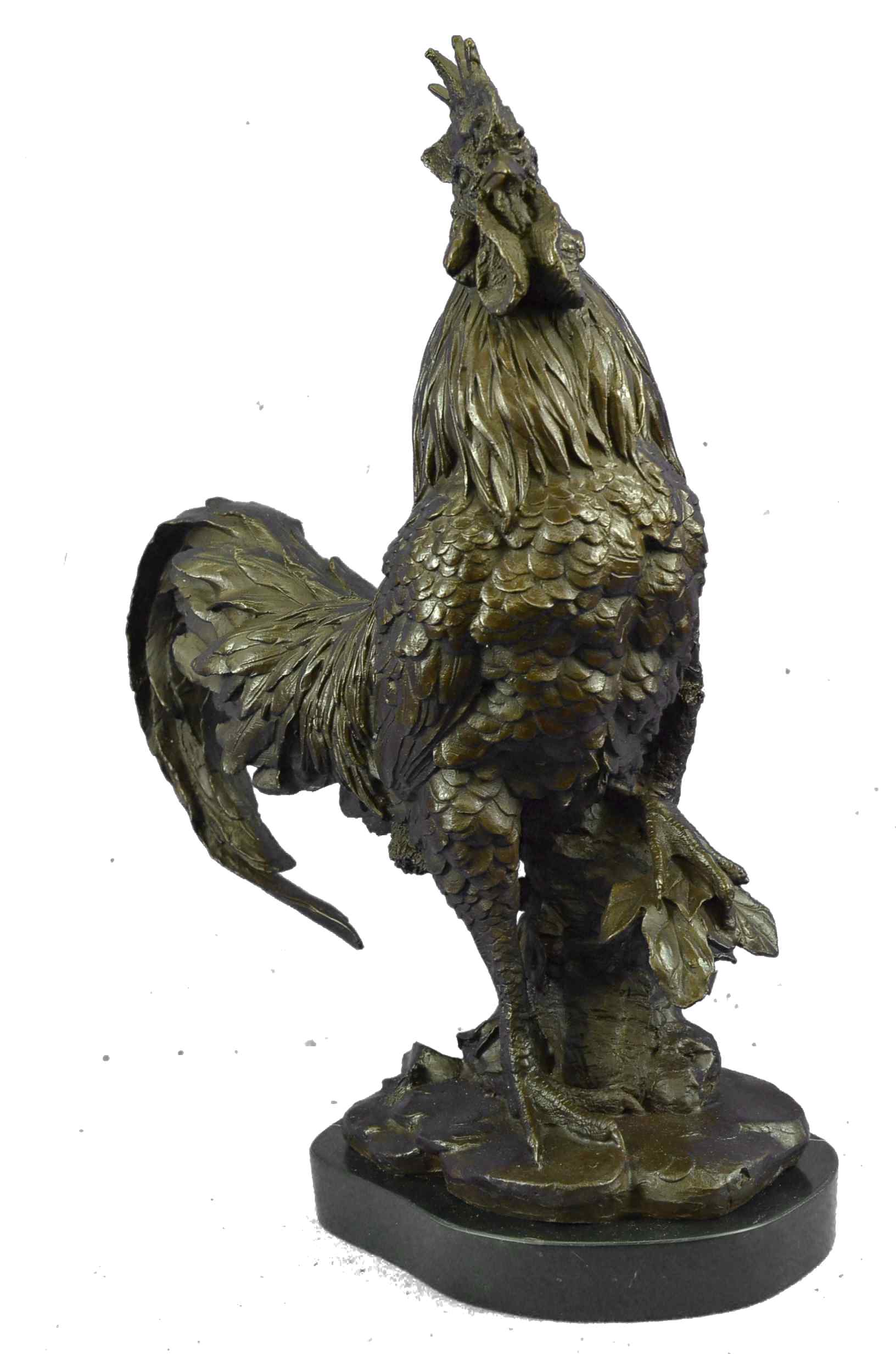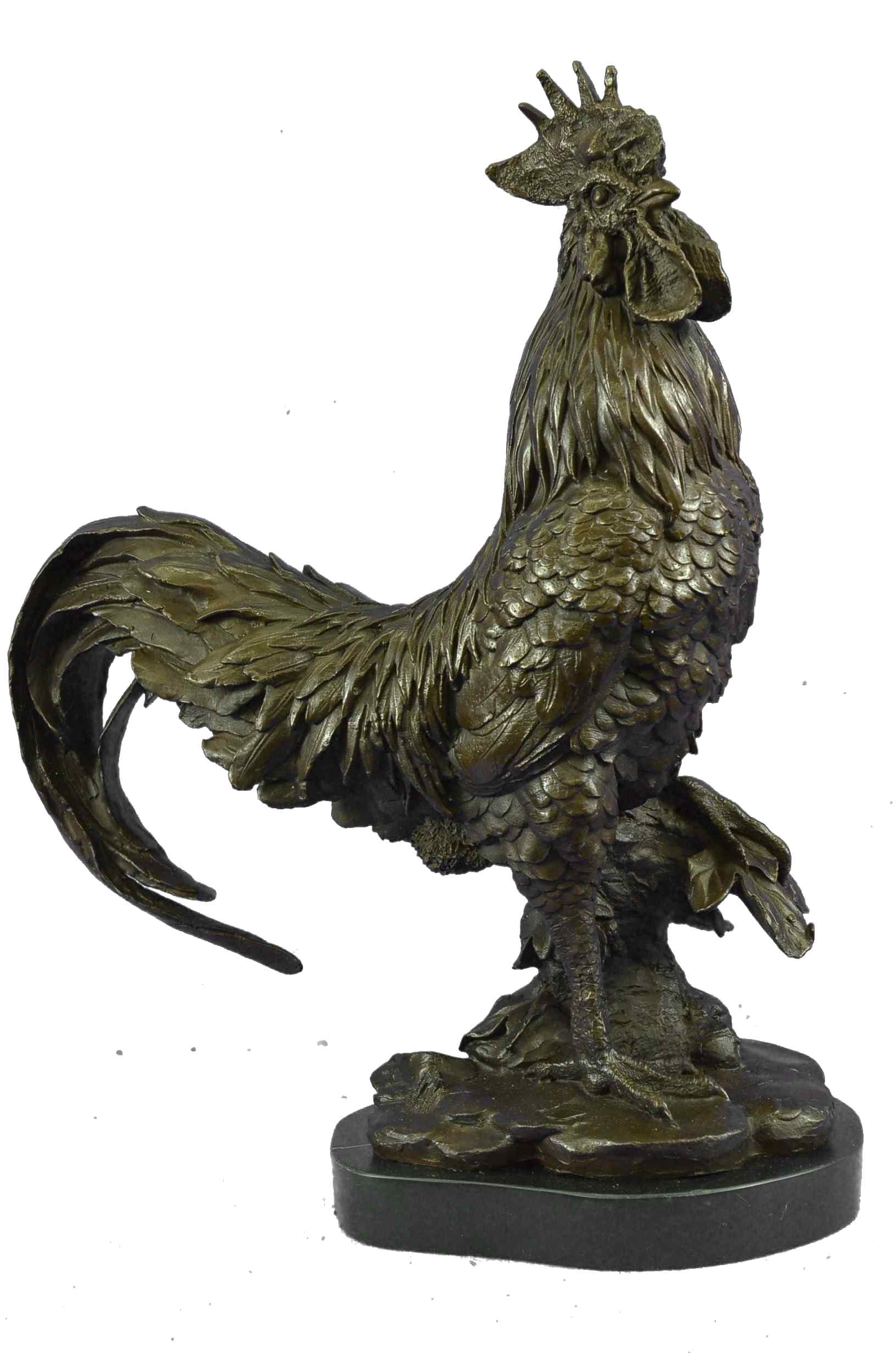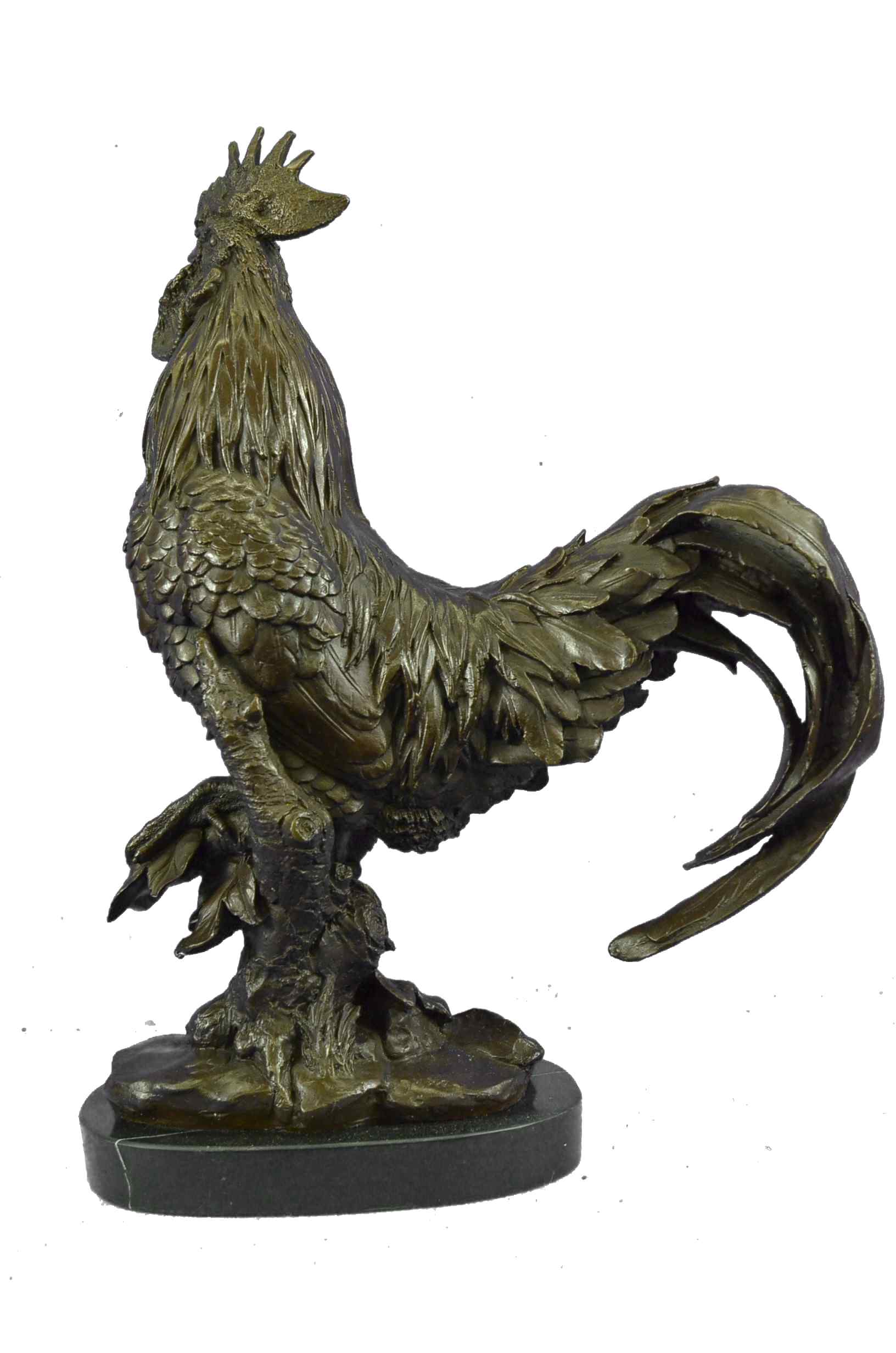 The rooster, in it`s exquisite feathered and colored costume, walks while crowing the early alarm of the break of dawn. He looks out defiantly at the viewer from under the wattles crowning his head. The ancient Greeks believed the Rooster rose to attention and saluted the sun every morning with a hearty cry, symbolizing victory over night. The bronze sculpture was produced using the lost-wax technique allowing the artist to create beautiful and realistic details in his plumage. It is coated in a brown patina finish for preservation and mounted upon a black marble base with the European Bronze Finery stamp of quality and the artist Milo`s signature. The Art of Lost WaxOriginal or Reproduction: Reproduction