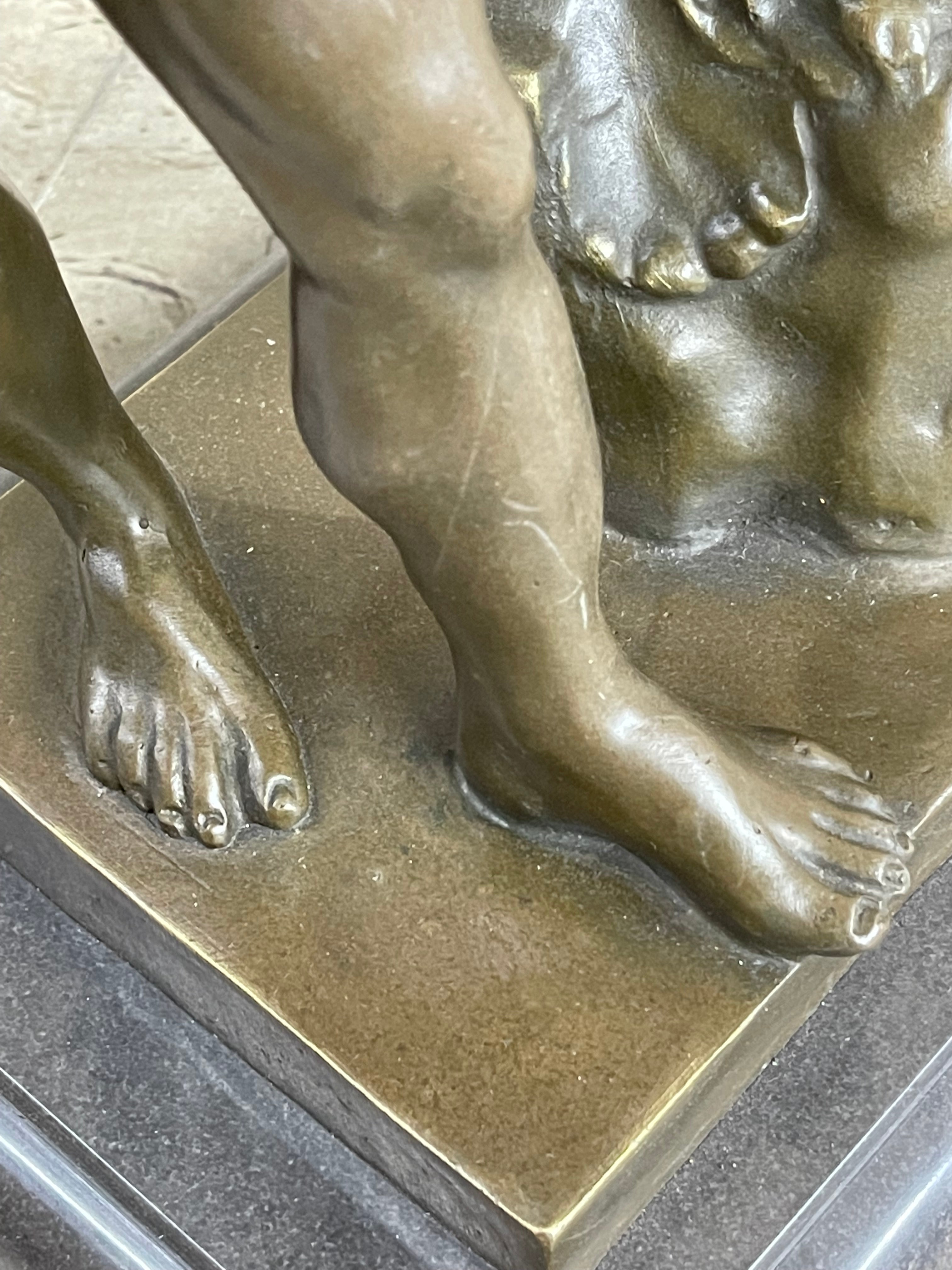 Crafted with the utmost precision and artistry, this sculpture stands as a testament to the skill of the artist Glycon. Using the ancient lost-wax method, the sculpture captures both the physical prowess of the man and the emotional depth of his experience. It rests gracefully on a black marble base, providing a sense of stability and permanence. Whether displayed in a home or office, "The Injured Athlete" is not just a work of art but a thought-provoking symbol of the resilience of the human spirit.Bronze Dimensions with Marble Base: Height 18.5" X Width 9 1/2"