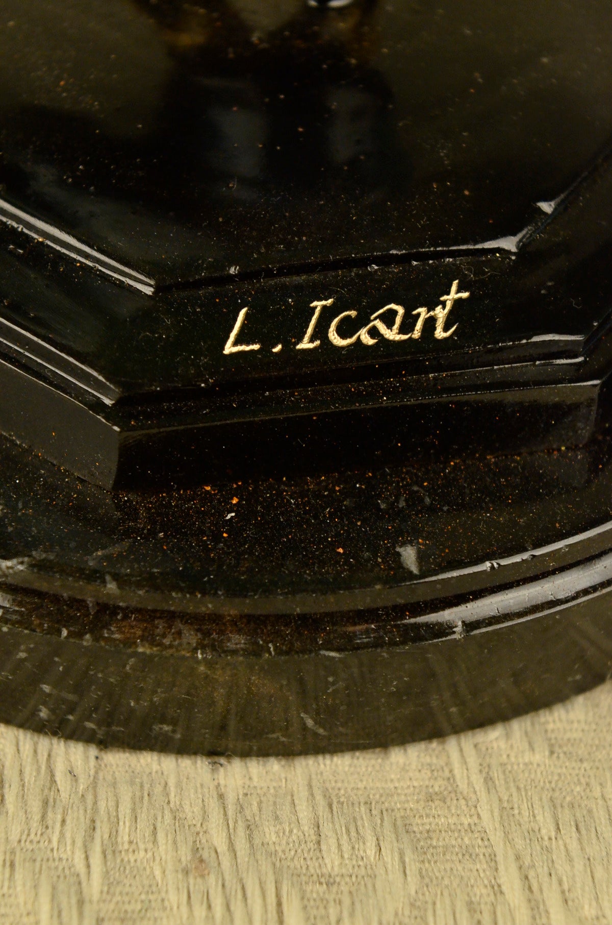 Inventory : 29-57959NA11592 A fine Japanese bronze sculpture of a young girl dressed in a fan-embroidered kimono, Tokyo School, Meiji style.This sensitive sculpture is particularly lifelike and captivating, as evidenced by the young girl’s sweetly innocent expression with upward gazing eyes. Beautiful details include her long kimono bordered by “embroidered” hat, her tasseled bodice, and her flowing hair bow which softly pulls her hair back. This sculpture is signed L. Icart in wonderful condition with a beautiful Colorful patina, with stand on a black marble base. The Art of Lost WaxOriginal or Reproduction: Reproduction