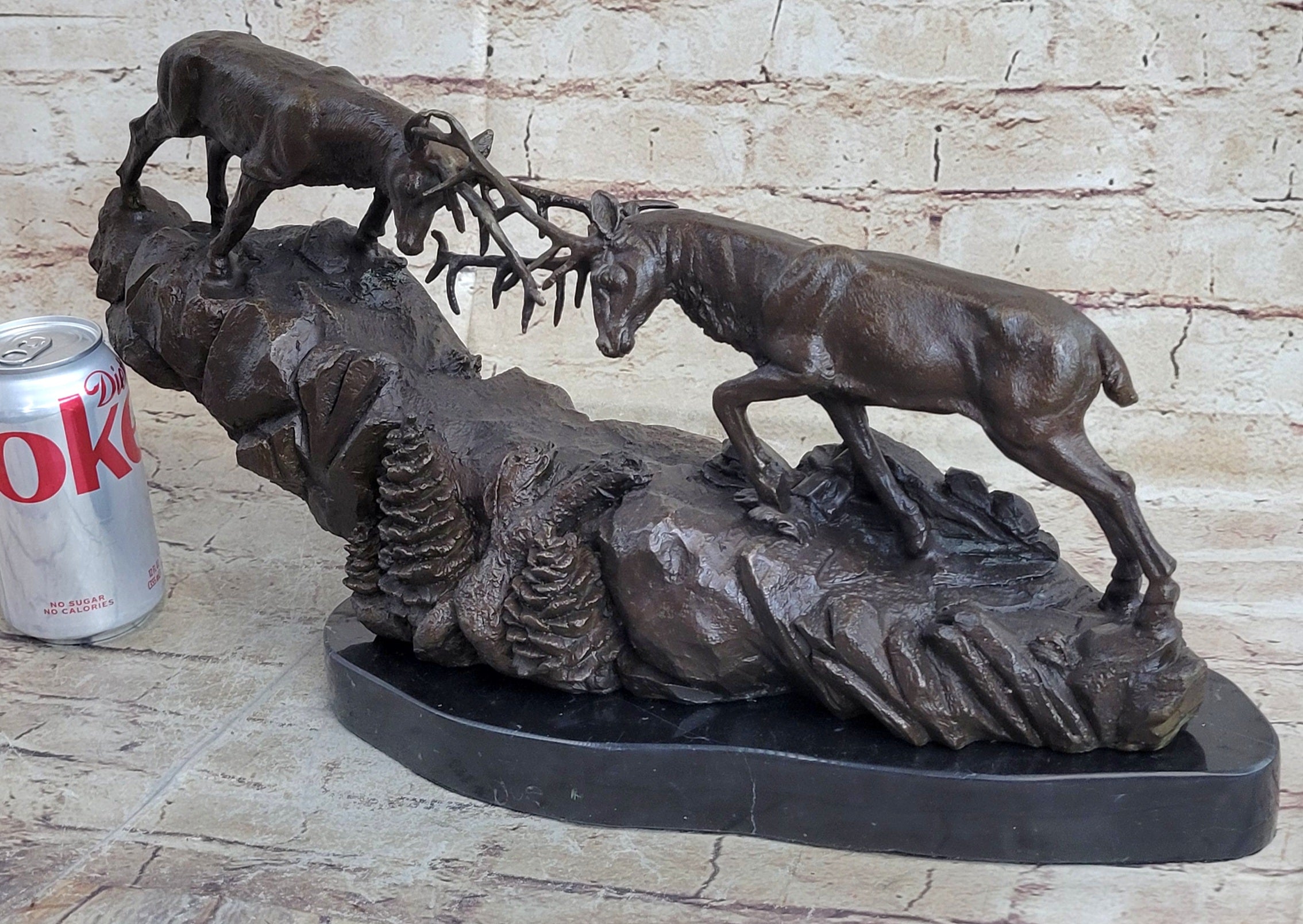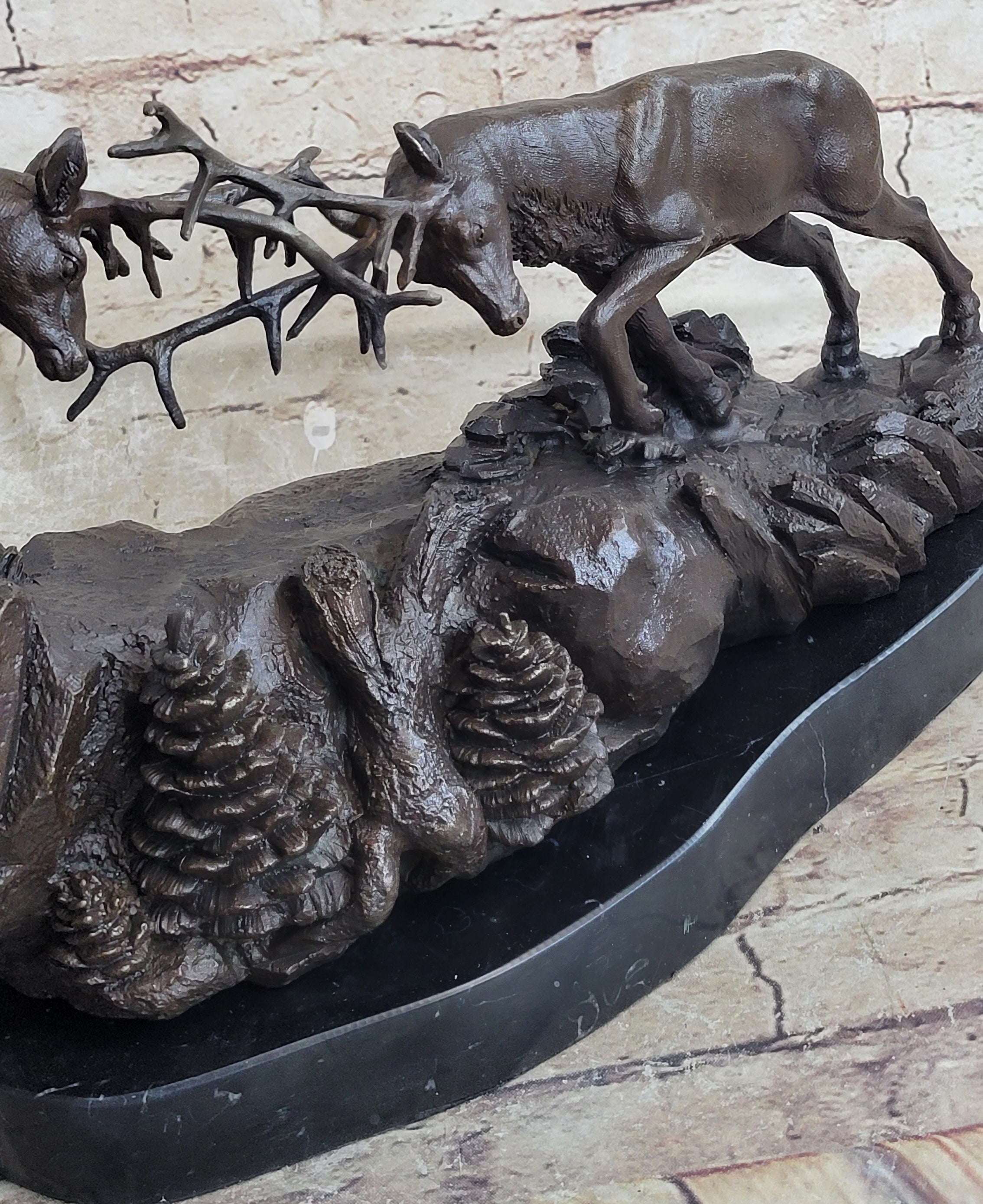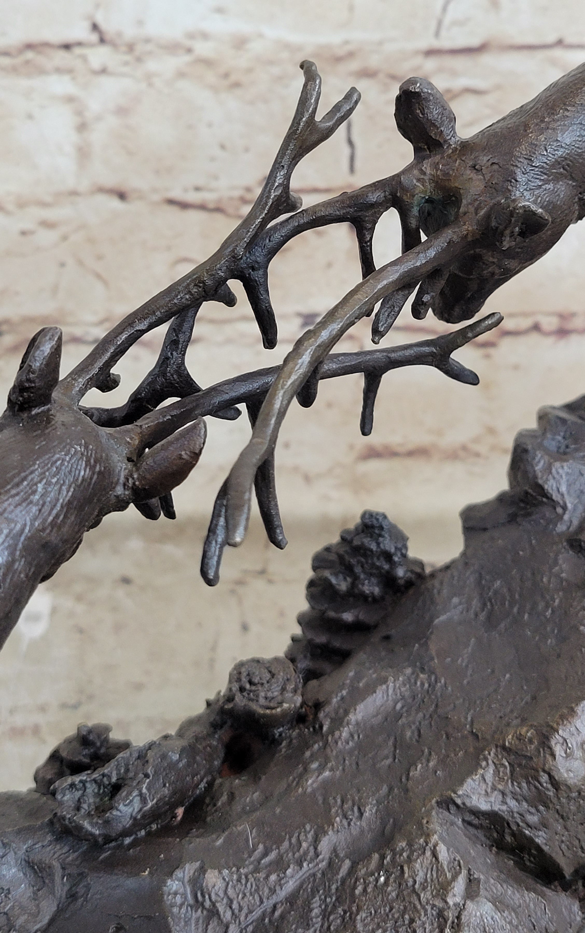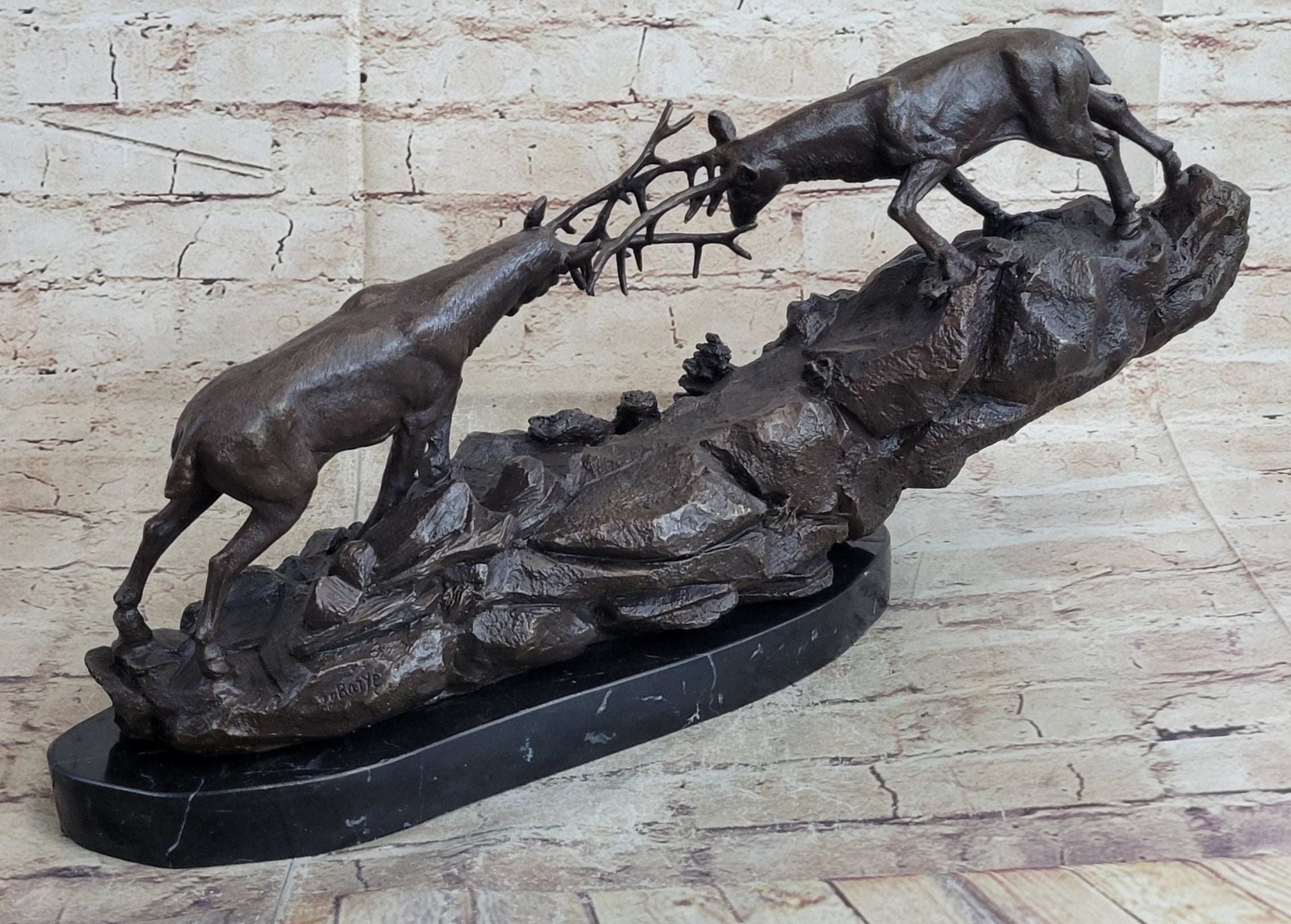Signed Large Barye Two Antler Deer Stags Bronze Sculpture Figurine Marble Base