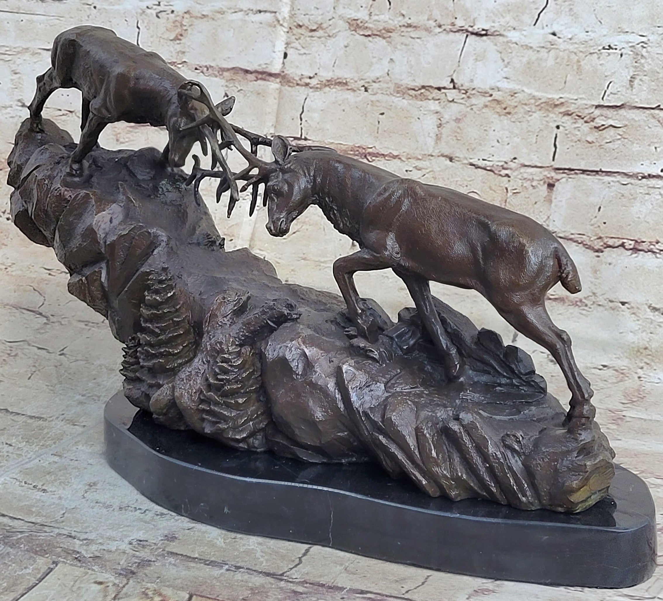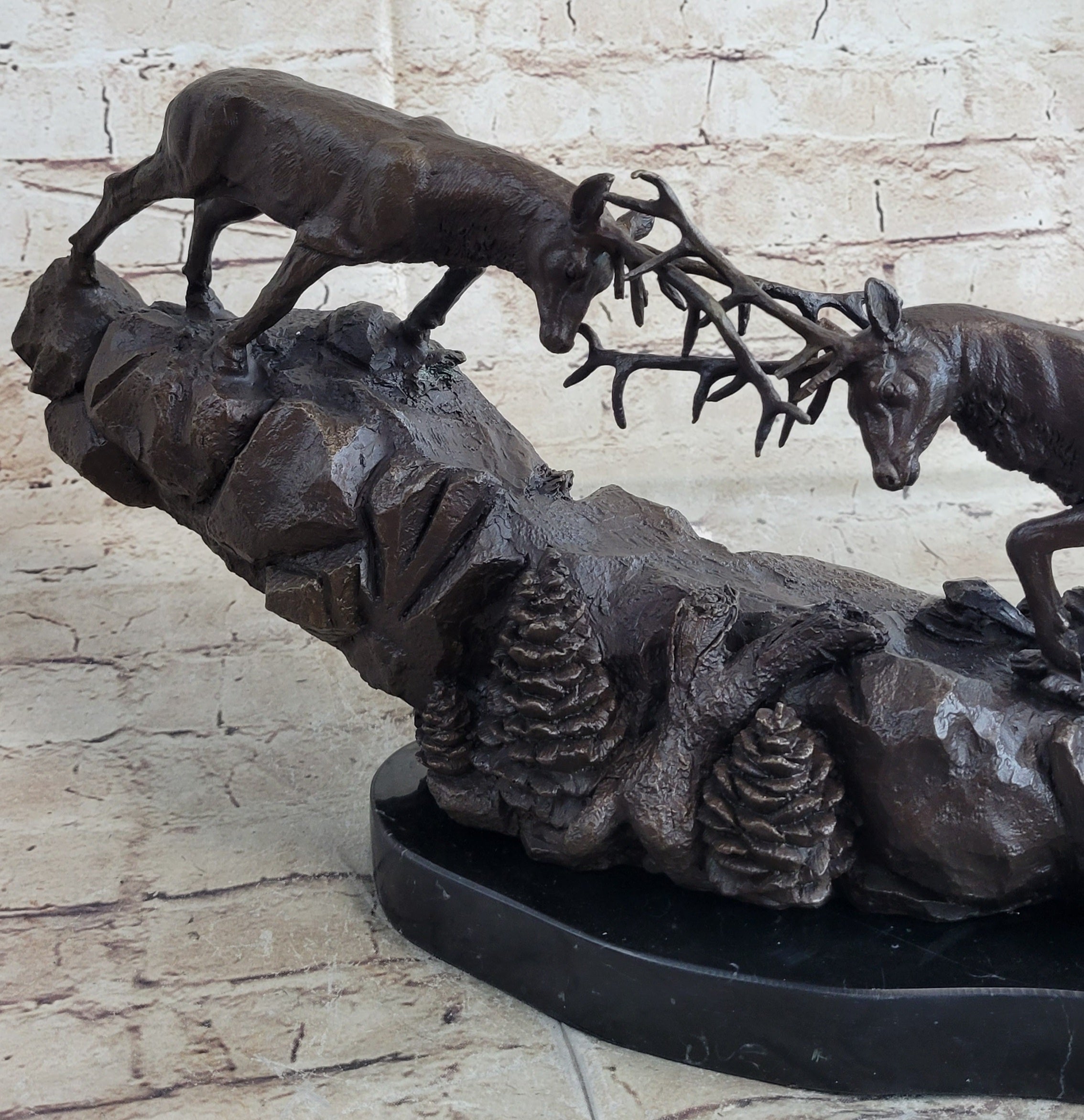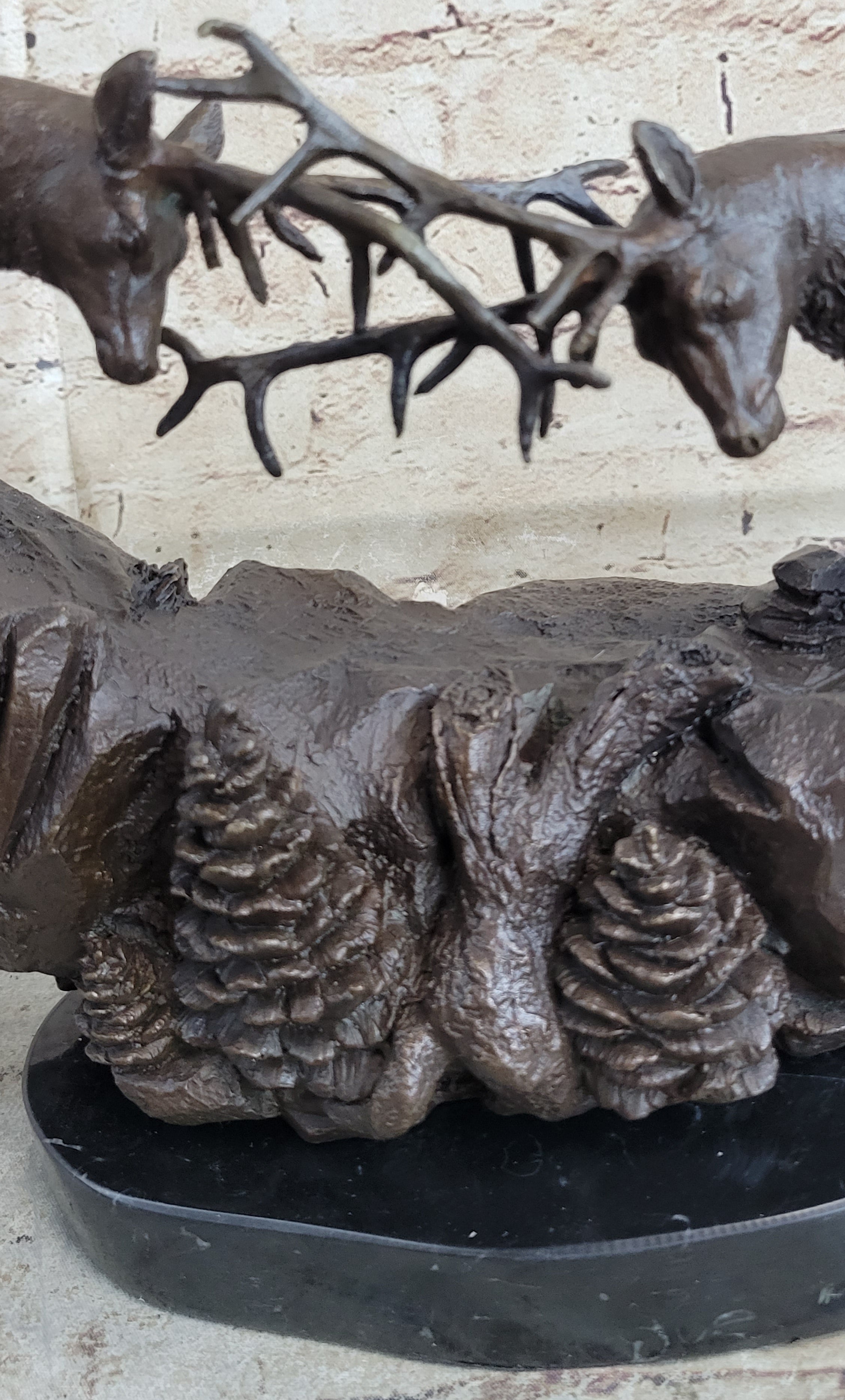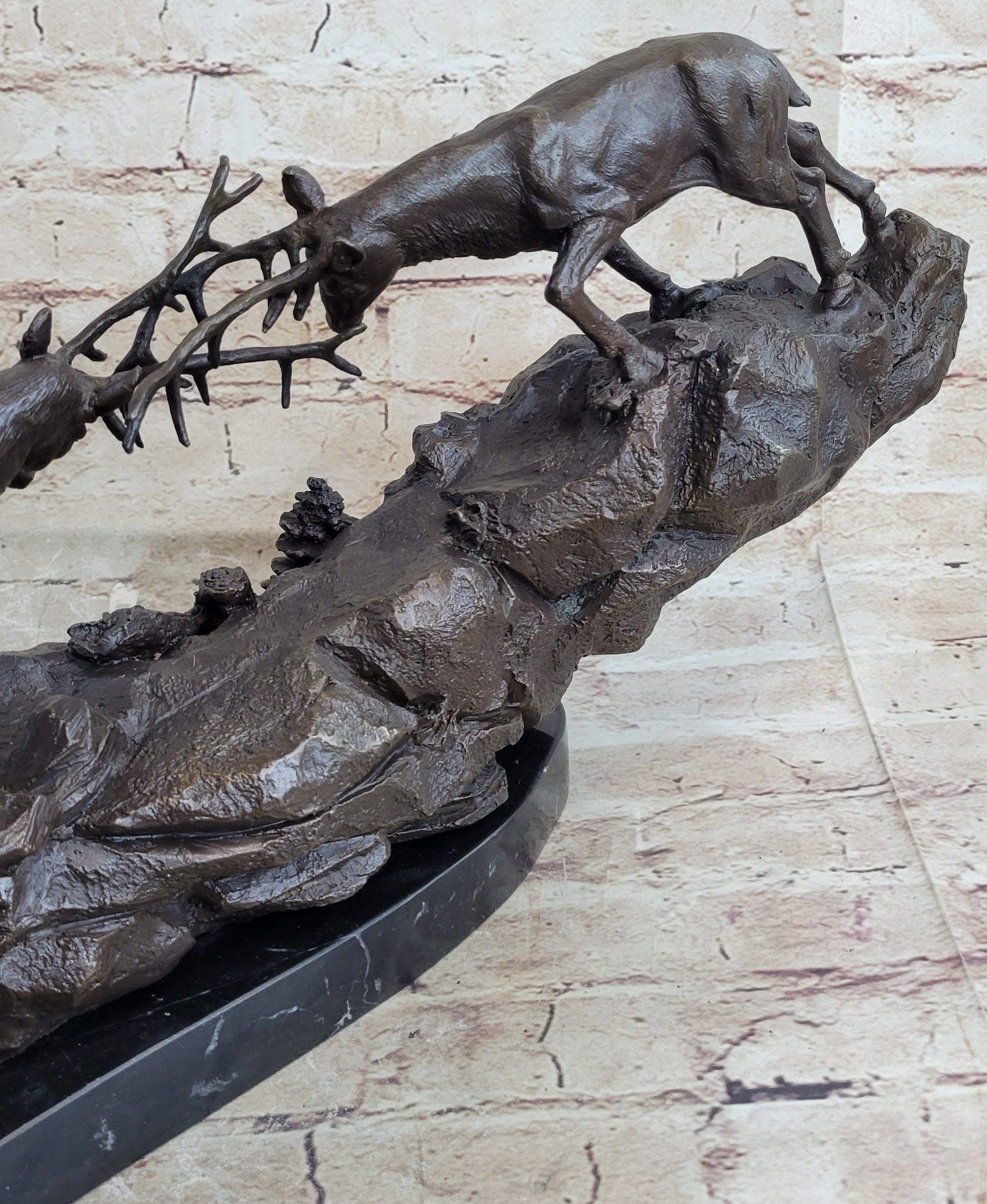 Signed Large Barye Two Antler Deer Stags Bronze Sculpture Figurine Marble Base