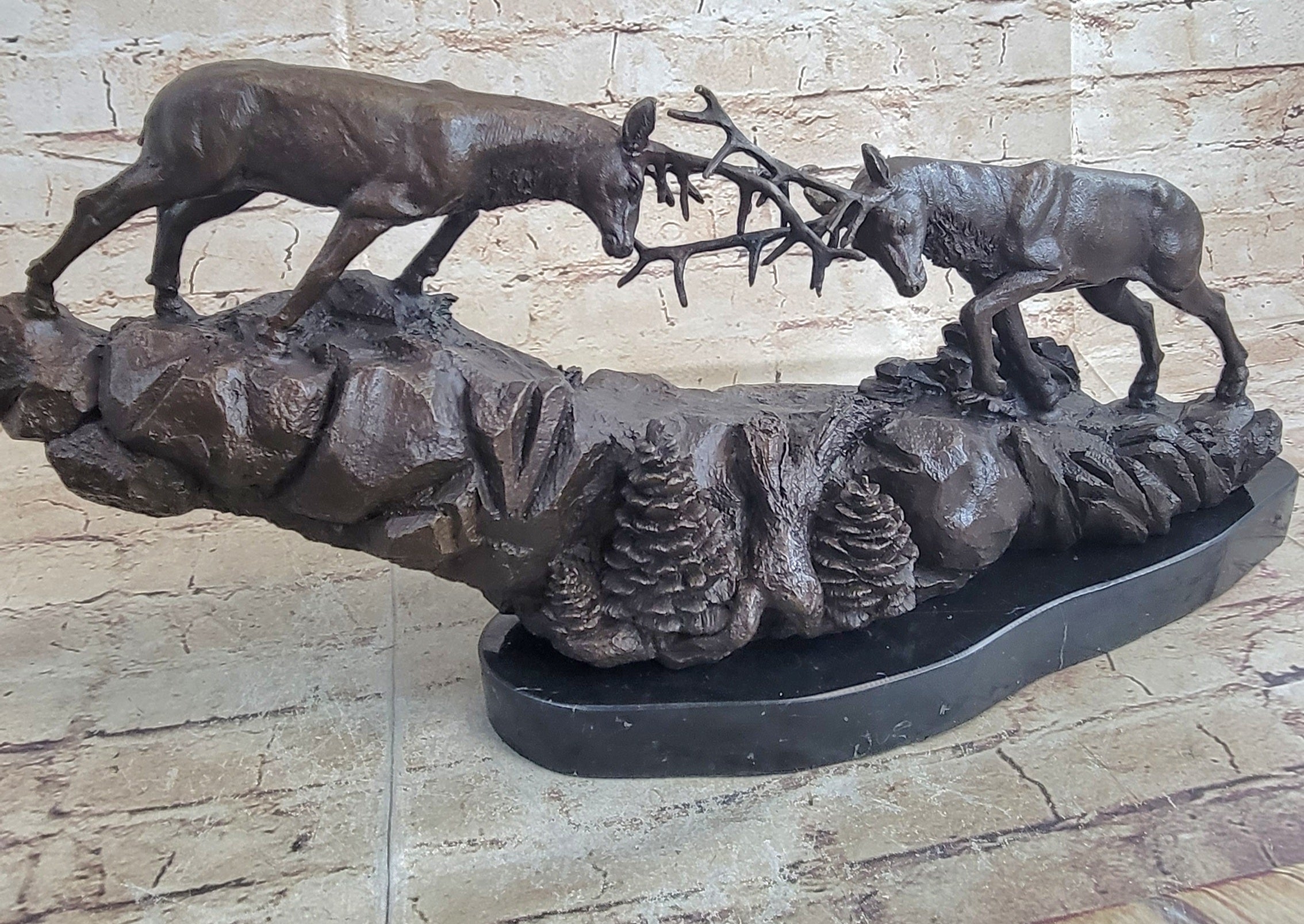 Step into the heart of the wilderness with this captivating bronze sculpture of two deer locked in an intense battle. Antler to antler, they engage in a fierce fight, displaying their innate instincts for survival. As with humans, deer have their own fight or flight responses, and in this moment, they have chosen to confront their adversary head-on. The rocky hill adds a touch of ruggedness to the scene, and the higher ground gives one deer the advantage in this duel.