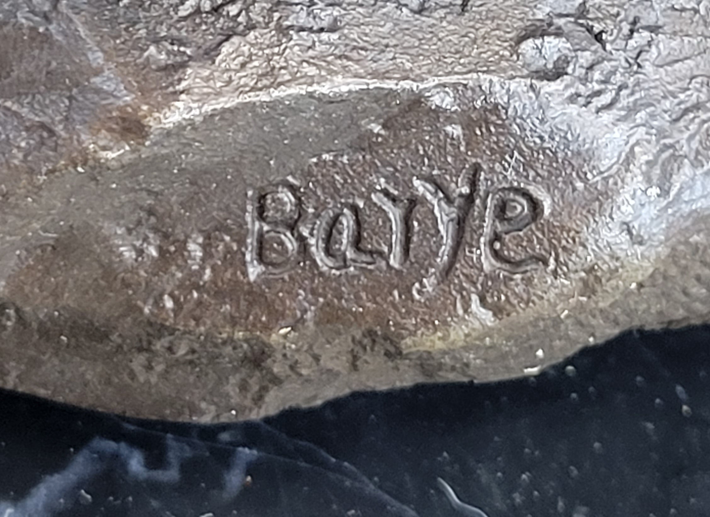 Mounted atop a sleek black marble base, this bronze sculpture stands as a testament to the strength and resilience of these majestic creatures. Signed by the esteemed artist A. Barye, this piece adds a touch of wild beauty to any home, office, or outdoor setting, evoking a sense of wonder and awe in all who behold it.Bronze Dimensions with Marble Base: Height 9" X Width 20"