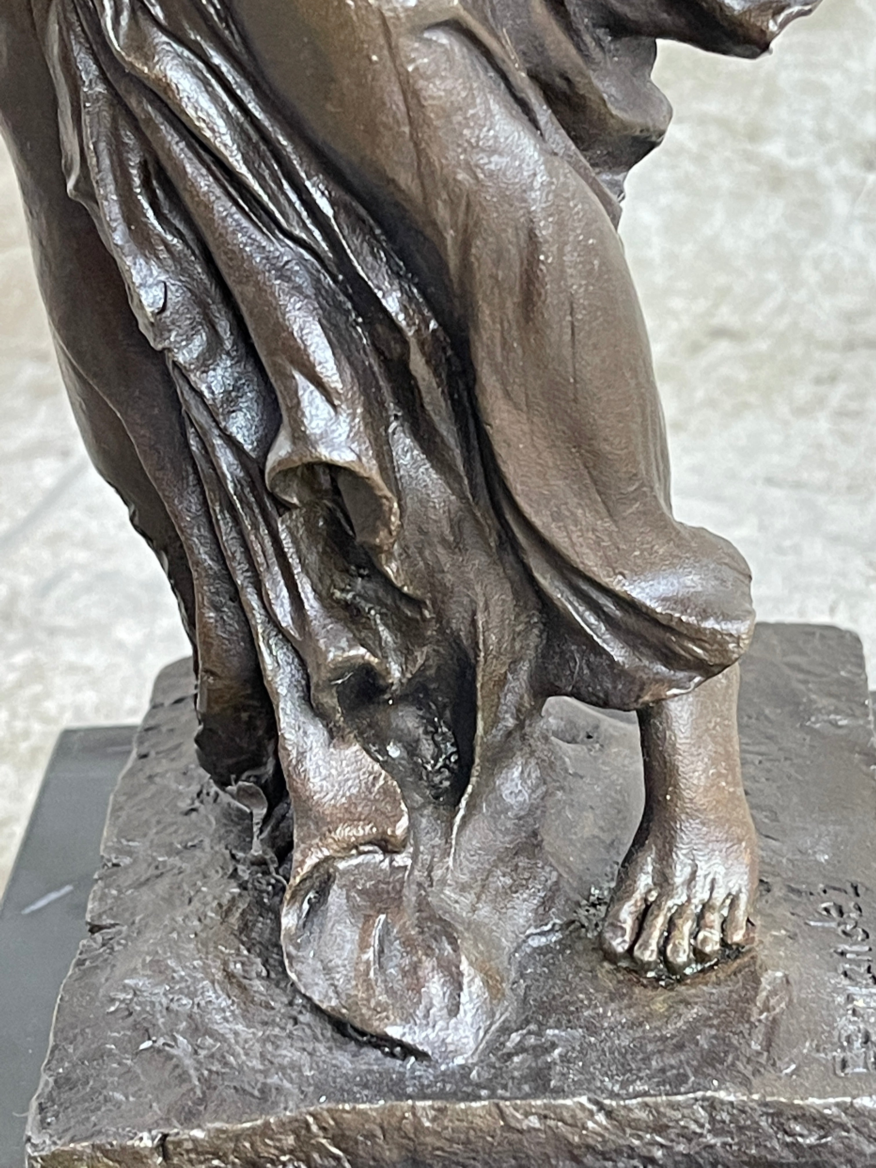 This replica casted in bronze is of the the Winged Nike of Samothrace, one of the most important and beautiful surviving masterpieces of antiquity .The original marble statue of the Winged Nike of Samothrace (Nike of Samothrace) was uncovered on the island of Samothrace by French consul and amateur archaeologist Charles Champoiseau in 1863.In Greek mythology, Nike, also known as the Winged Goddess of Victory, bestowed triumph, both in war and in contest. As a war goddess she was often represented standing along side Zeus, Athena and Ares. As goddess of contests, she typically is portrayed adorning the winner with a victor's wreath and/or sash. The statue of Nike is one of the greatest surviving sculpture masterpieces of the Hellenistic period, even though it is significantly damaged; most significantly missing its head and outstretched arms. Created by an unknown sculptor (Rhodian in origin), the piece is dated between period 220-190 BCE.This archaic duplicate can now be enjoyed on a daily basis for anyoneenchanted by this celebrated mastery or with Greek mythology. The goddess was cast to the original likeness using the lost-wax method and stained with a brown patina finish. She eternally stands upon a black marble base with the artist Milo's signature.Bronze Dimensions with Marble Base: Height 12" x Width 6"