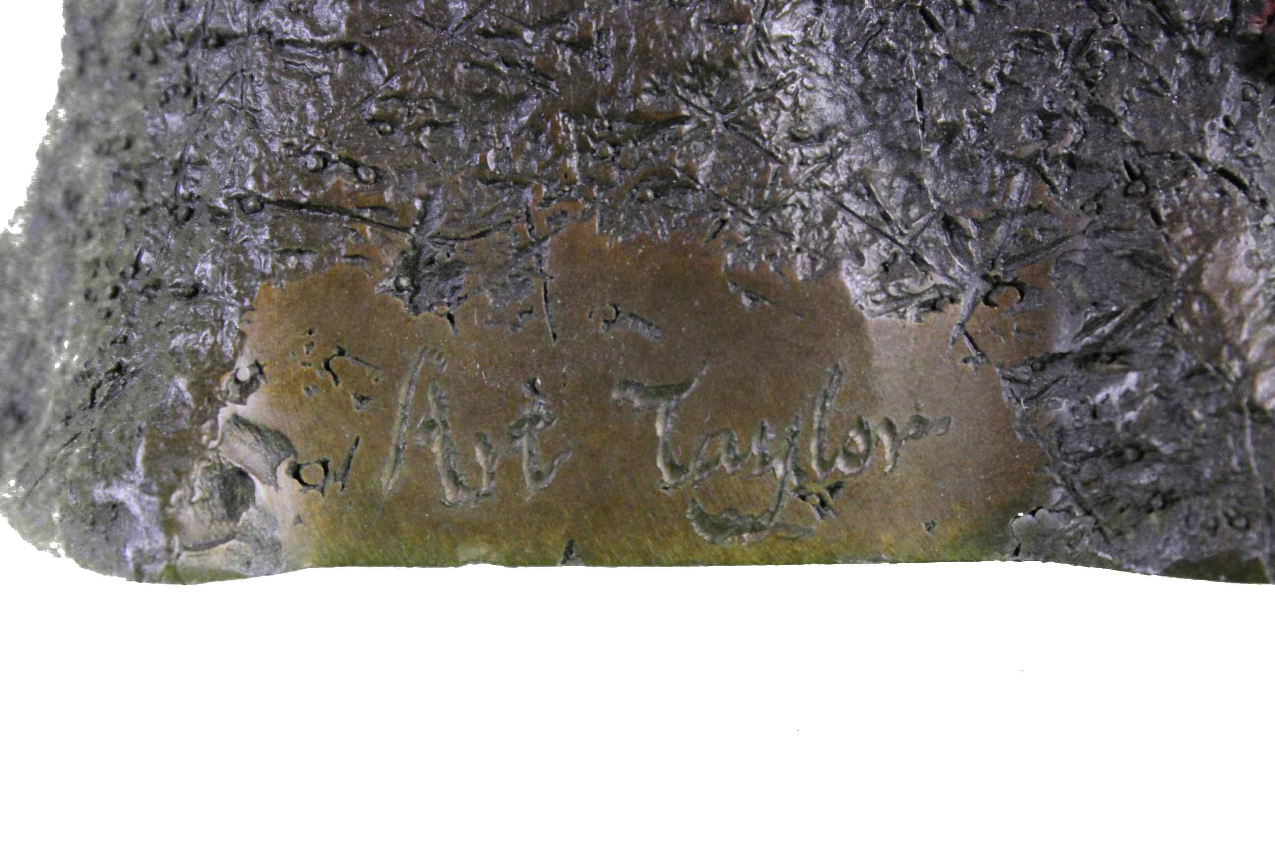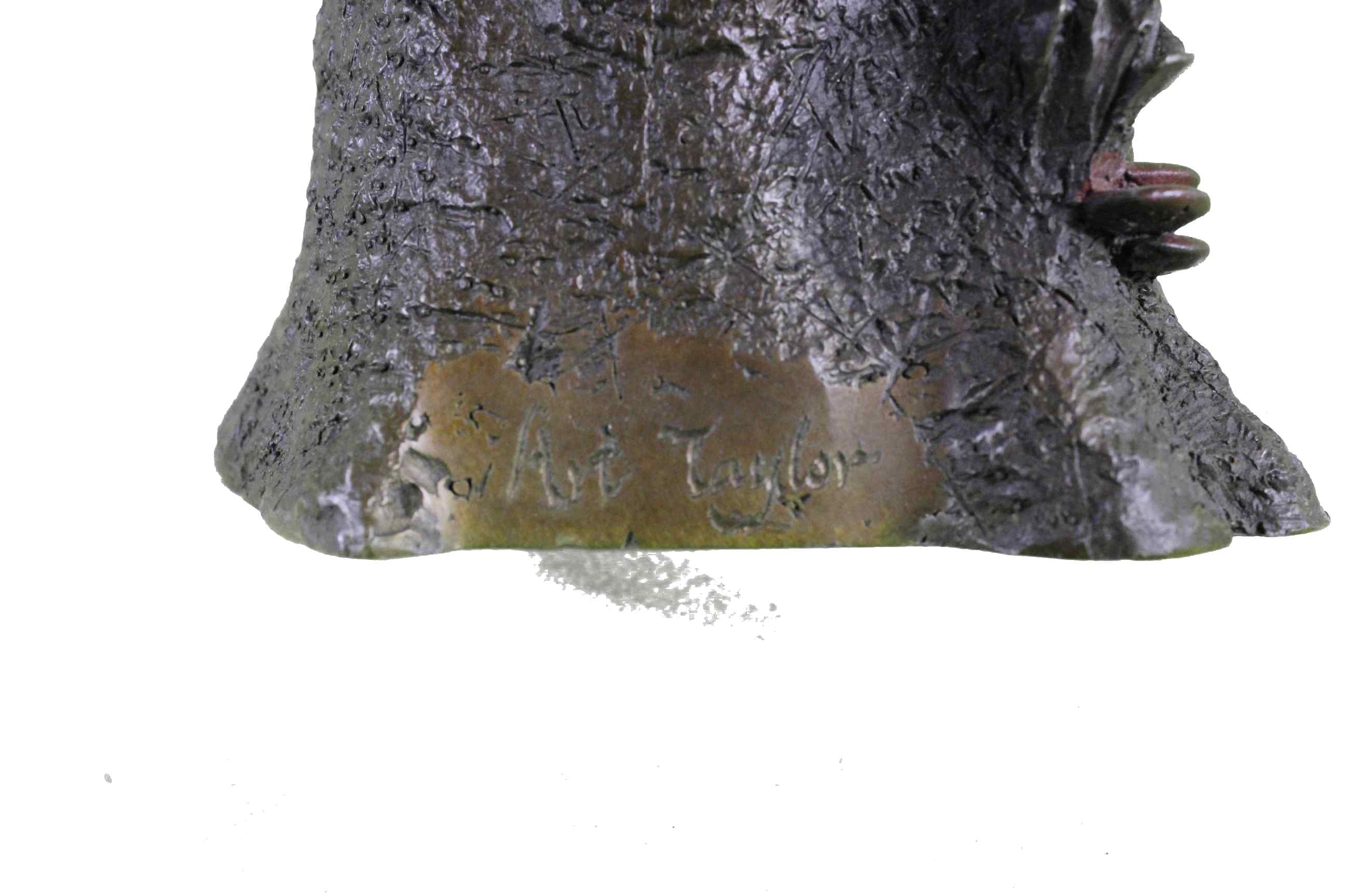 Rather hard to find "Girl on A Tree Stump" in a bronze with multi color patina. Signed by the artist Art Taylor on the rear. Bronze color is actually a shade or two darker than what the photo shows as the bronze had some reflection that caused the photo`s to be lighter than actual. This piece has a nice medium patina. The girl has both hands are wrapped around a branch and the other hand with fingers out stretched.Bronze Dimensions :Height 12" x Width 8"