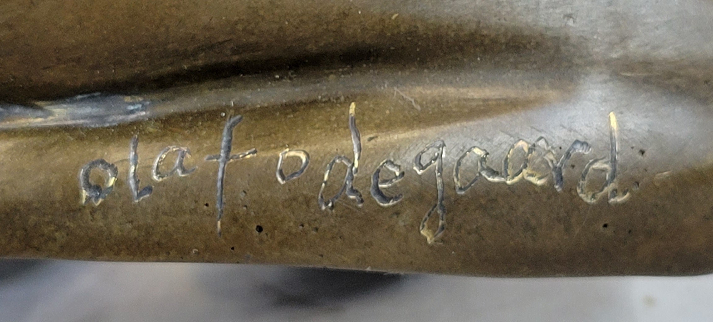 This captivating bronze sculpture masterfully captures the essence of feminine grace and beauty. The nude woman sits on the ground, her posture exuding a sense of serenity and self-assuredness. The sculpture was created using the traditional lost-wax casting method and finished with a brown patina to preserve its artistic beauty. It is signed by the artist, Olaf Odegard, and is sure to be a captivating addition to any art collection.