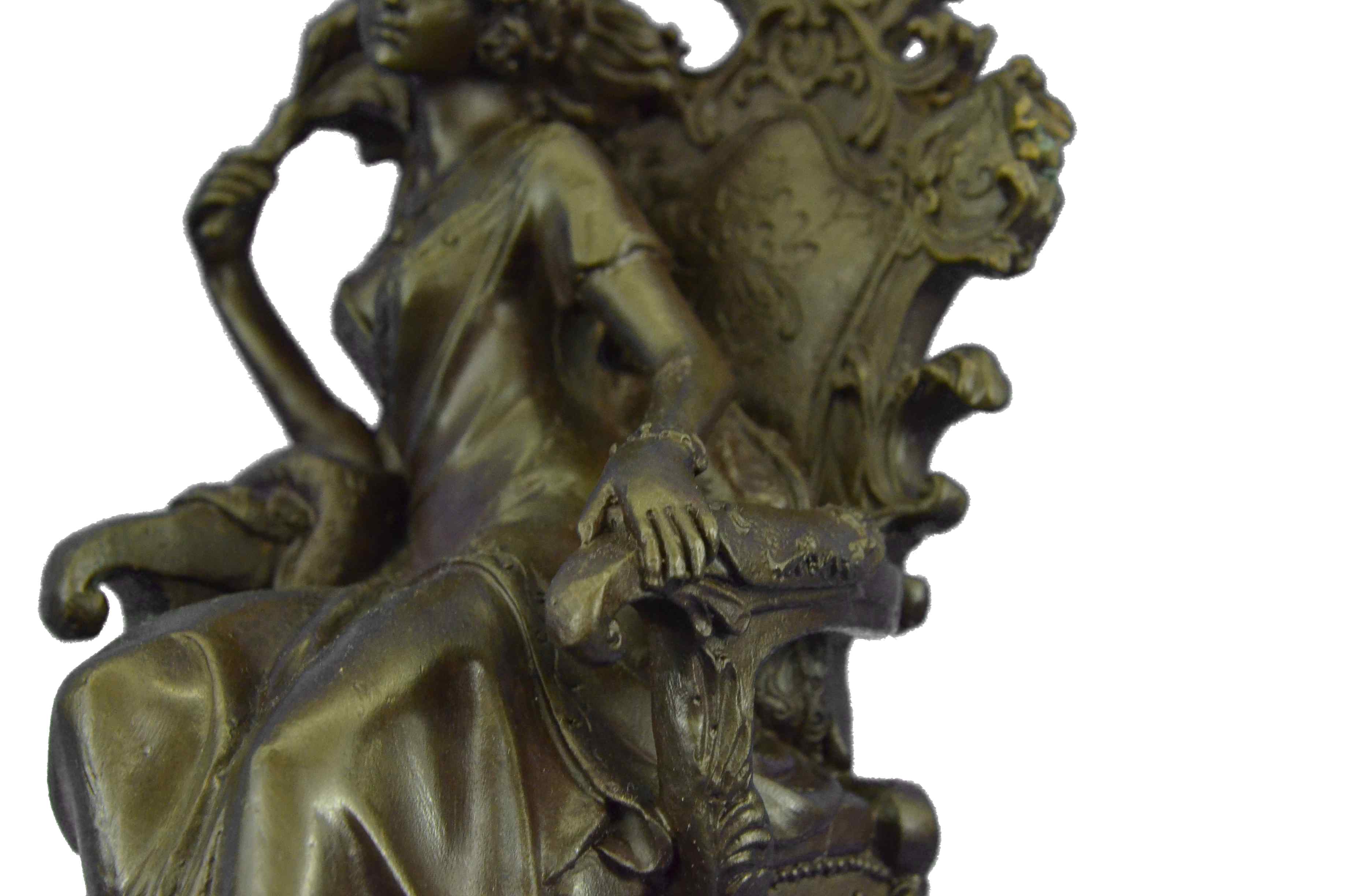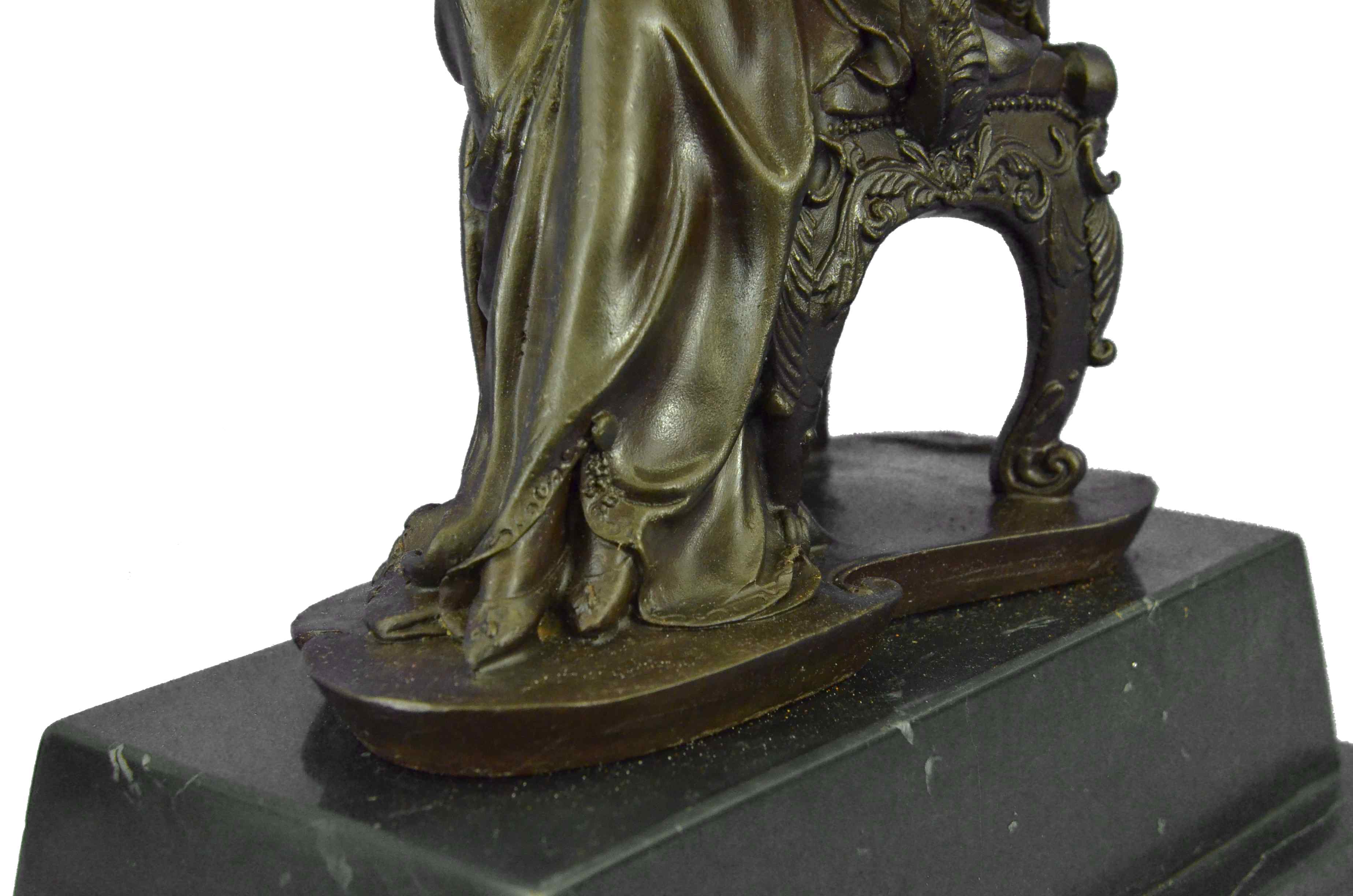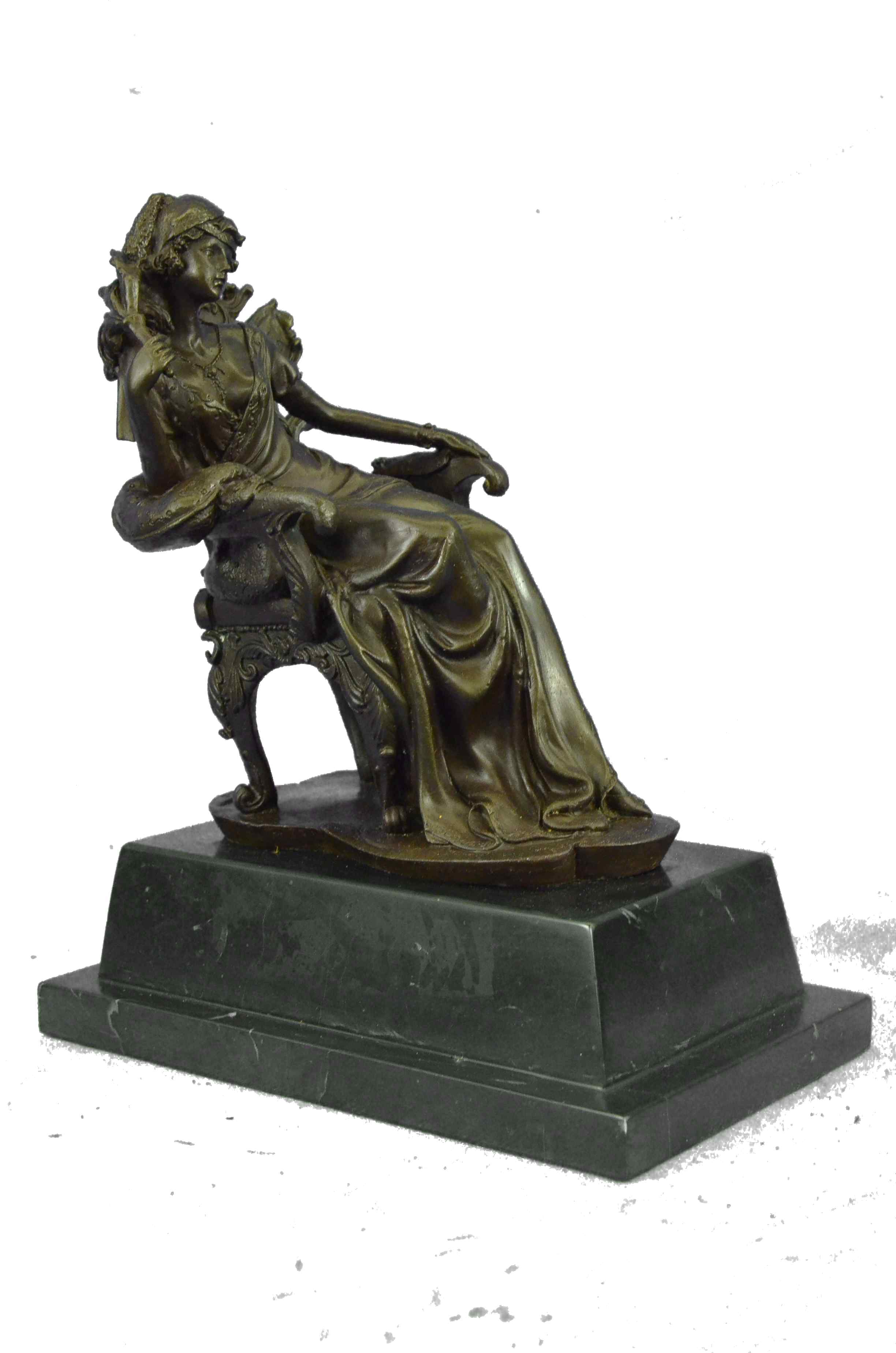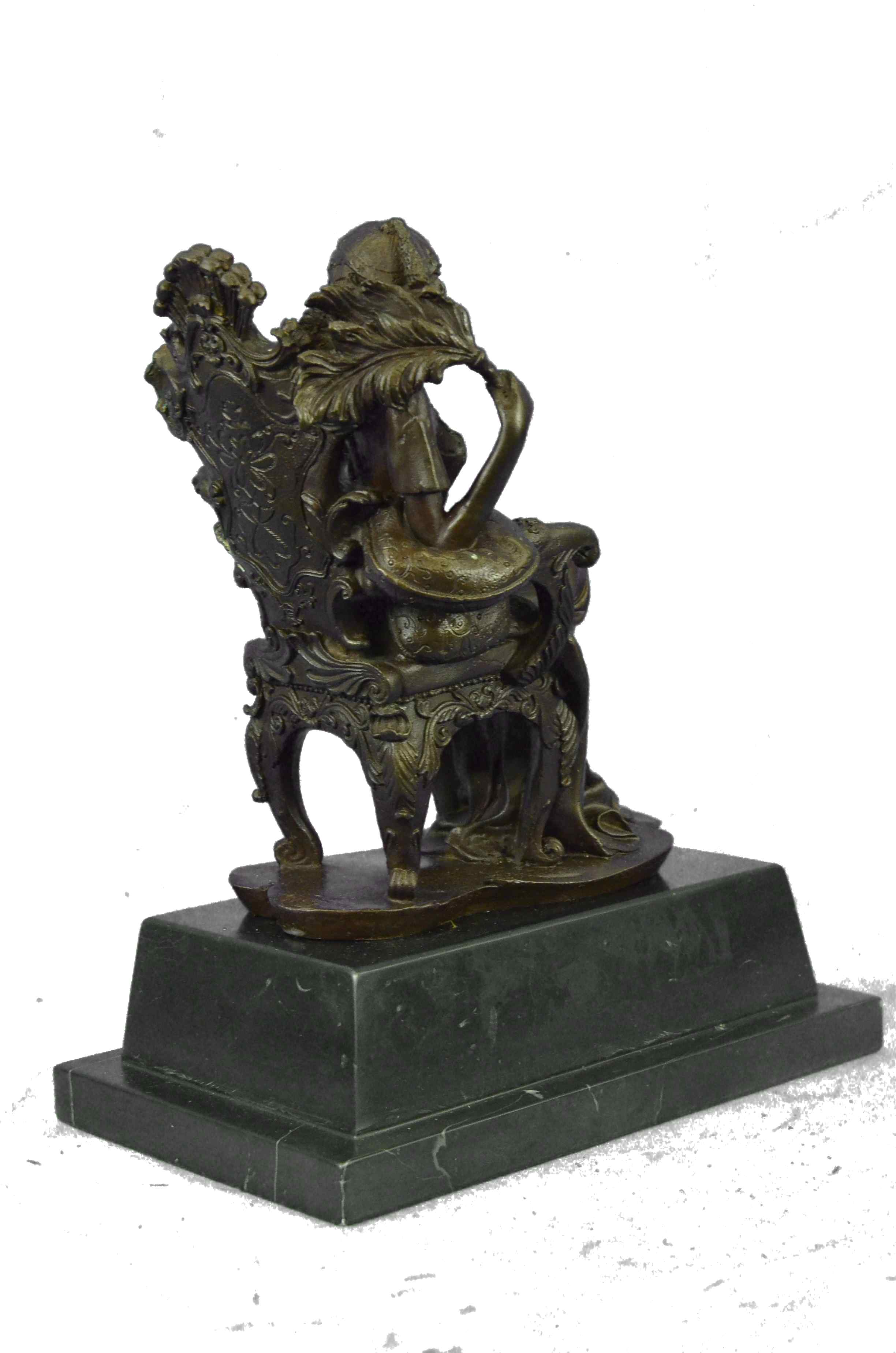 The Victorian beauty sits on a exquisitely detailed arm chair in her tall-ceiling and finely furnished parlor. She sits august and carefree as she listens to gossip from a guest. The details in this sculpture are absolutely remarkable, with the gold patina accents and contrasts adding to its allure. The texture and sculpt of her dress is so representational that it transforms a hard material into a real silk fabric. The handmade bronze sculpture was molded using the ancient method of lost-wax casting and with skin tones stained with a brown patina finish for preservation. It is mounted upon a black marble base with the European Bronze Finery stamp of quality and the artist Milo`s signature.Bronze Dimensions with Marble Base:Height 12" x Width 9"