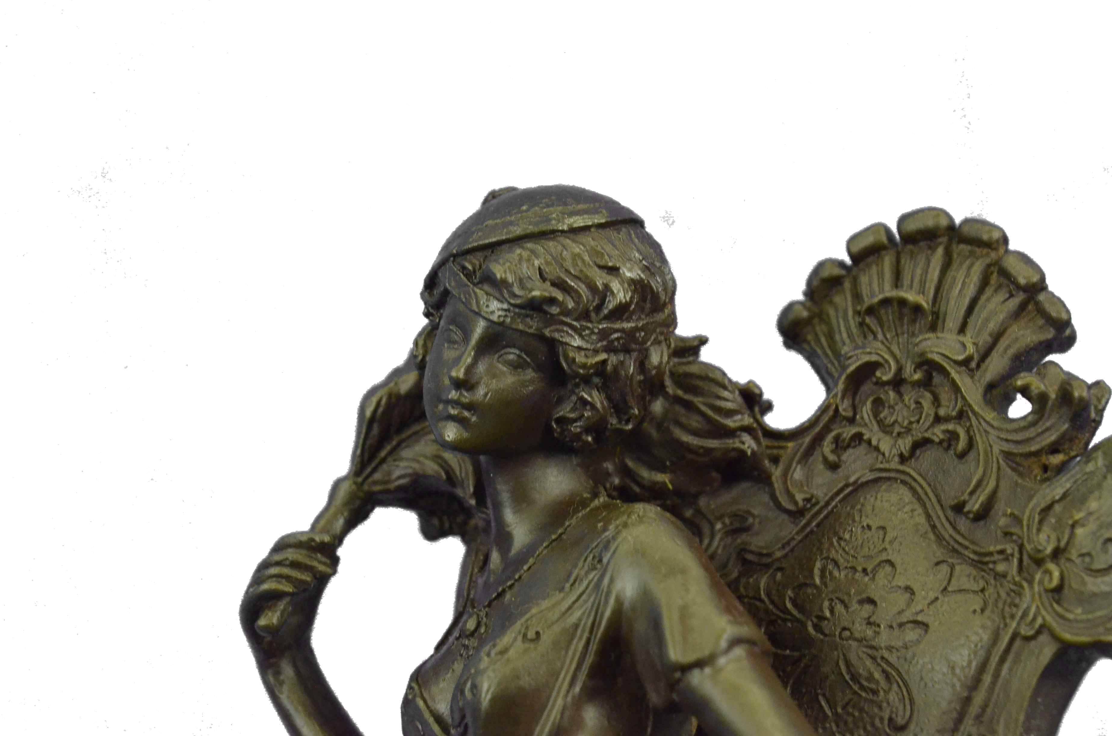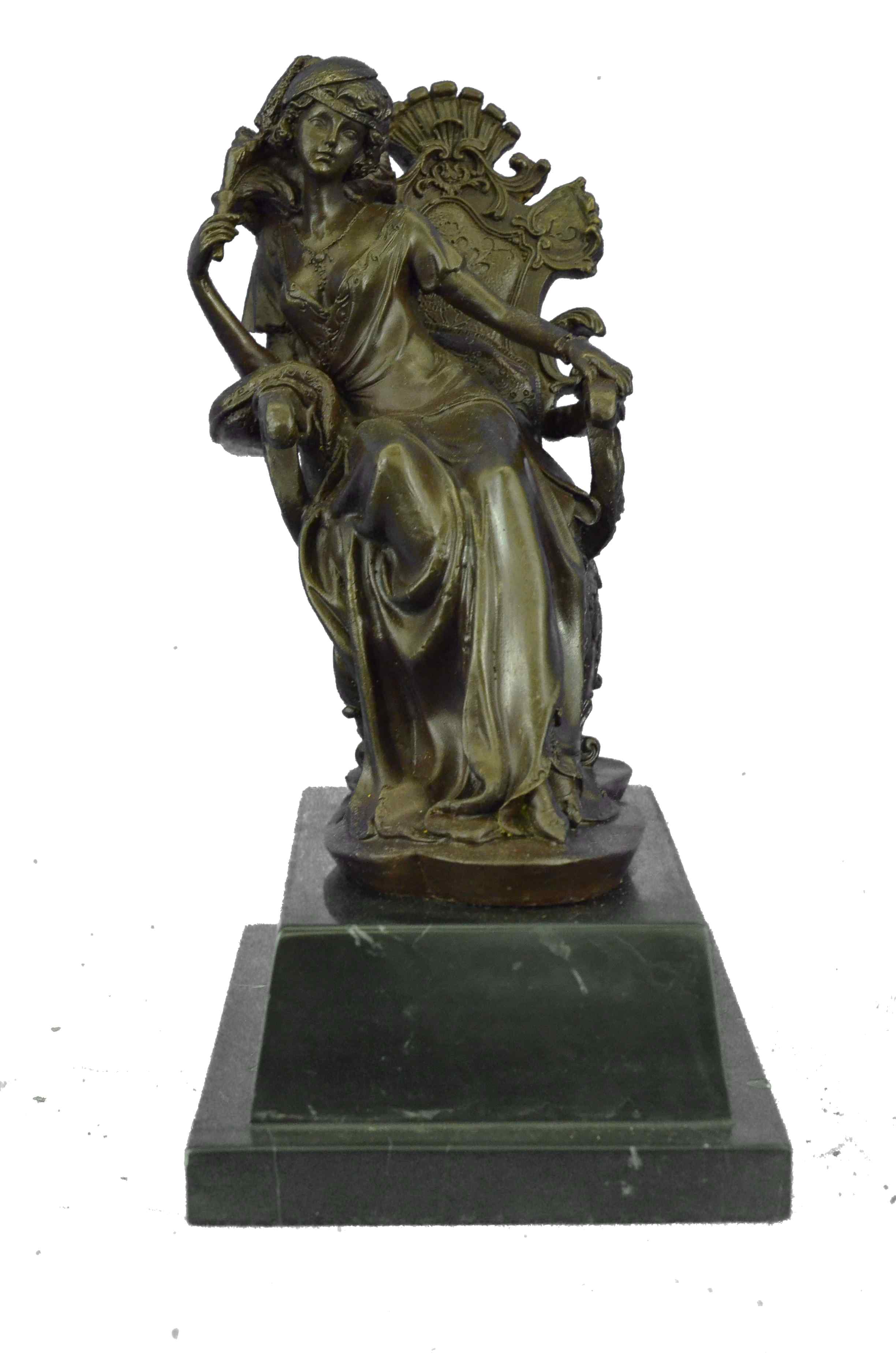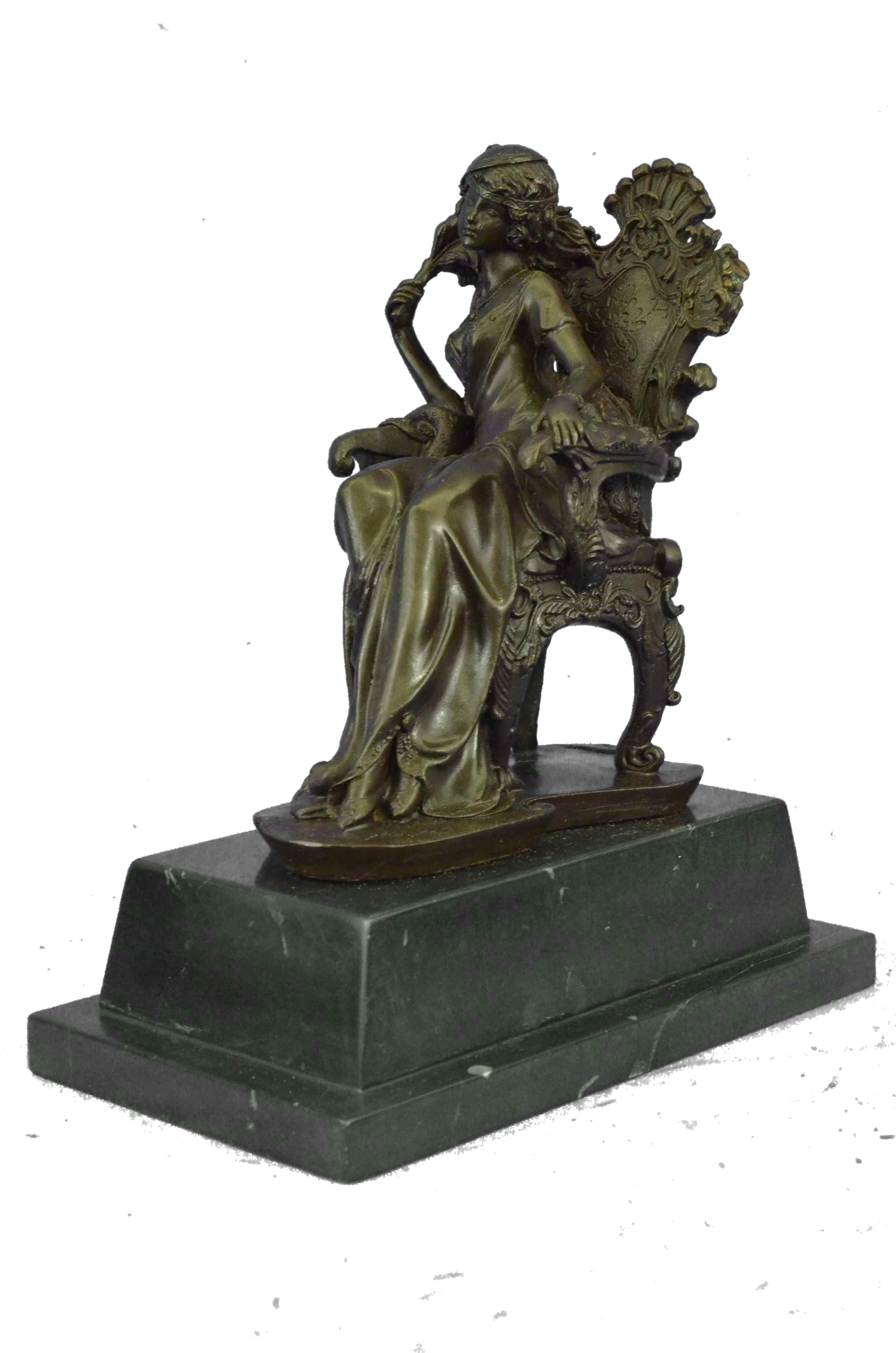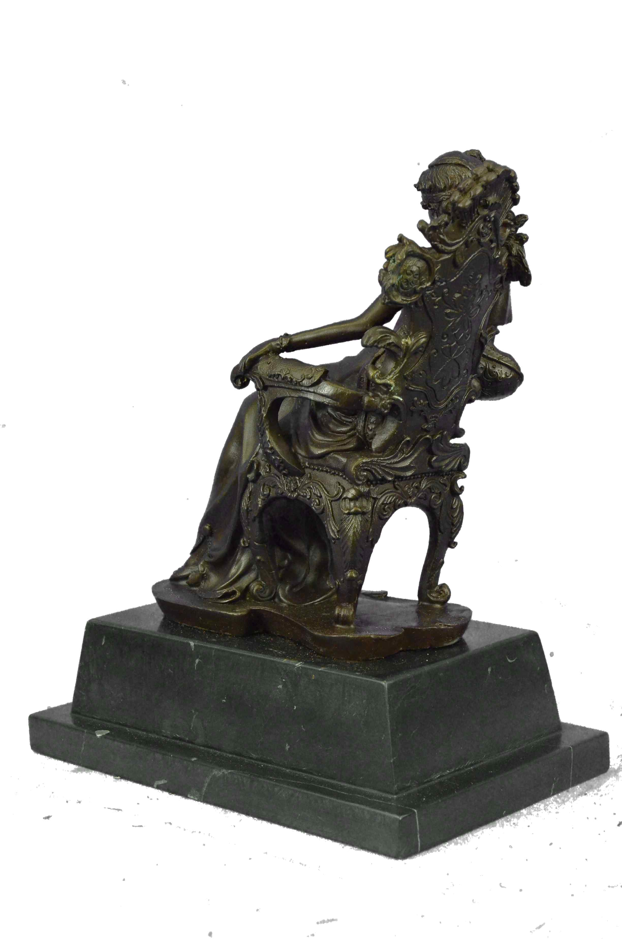 The Victorian beauty sits on a exquisitely detailed arm chair in her tall-ceiling and finely furnished parlor. She sits august and carefree as she listens to gossip from a guest. The details in this sculpture are absolutely remarkable, with the gold patina accents and contrasts adding to its allure. The texture and sculpt of her dress is so representational that it transforms a hard material into a real silk fabric. The handmade bronze sculpture was molded using the ancient method of lost-wax casting and with skin tones stained with a brown patina finish for preservation. It is mounted upon a black marble base with the European Bronze Finery stamp of quality and the artist Milo`s signature.Bronze Dimensions with Marble Base:Height 12" x Width 9"