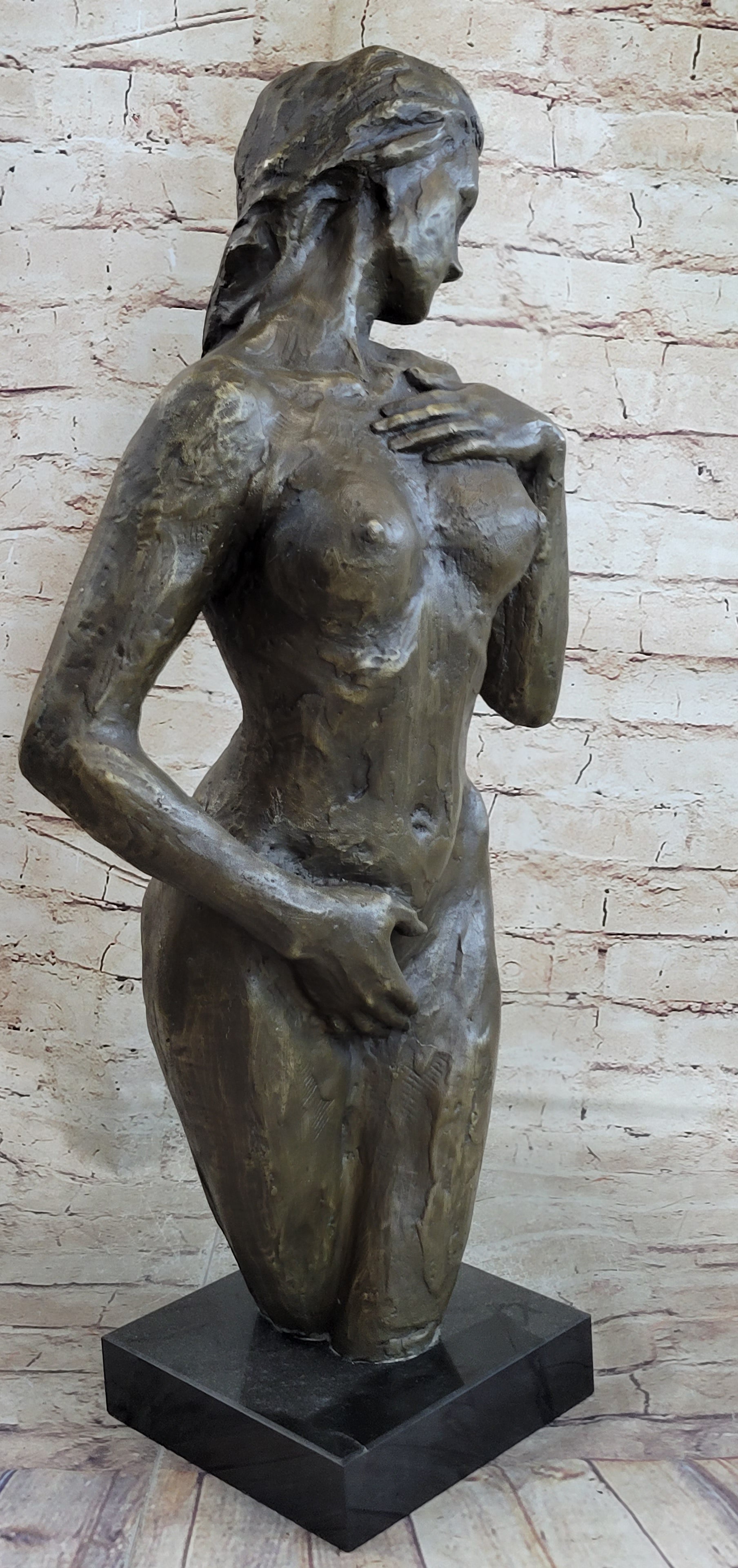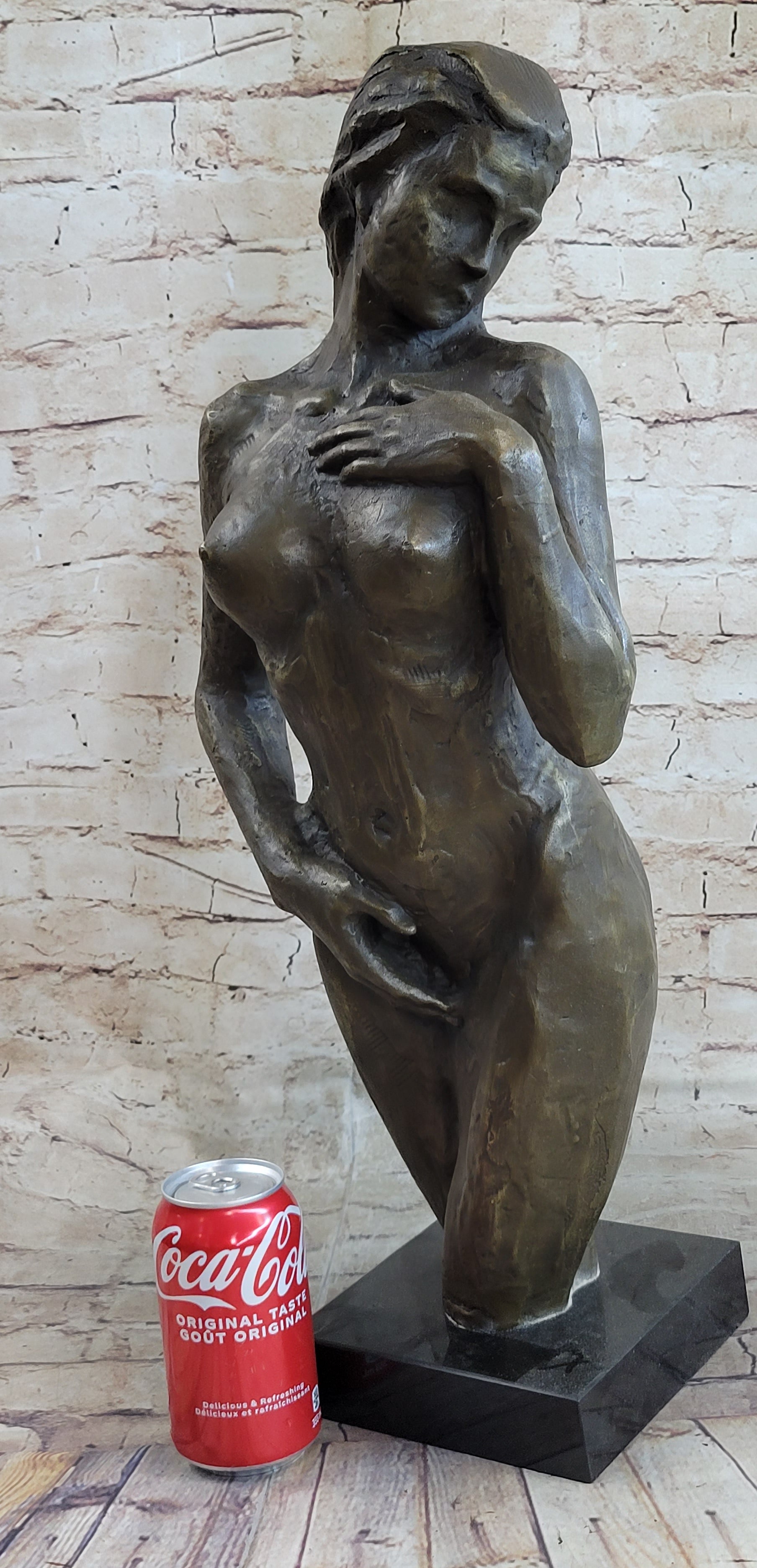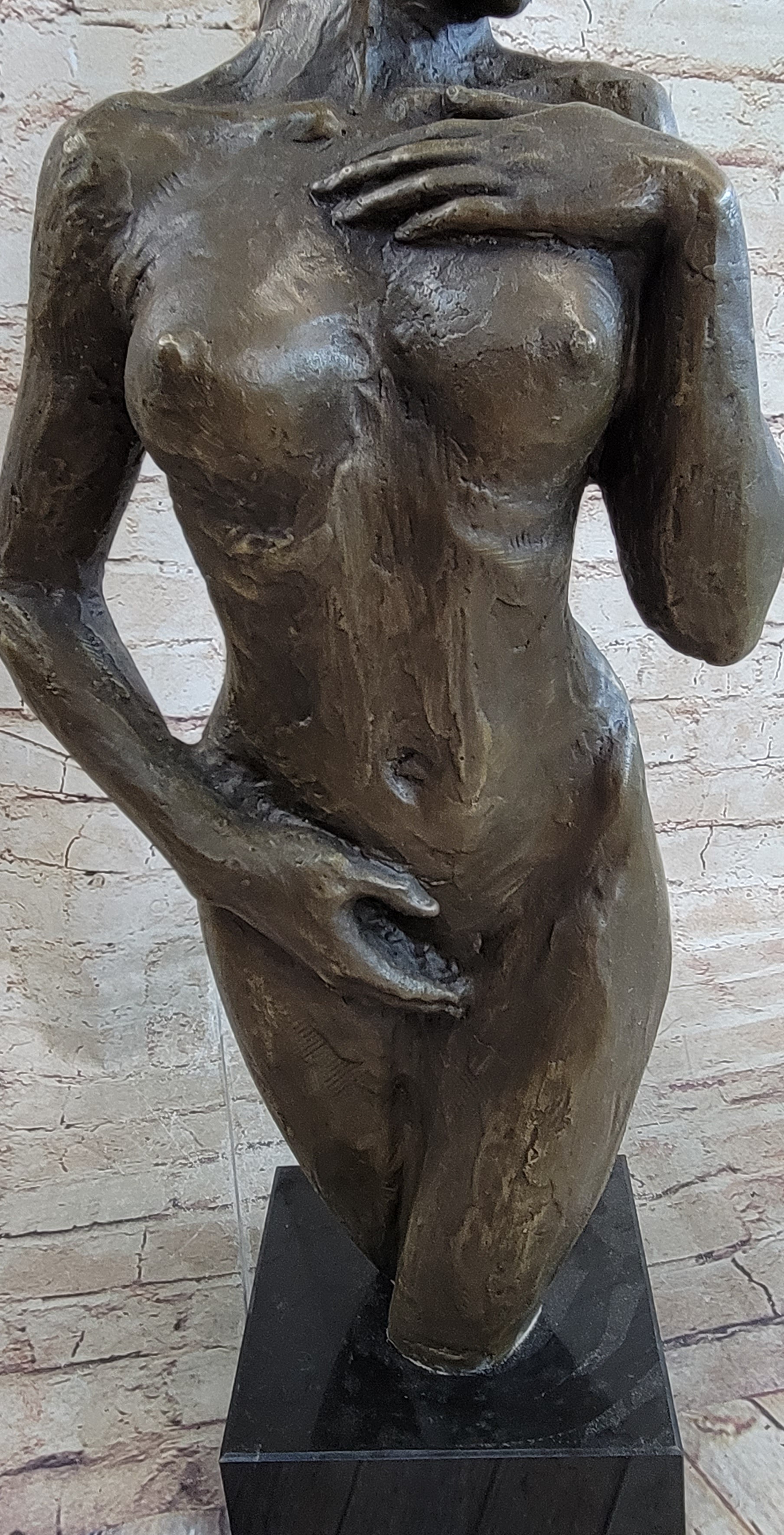 Resting on a sleek black marble base, this artistic statue not only provides a sturdy foundation but also adds a touch of sophistication to the overall design. Whether displayed in a private collection, gallery, or home, this sculpture will enhance the ambiance with its timeless elegance and celebration of the female form.Bronze Dimensions with Marble Base: Height 23" X Width 10"
