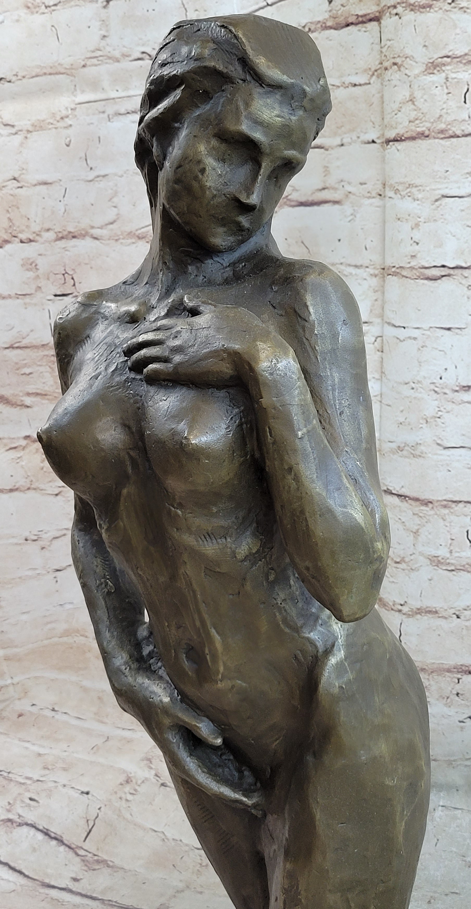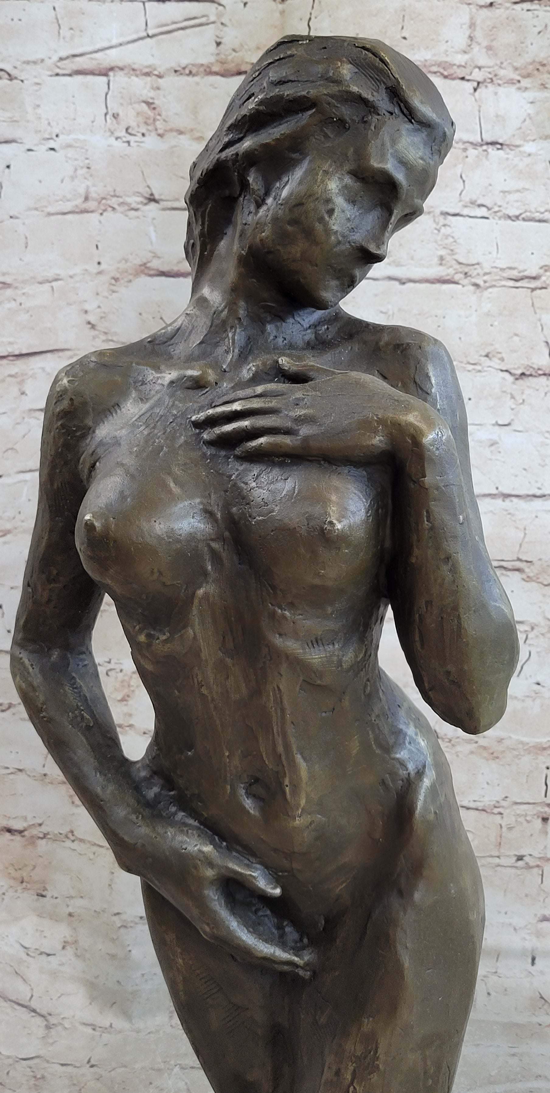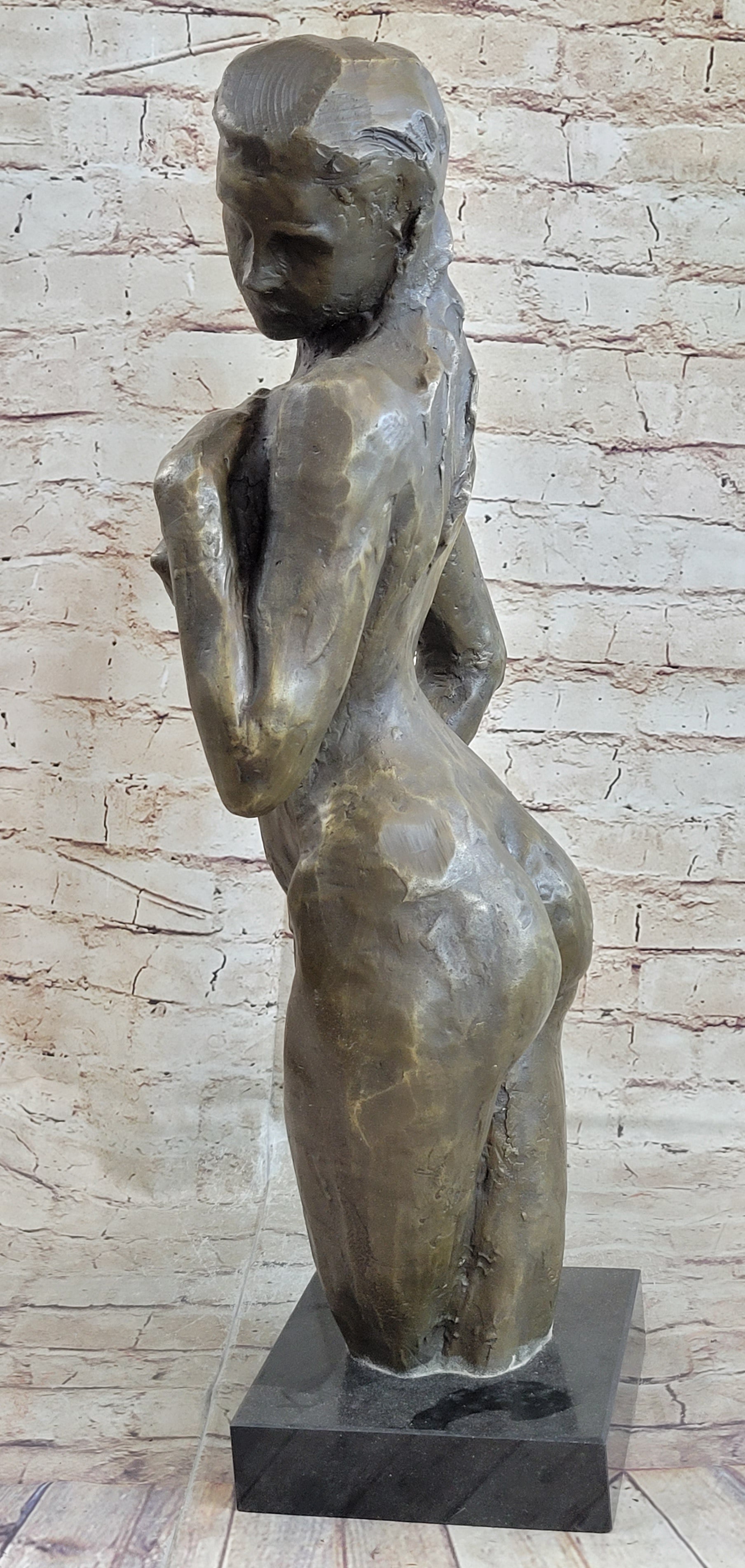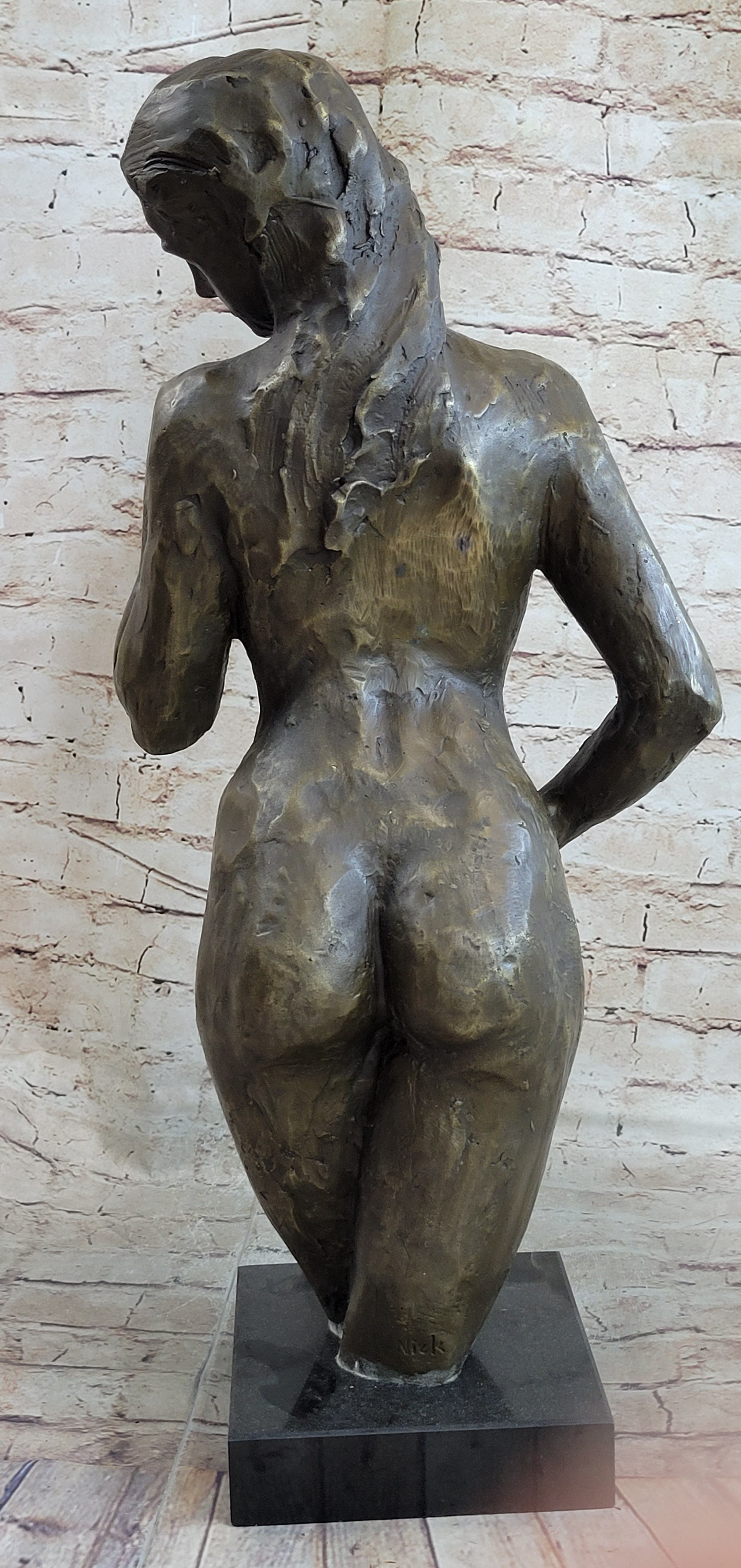 Resting on a sleek black marble base, this artistic statue not only provides a sturdy foundation but also adds a touch of sophistication to the overall design. Whether displayed in a private collection, gallery, or home, this sculpture will enhance the ambiance with its timeless elegance and celebration of the female form.Bronze Dimensions with Marble Base: Height 23" X Width 10"