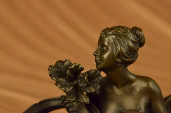 A sensuous nude woman rests on a flower. She stares wistfully beyond her brushing her luscious locks with her fingertips. The flower she sits upon is a large blossomed flower bud. She sits on its edge with her feet inside as if it were a bath tub. This delightful sculpture was crafted using the lost wax method. It is set on a black marble base. It is signed by artist Milo.Original or Reproduction: Original