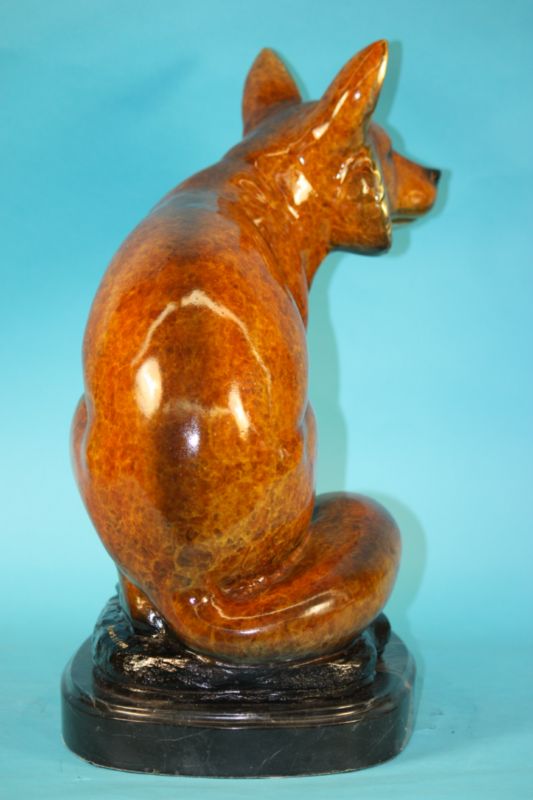 This sly creature has a beautiful pose and beautiful markings to go along with it. He sits attentive with his back straight and his ears pointed perfectly upward toward the sky. He looks as if he is wearing a mask; it covers right below his eyes and follows down his neck to his back. He has beautifully multi color patina markings on his ears and his legs. His proportion and muscle contour are great. He has great detail and is great for any home or office décor. This sly fox is sure to gain some attention. This bronze sculpture was casted using the “Lost Wax Method” and has a beautiful special patina. This limited edition sculpture is an original artwork and signed by artist Marius.Bronze Dimensions with Marble Base:Height 18" x Width 18"