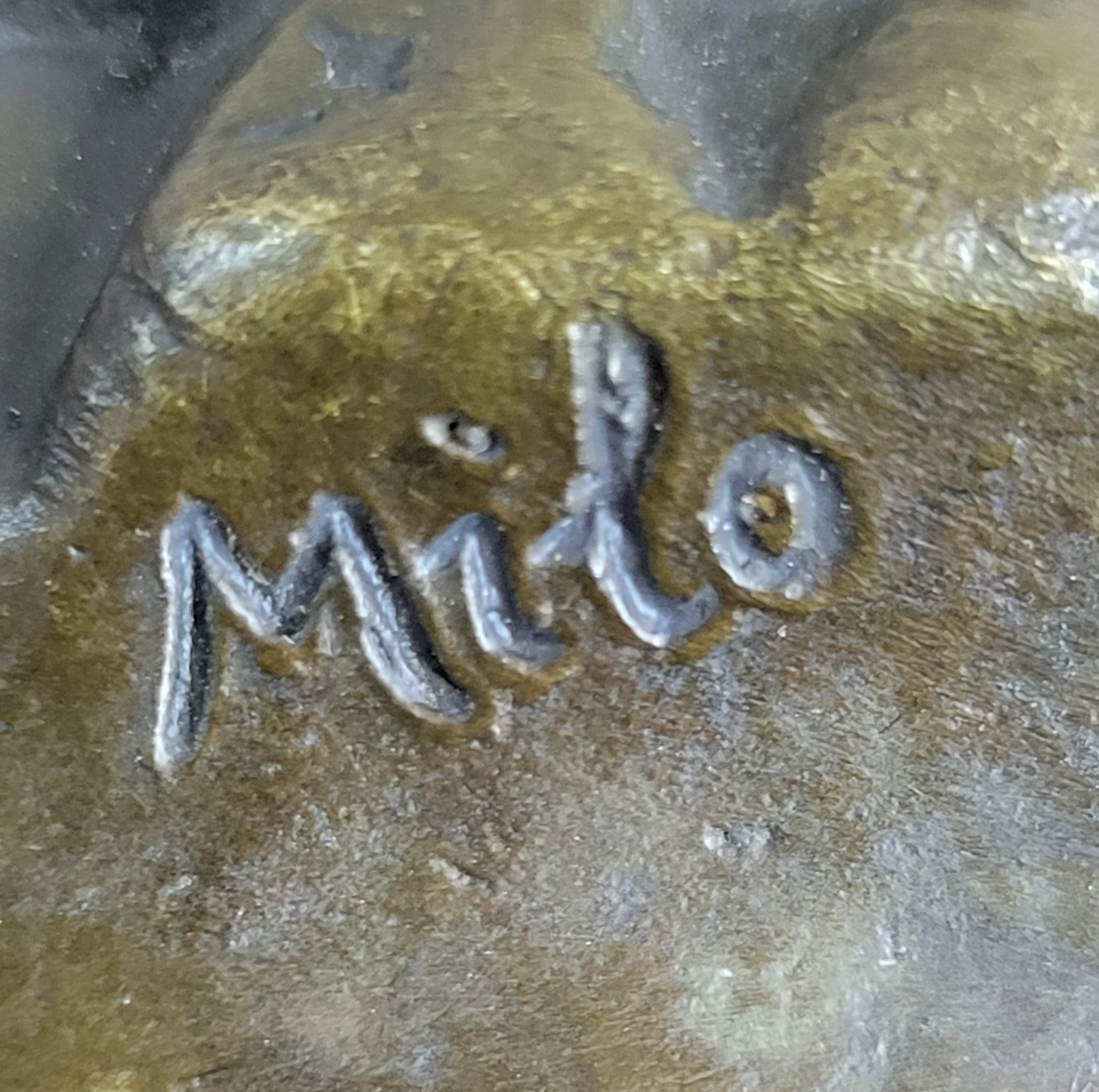 Cast in timeless bronze, this masterpiece stands atop a black marble base, elevating its visual appeal. The sculpture bears the signature "Milo," affirming its authenticity and the artist's touch.