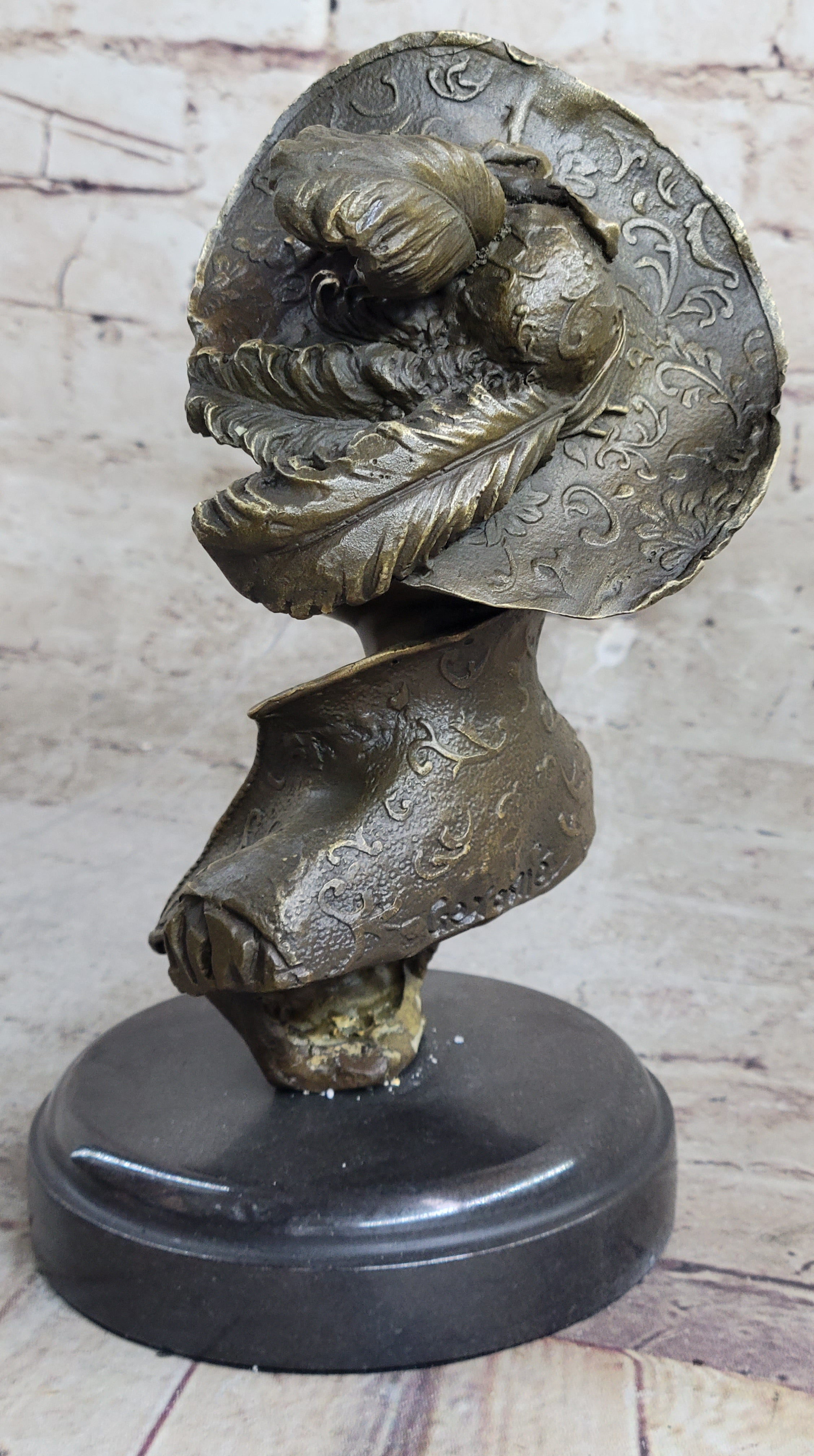 Handcrafted using the ancient lost wax method, this 100% bronze sculpture stands as a testament to traditional artistry and fine craftsmanship. Mounted on a sleek black marble base, it provides a striking display of contrast and refinement. Signed by the renowned artist Milo, this stunning bust is a perfect addition to any collection, celebrating the grace and sophistication of a bygone era.Bronze Dimensions with Marble Base: Height 9" X Width 5"