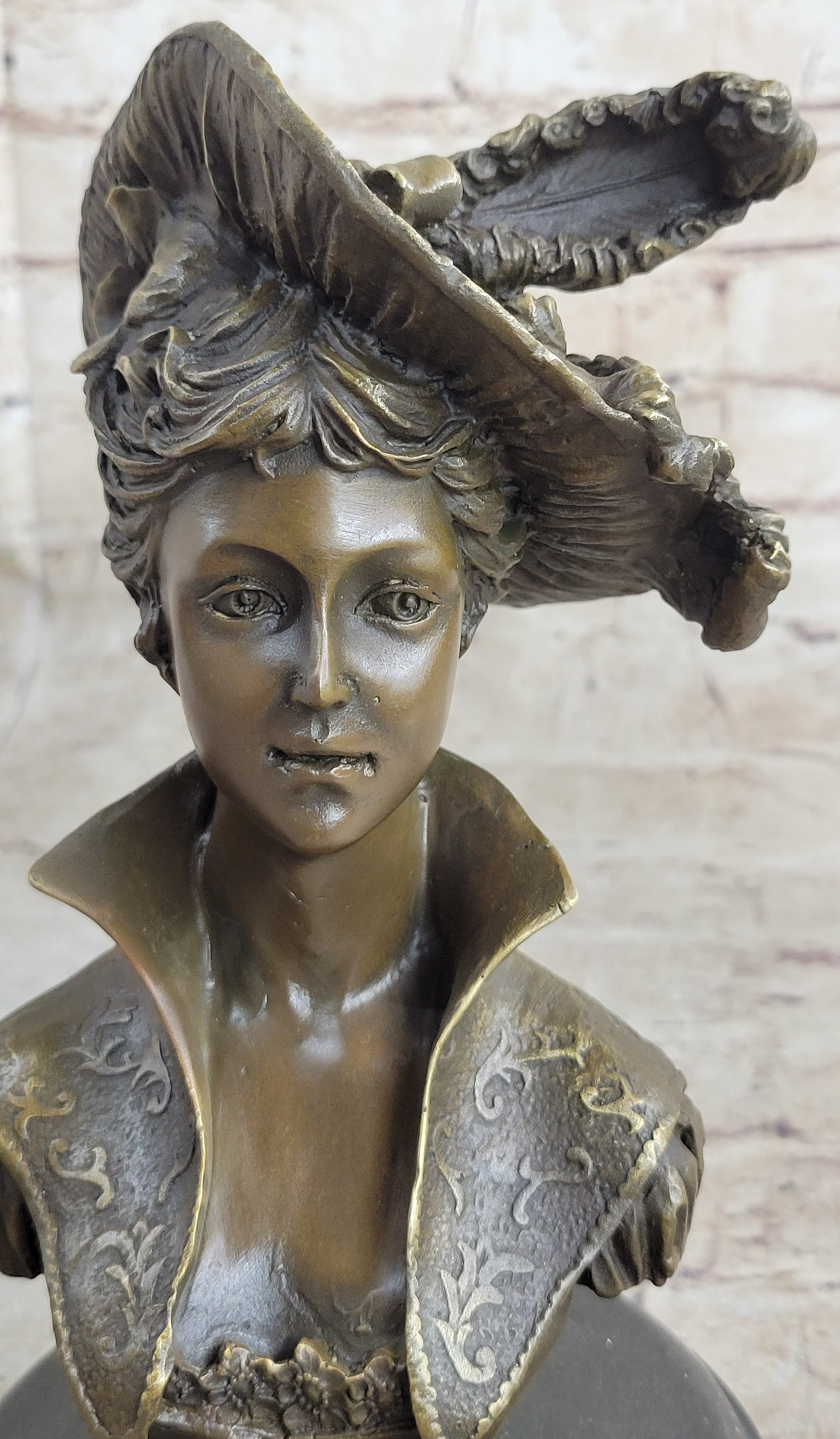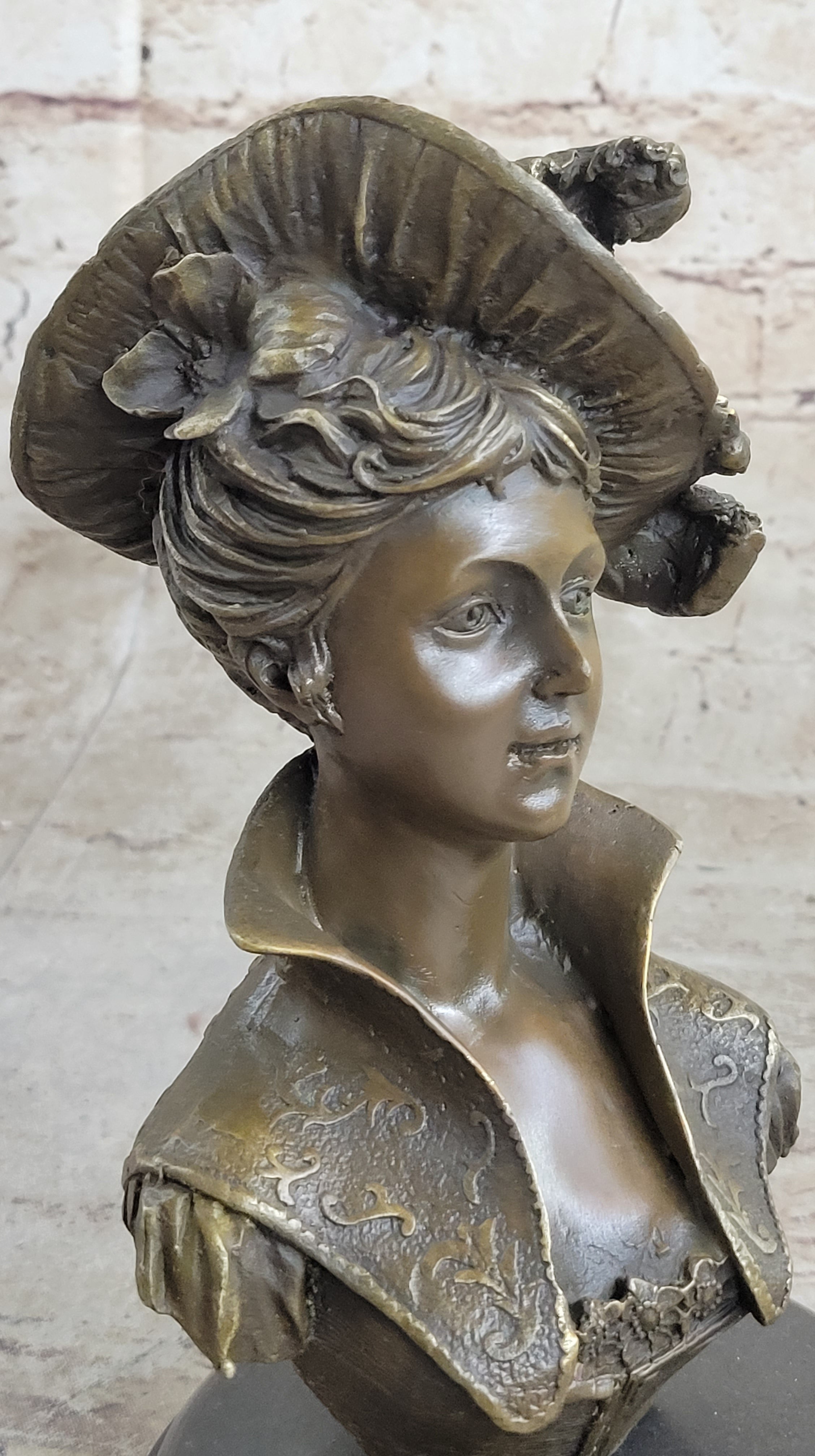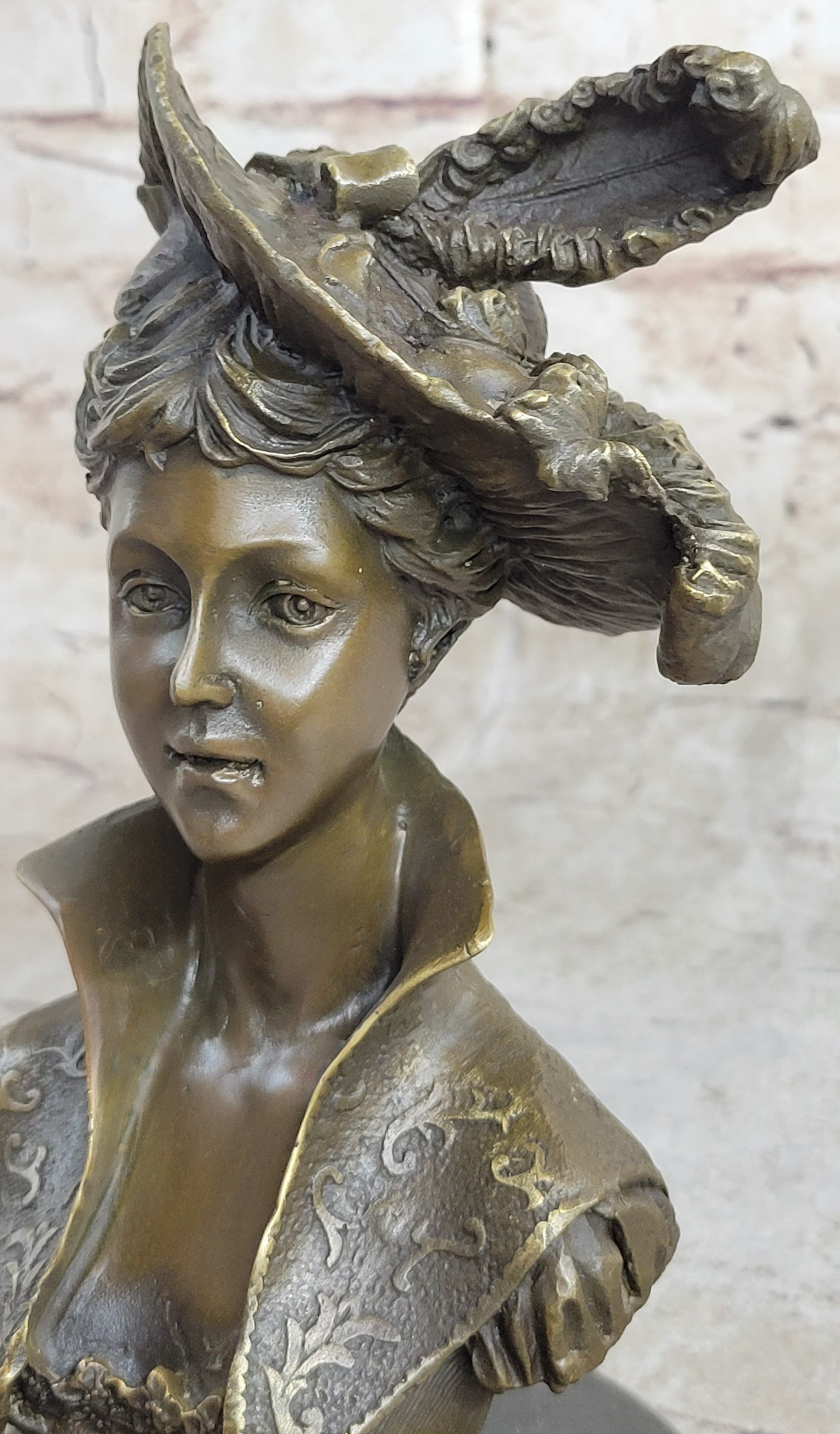 This exquisite bronze bust captures the elegance and charm of a young woman from the 1900s, embodying the refined fashion and sophistication of the era. Her graceful features, from her delicately sculpted face to her intricately styled hair, evoke the beauty and poise of a porcelain doll. Topping off her look is a gorgeous, wide-brimmed hat, adding an air of timeless elegance.