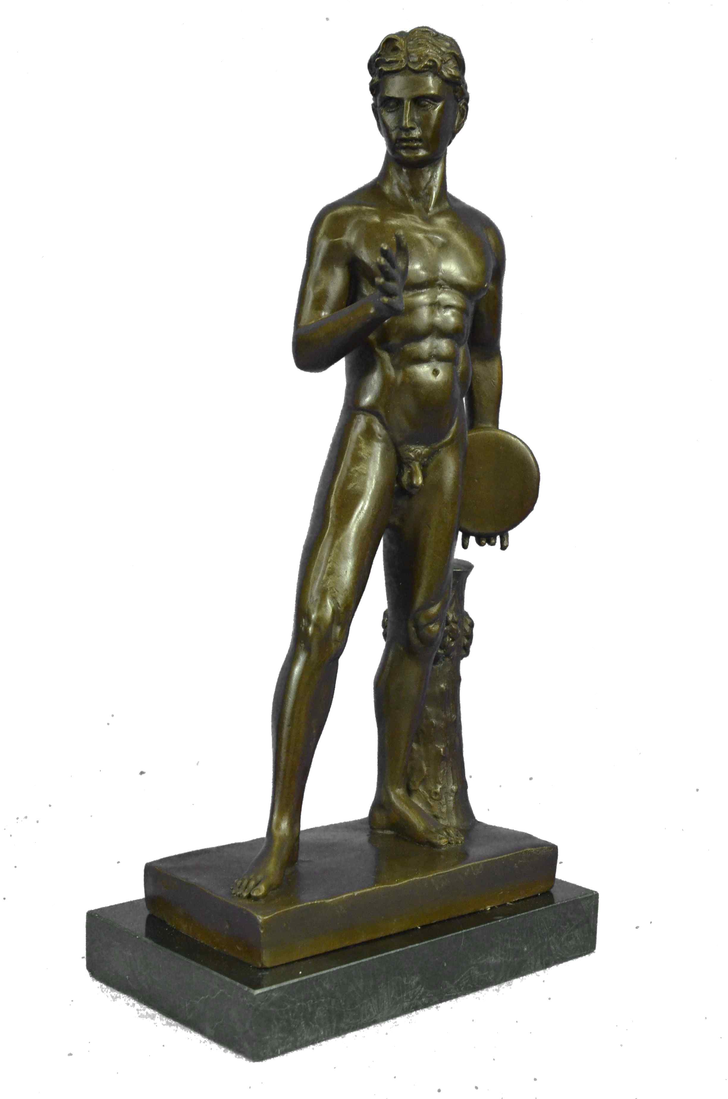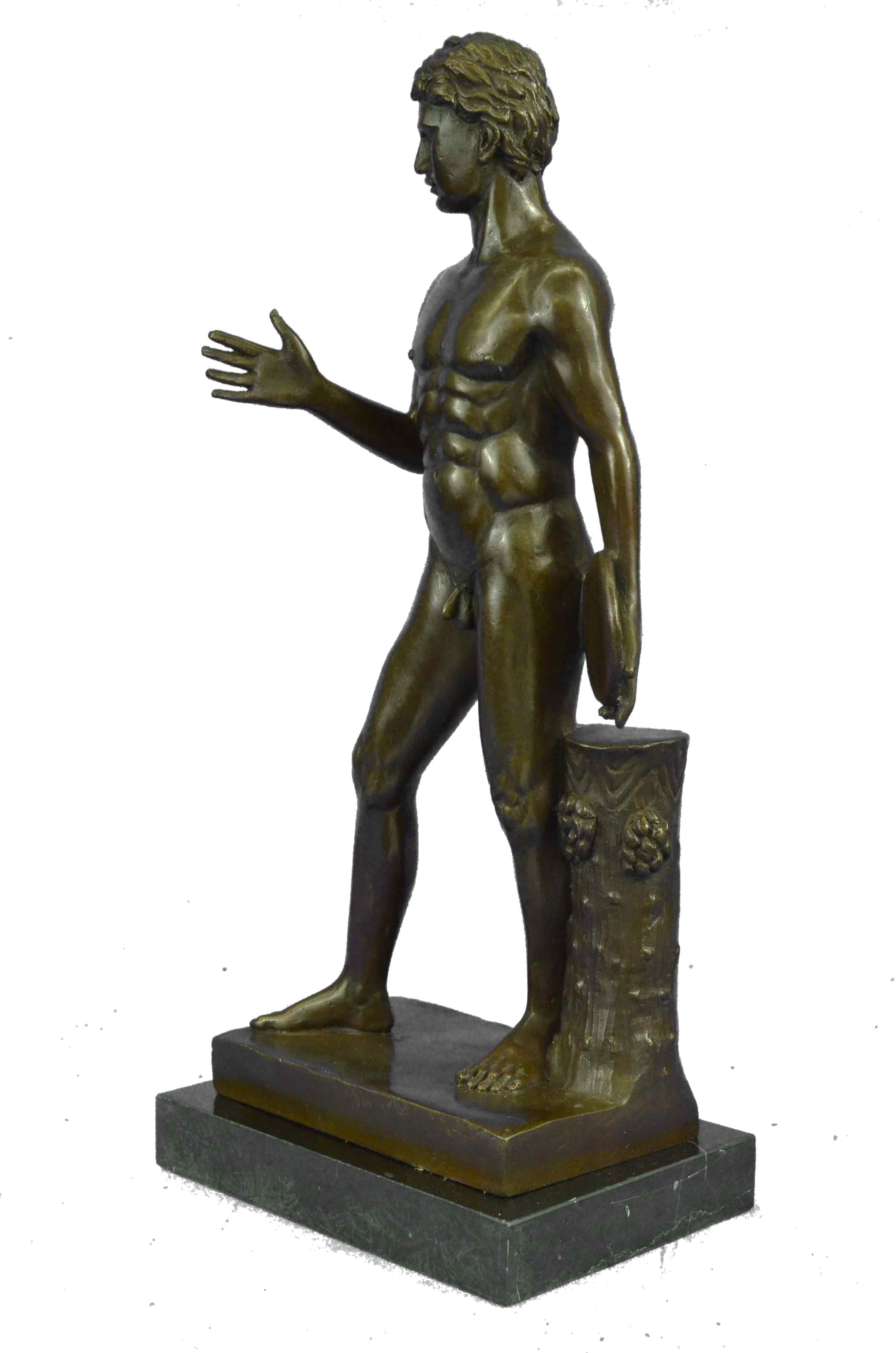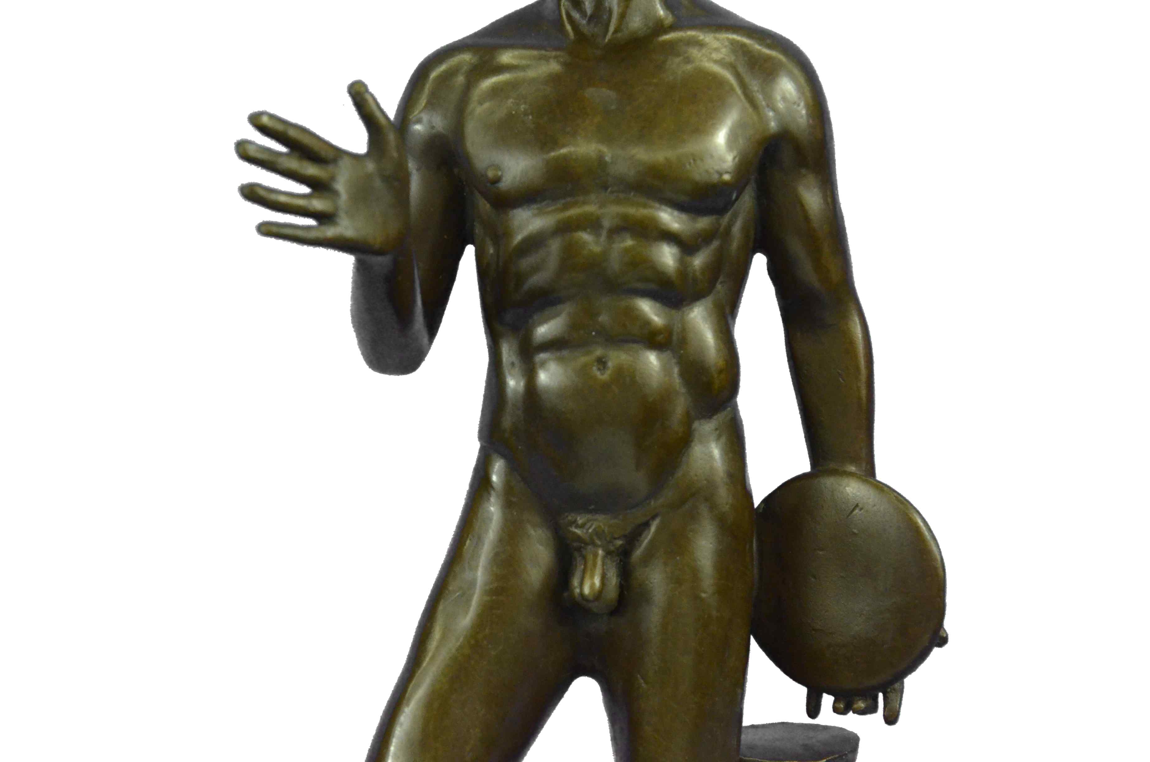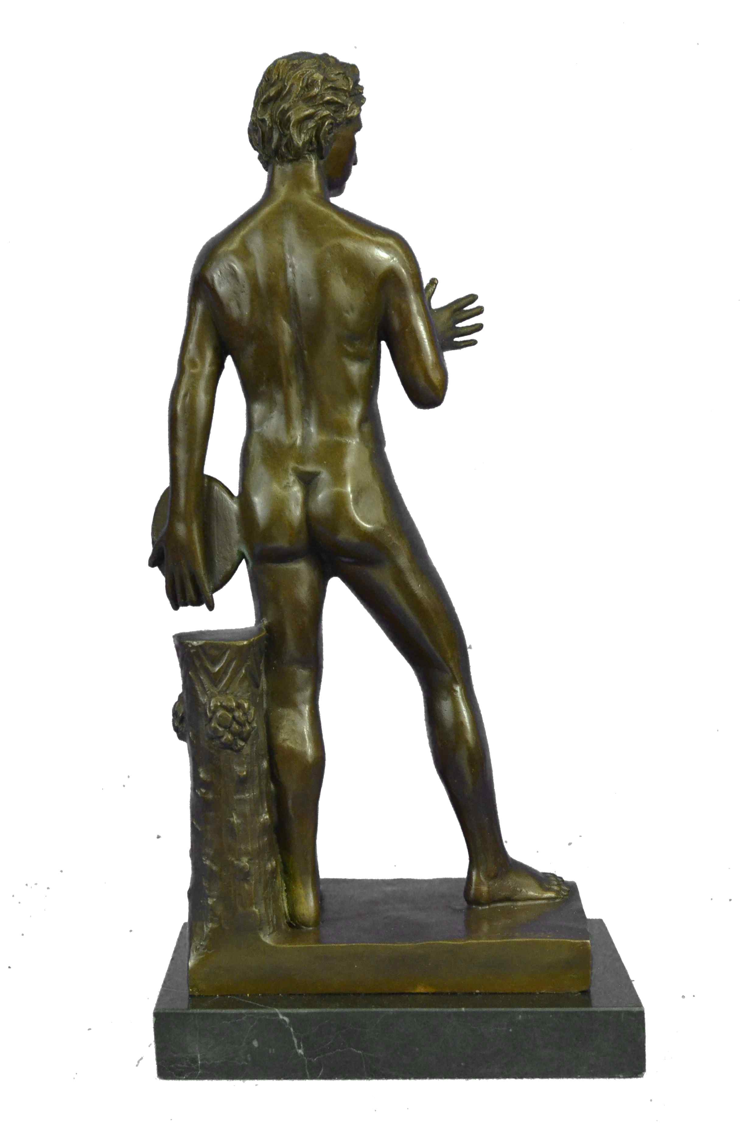 This lovely nude sculpture of this man symbolizes strength, power, and worth. This Man is how the typical man would want to look, Cut up with every part of his frame showing. He is standing at a comfortable pose, most of his weight rest on his left side of his lower body. His right hand is spread, while the other hand holds a plate. Under him there is a wooden piece carved beautifully for decoration. His hair is short and wavy and his eyes speak art. This piece couldn`t have been any more detailed, you can see every single line of his muscular frame. This sculpture was cast using the "Lost Wax Method" and is 100% bronze. It is handmade and is Limited Edition. It is signed by the artist Thomas.Original or Reproduction: Original