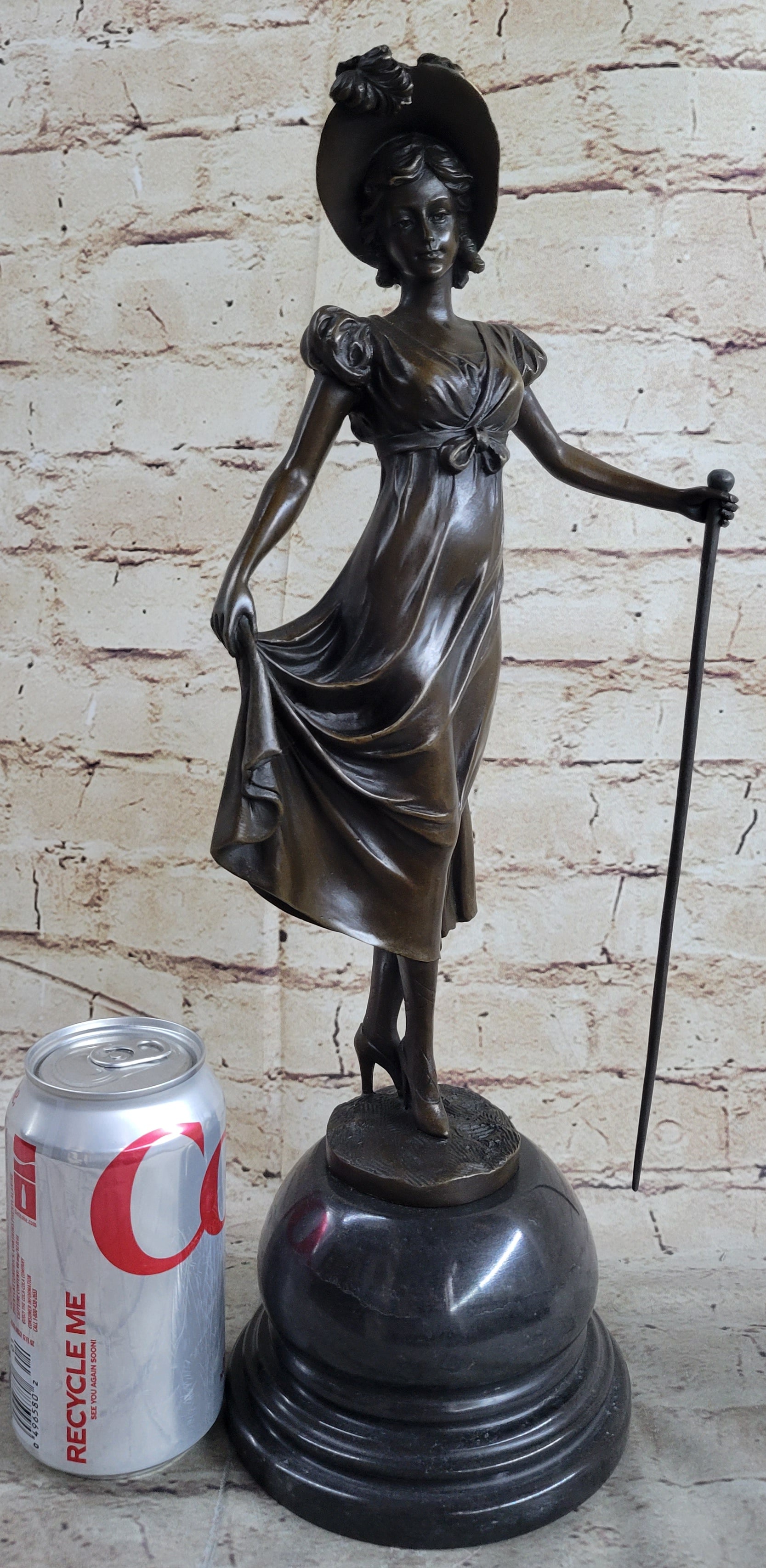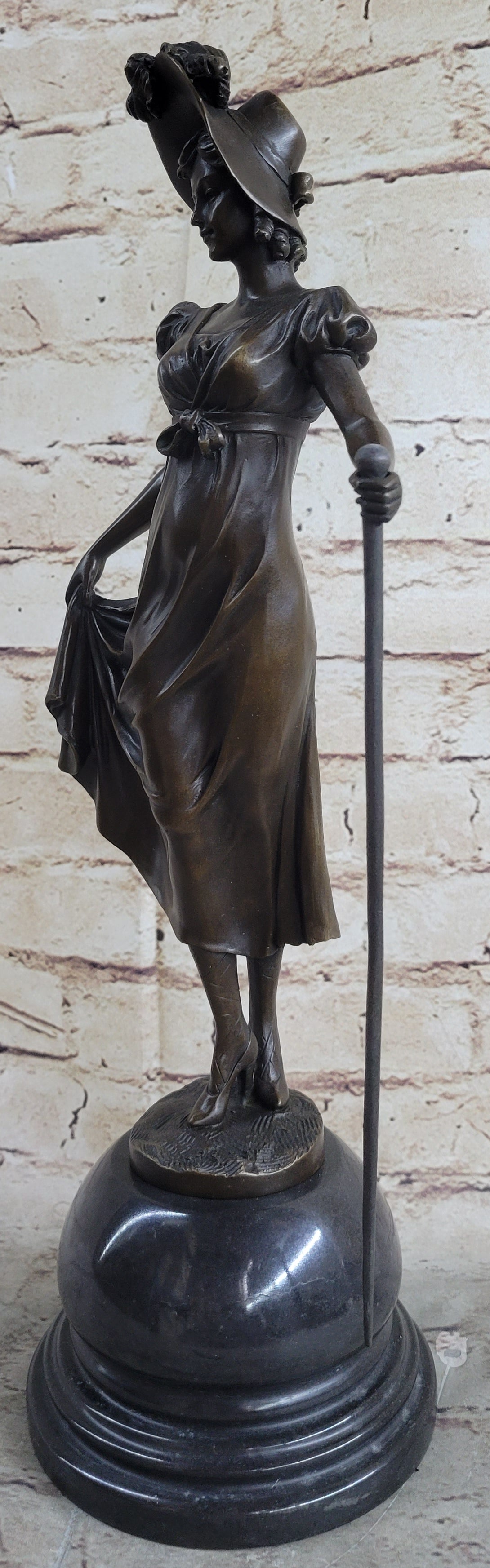 Step into the idyllic countryside with this captivating bronze sculpture that portrays the charm of a young woman strolling through open fields in her spring dress. Reminiscent of the whimsical character Little Bo Peep, the woman sports a large floppy sunhat and carries a staff by her side. However, her attire exudes a more mature and alluring style, featuring a cleavage-hugging dress with a bow under her bustline.