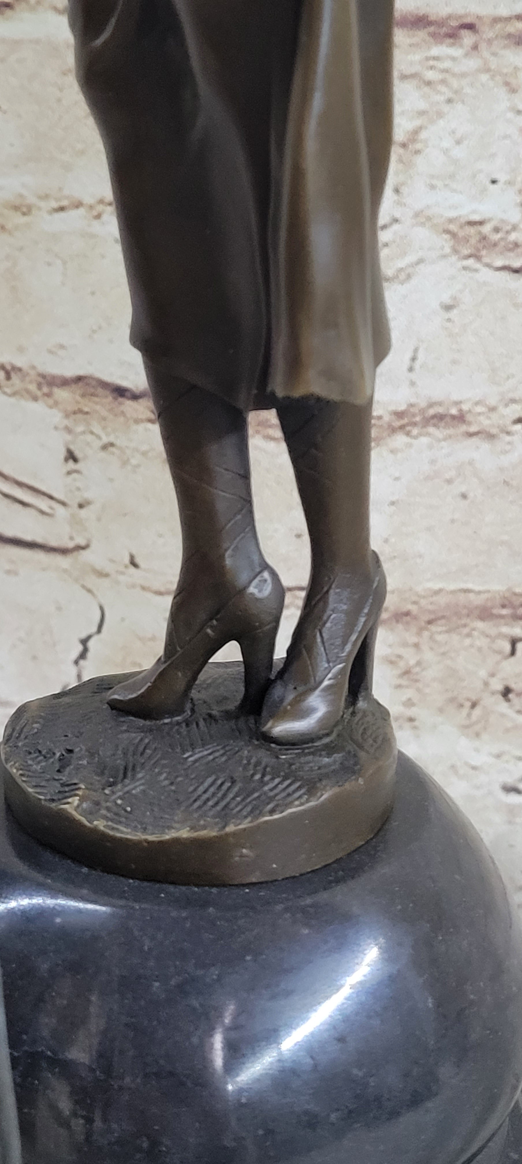 The sculpture masterfully captures the subtle nuances of the woman's movement as she lifts the hem of her dress, revealing her stylish high heels. Crafted with meticulous attention to detail, this 100% bronze artwork is handmade using the "Lost Wax Method." This ancient technique ensures precision and authenticity, preserving the fine intricacies of the sculpture. Mounted on a black marble base, the piece exudes a timeless elegance that complements any space.