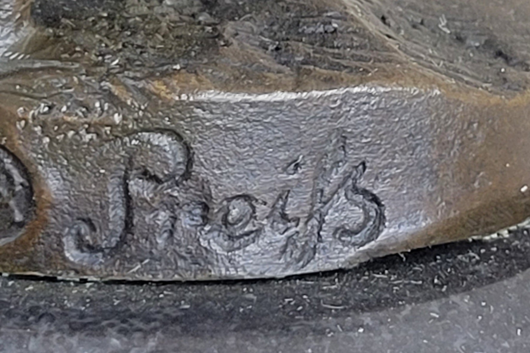 Signed by the artist Preiss, this brown patina sculpture becomes a unique and expressive addition to your art collection. The juxtaposition of innocence and allure in the woman's pose creates a captivating narrative, making this artwork a conversation starter and a delightful centerpiece for those who appreciate the fusion of art and storytelling.Bronze Dimensions with Marble Base: Height 16" X Width 7"