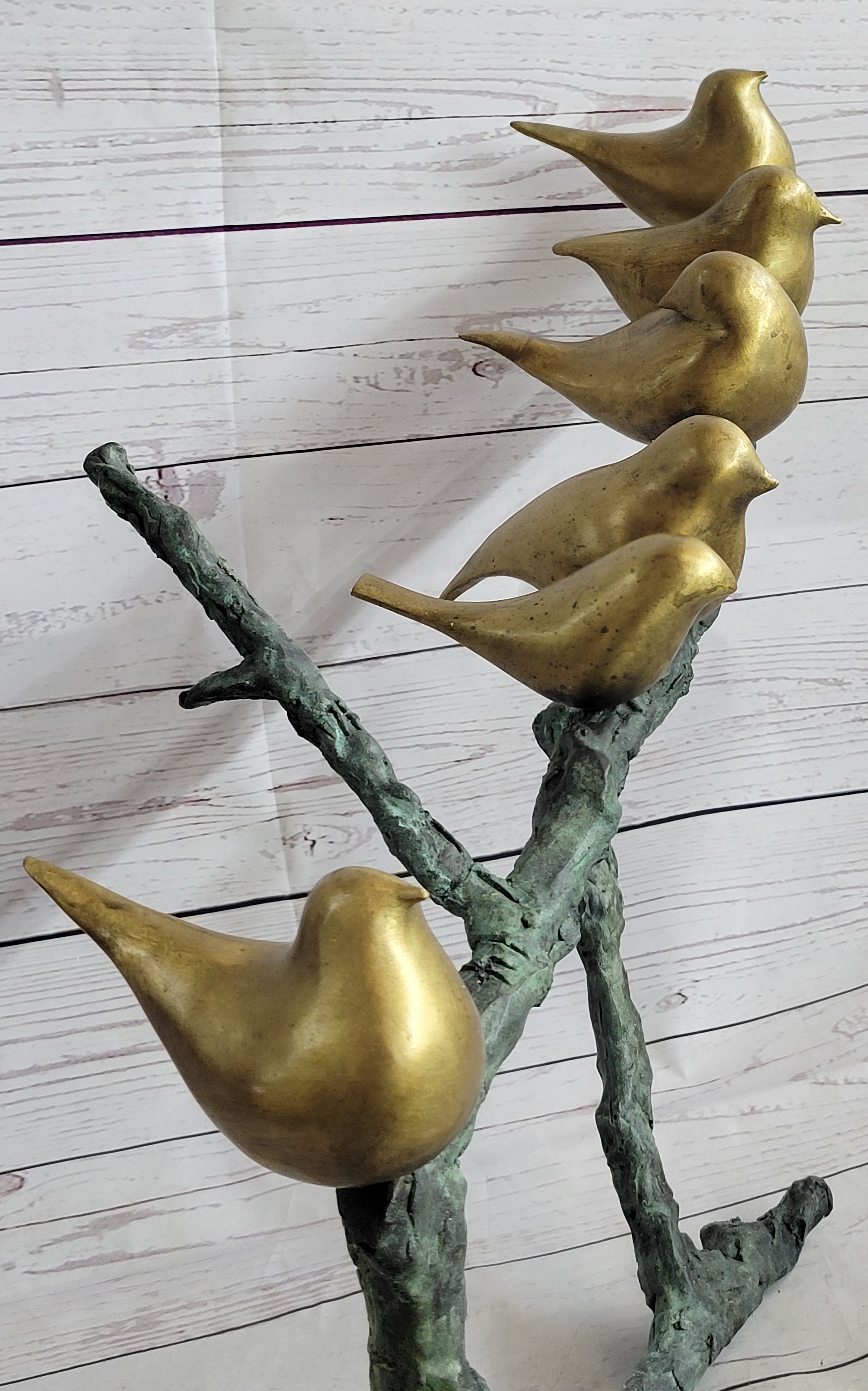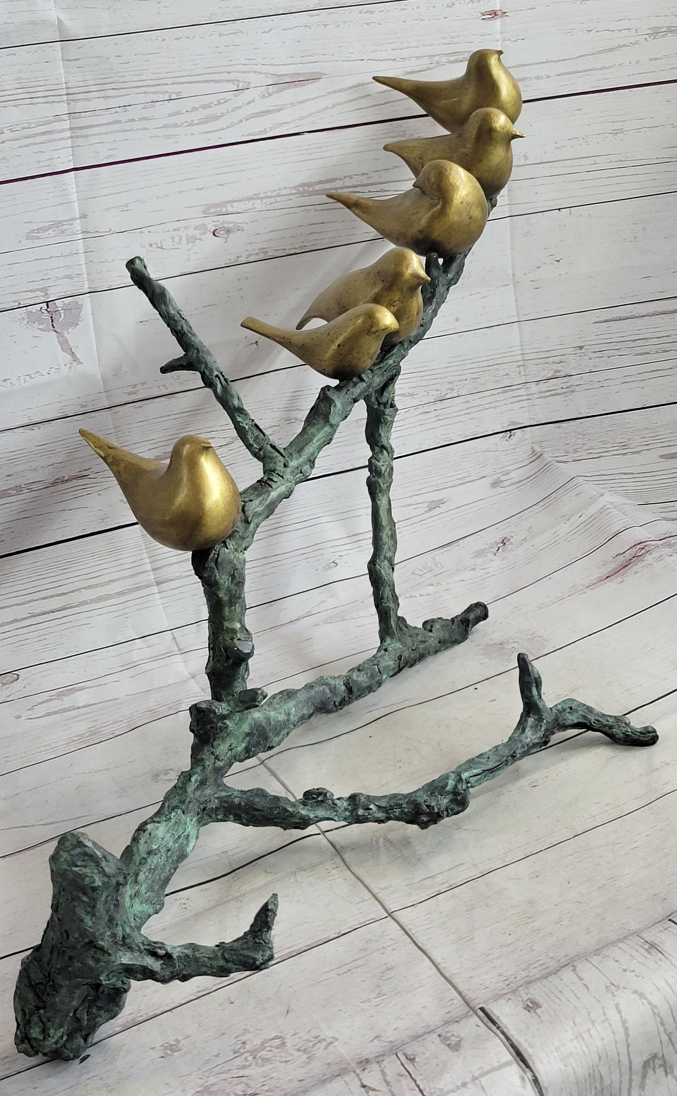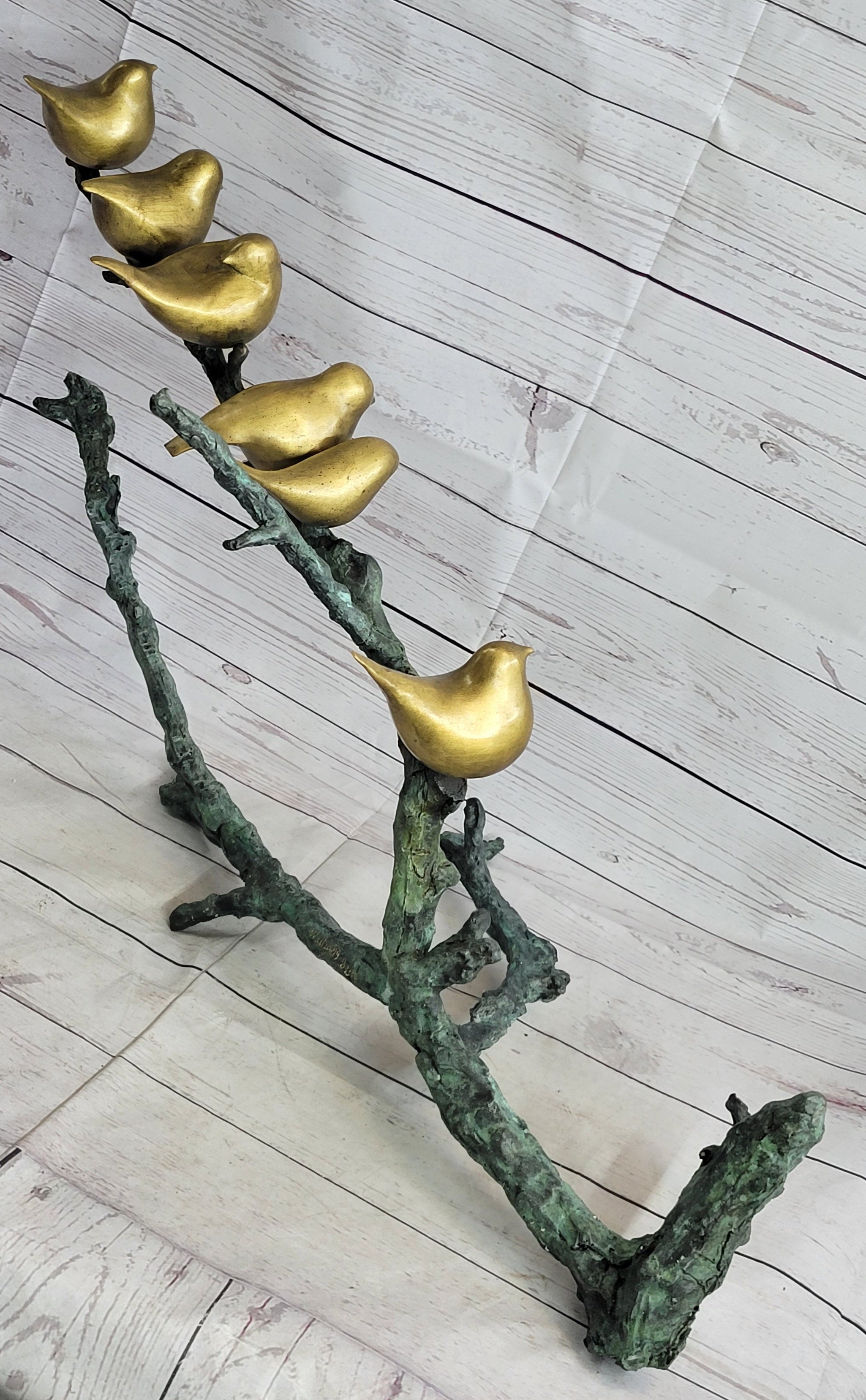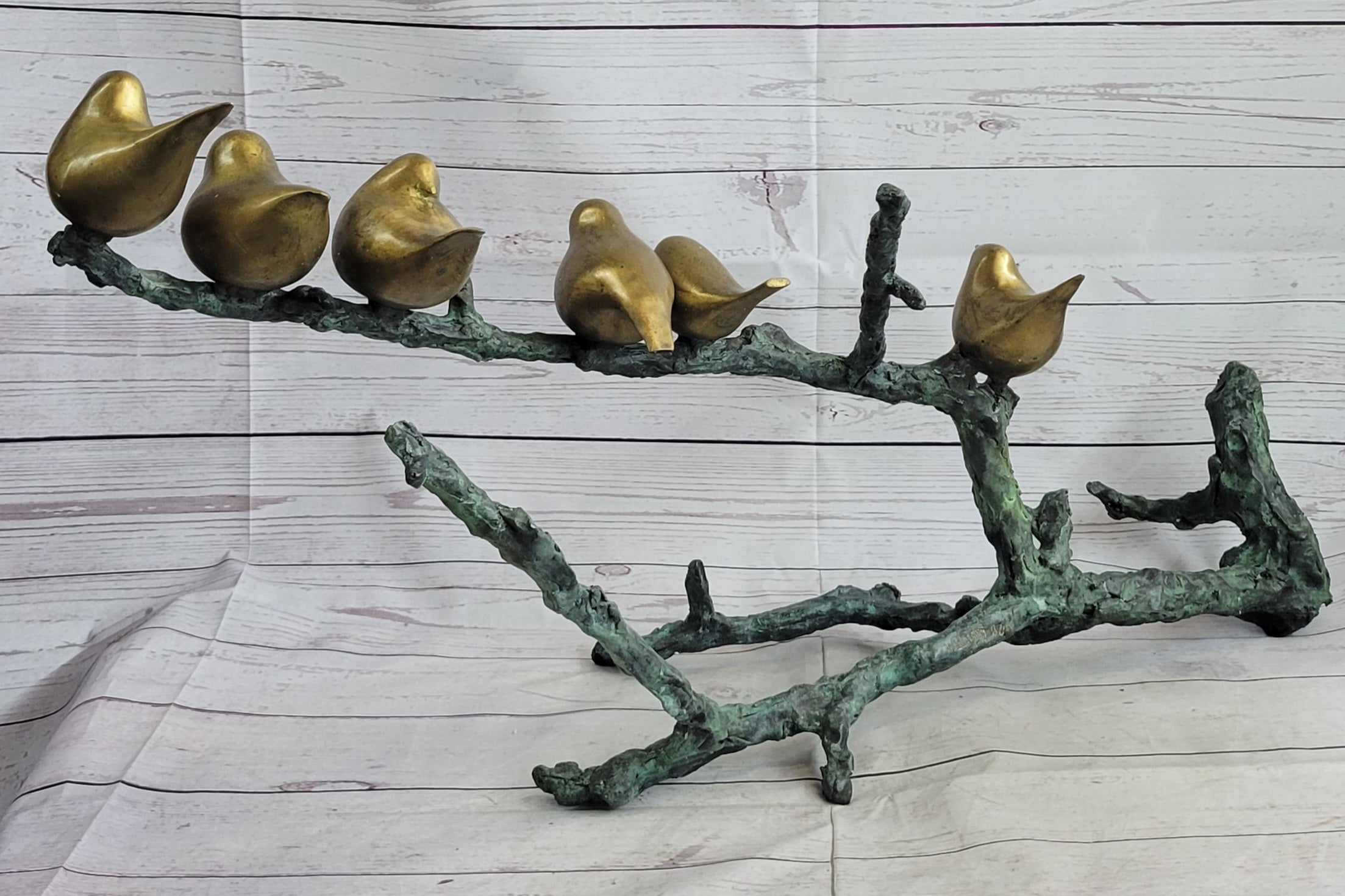 Six Birds on a Branch Bronze Metal Sculpture Contemporary Signed Art Decor 18" x 30"