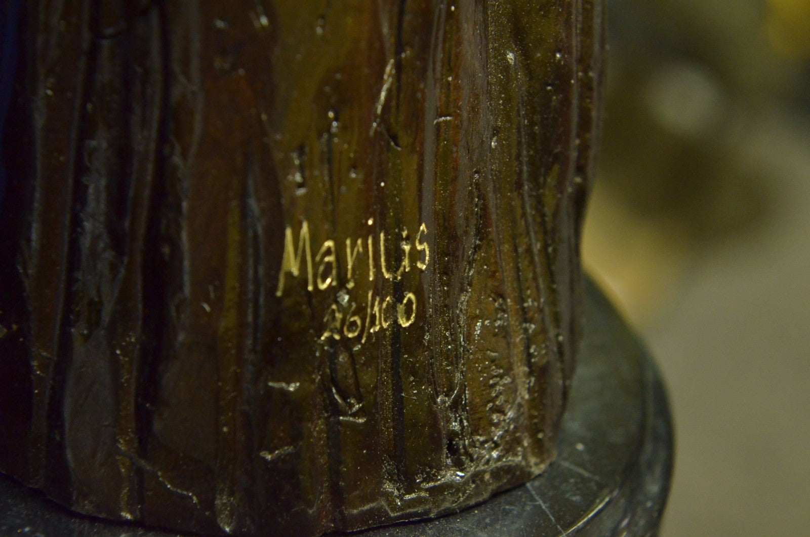 As the sun beats down on the pier this gorgeous seagull figures that this post suites him well and that it is the perfect spot to catch some rays and sun bath for a little while. As the salty waves splash against the posts of the pier below he stays high and dry perched on the top of the post also being on the alert of pedestrians dropping any morsel of food. His body is magnificently proportioned and has a great life like feel to him. His webbed feet spread over the old weather post and hold and balance his body in a poised manner. Around the post is a thick docking rope that is tied in a knot adding to this sculptures rustic old sea feel. This Limited Edition sculpture is perfect for any nautical themed room, garden or restaurant. This sculpture was cast suing the “Lost Wax Method” and has a two toned brown patina with gold highlighting his beak and his feet and he is mounted on a black marble base. This sculpture is 100% bronze and is handmade it is signed and numbered by the artist Marius. This is a Limited Edition and is sure to go quick, be sure to get yours soon before they run out.Original or Reproduction: Reproduction