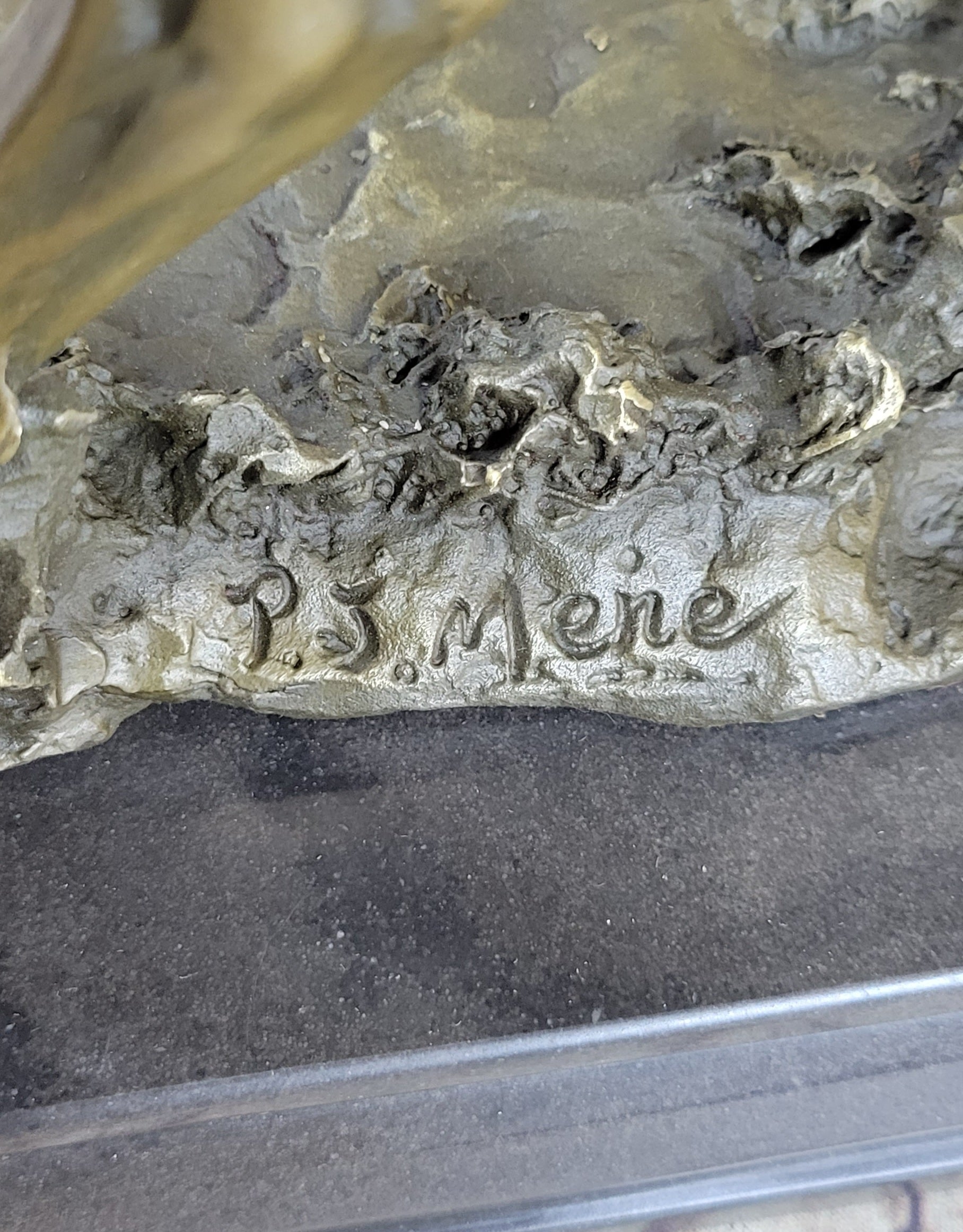 Resting upon a black marble base, the sculpture creates a harmonious connection with its surroundings, offering stability and a refined presentation. Crafted with precision, the sculpture utilizes the lost wax method, a time-honored technique that allows for intricate detailing and the preservation of the artist's vision. The artist's signature, Mene, adds a touch of quality, recognizing the skilled craftsmanship behind this portrayal of a feral horse. This sculpture becomes more than a representation; it encapsulates the spirit of the untamed, making it an engaging and symbolic piece for those who find beauty in the simplicity of nature.