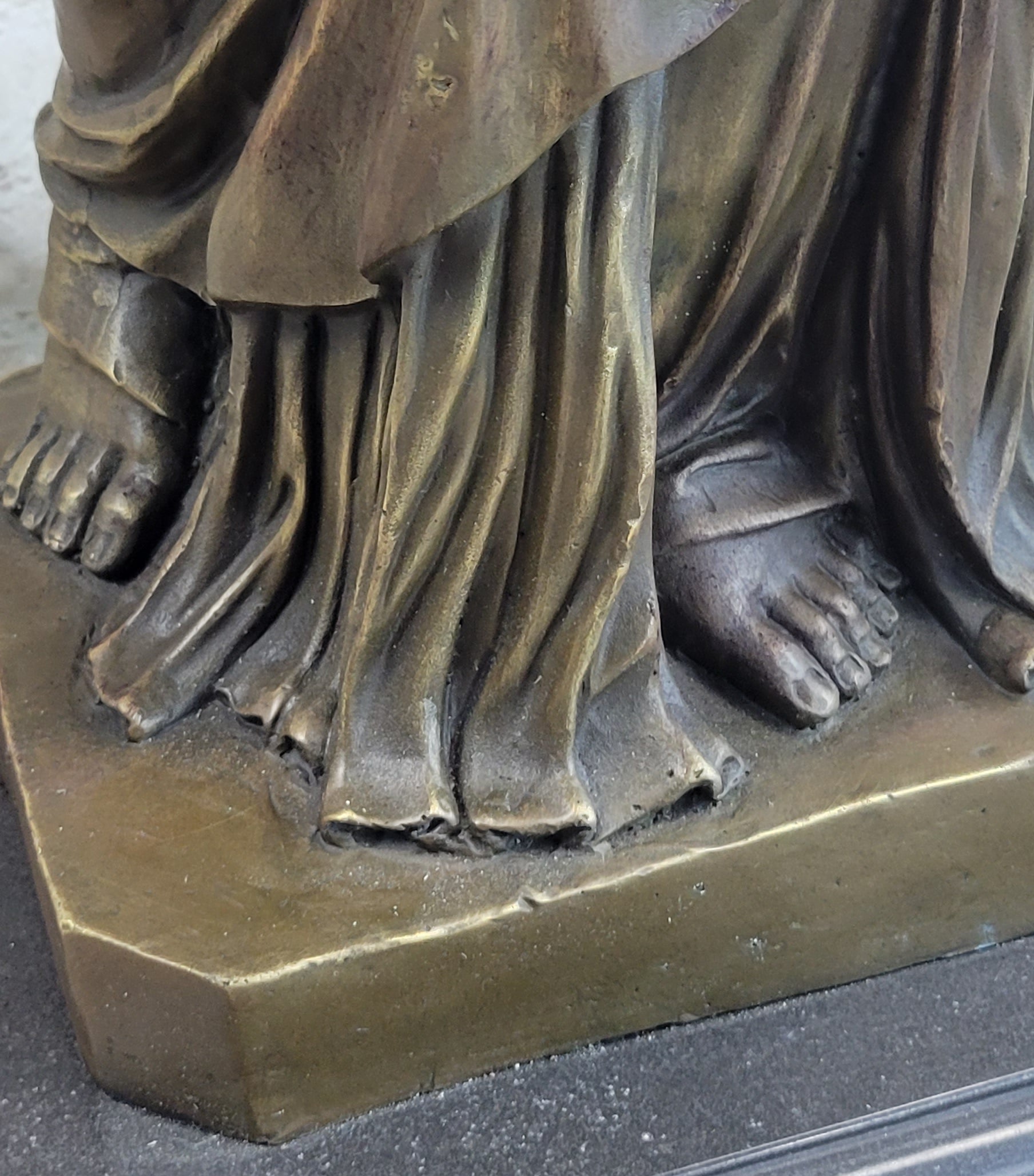 The intricate details of this rendition capture the essence of the original statue's grace and majesty. Crafted through the revered lost-wax casting technique, every contour and feature is meticulously preserved in bronze. A rich brown patina finish adds depth and warmth to the sculpture, enhancing the textures and emphasizing the reverence it holds.