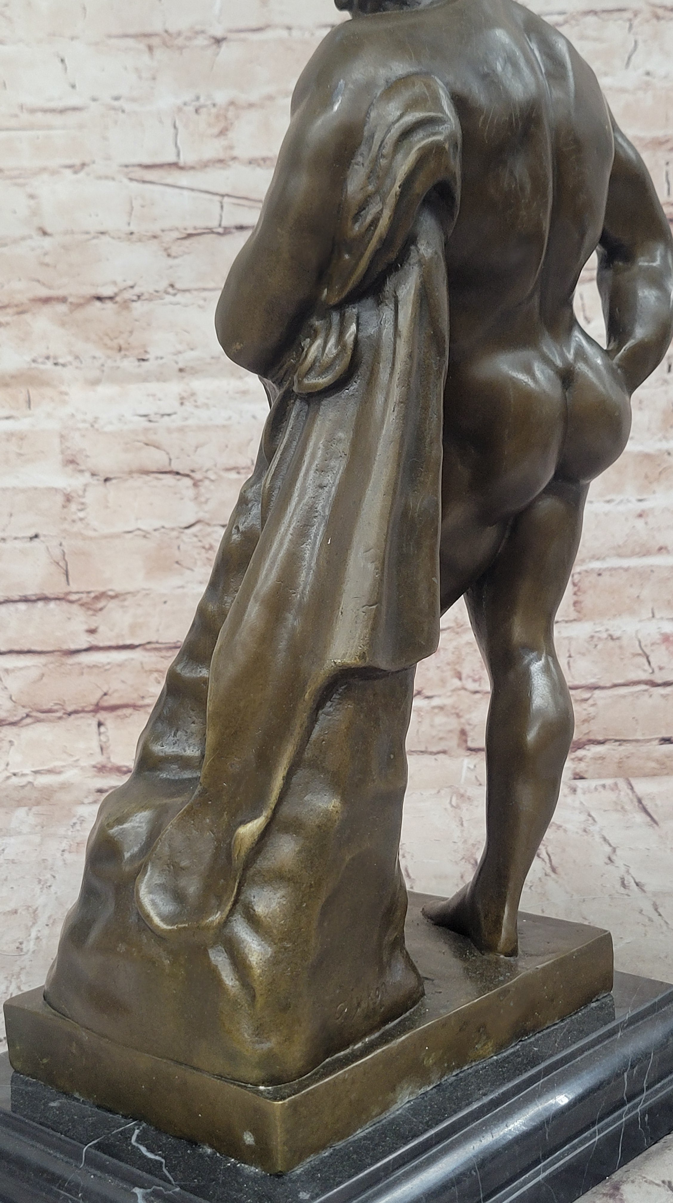 Mounted on a solid marble base, this exquisite bronze reproduction carries the signature of Glycon, the artist credited for the ancient marble masterpiece. The blend of mythology, art history, and craftsmanship makes this sculpture an extraordinary piece of collectible art, suitable for display in any space that appreciates both classical beauty and mythological significance.Bronze Dimensions with Marble Base: Height 18.5" X Width 9 1/2"