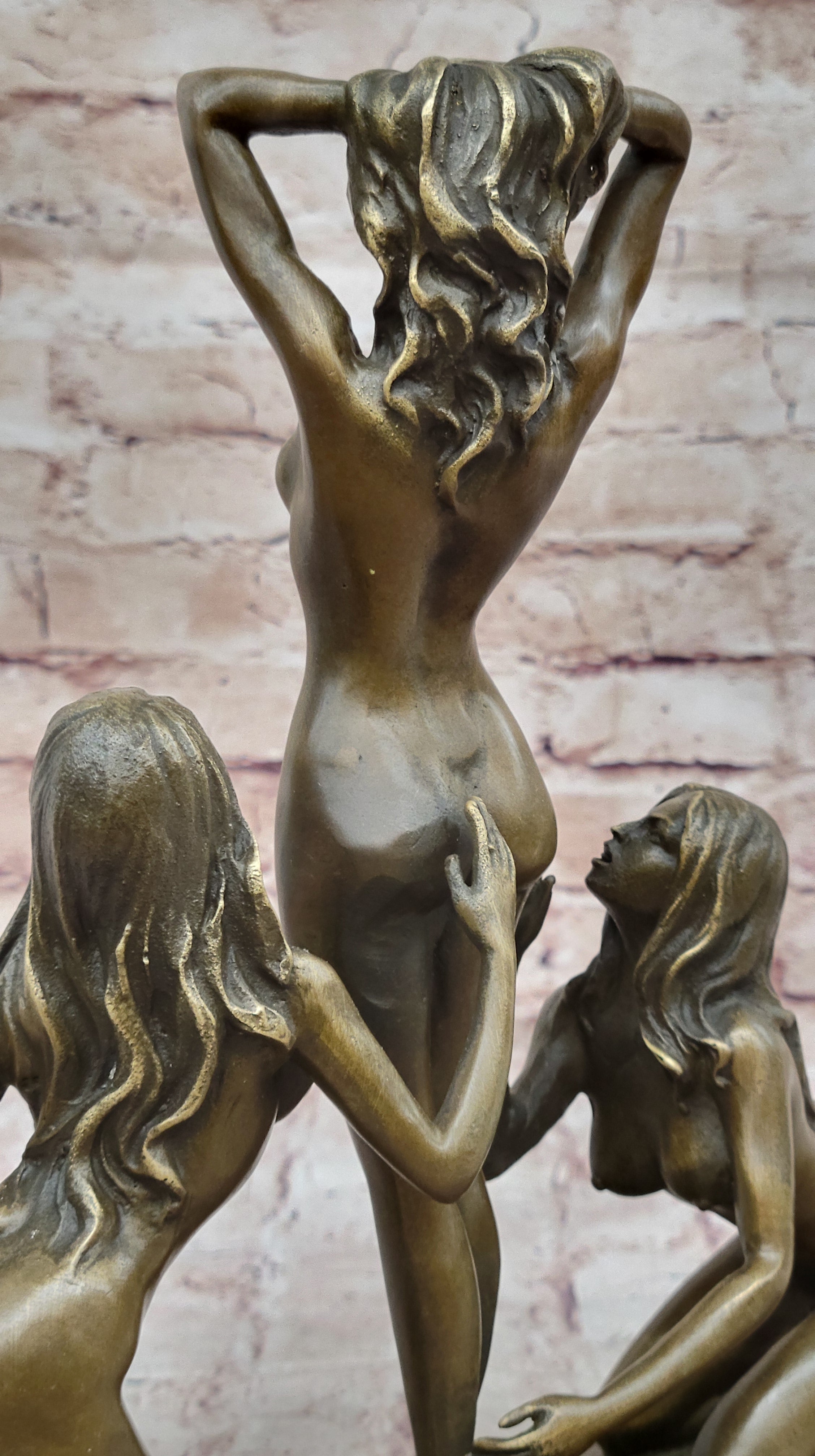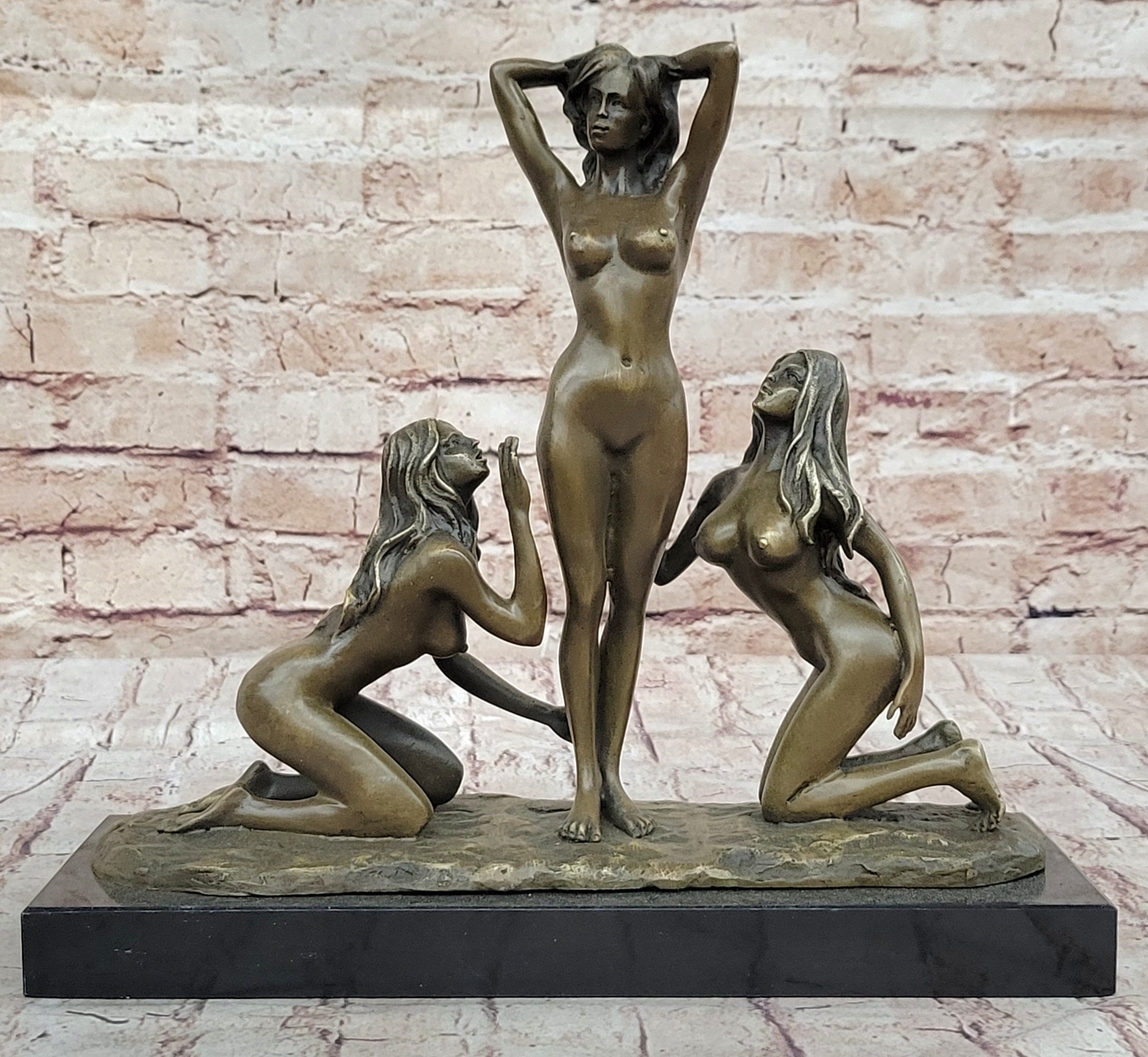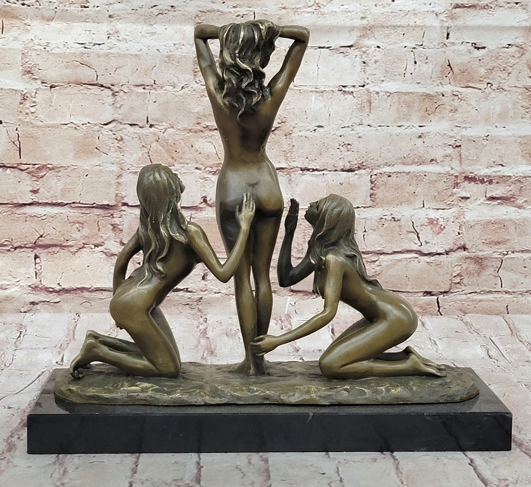 This stunning bronze sculpture features three nude women, captured in a graceful and timeless pose. The sculpture is meticulously cast using the traditional Lost Wax Casting method, a labor-intensive and time-consuming technique that ensures pristine quality and vivid detail. This method, renowned for its ability to produce highly detailed bronze statues, results in a piece that vividly captures the beauty and elegance of the female form.