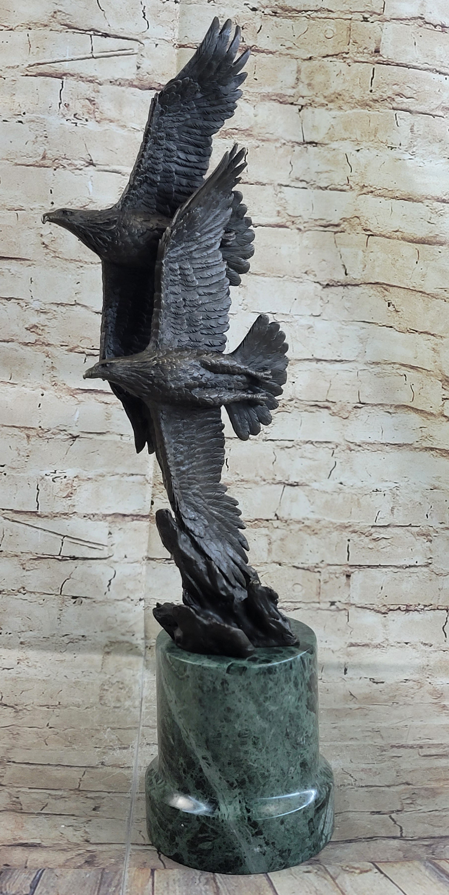 Two Bald Eagles Flying Sideways Bronze Metal Statue Sculpture on Green Marble Base