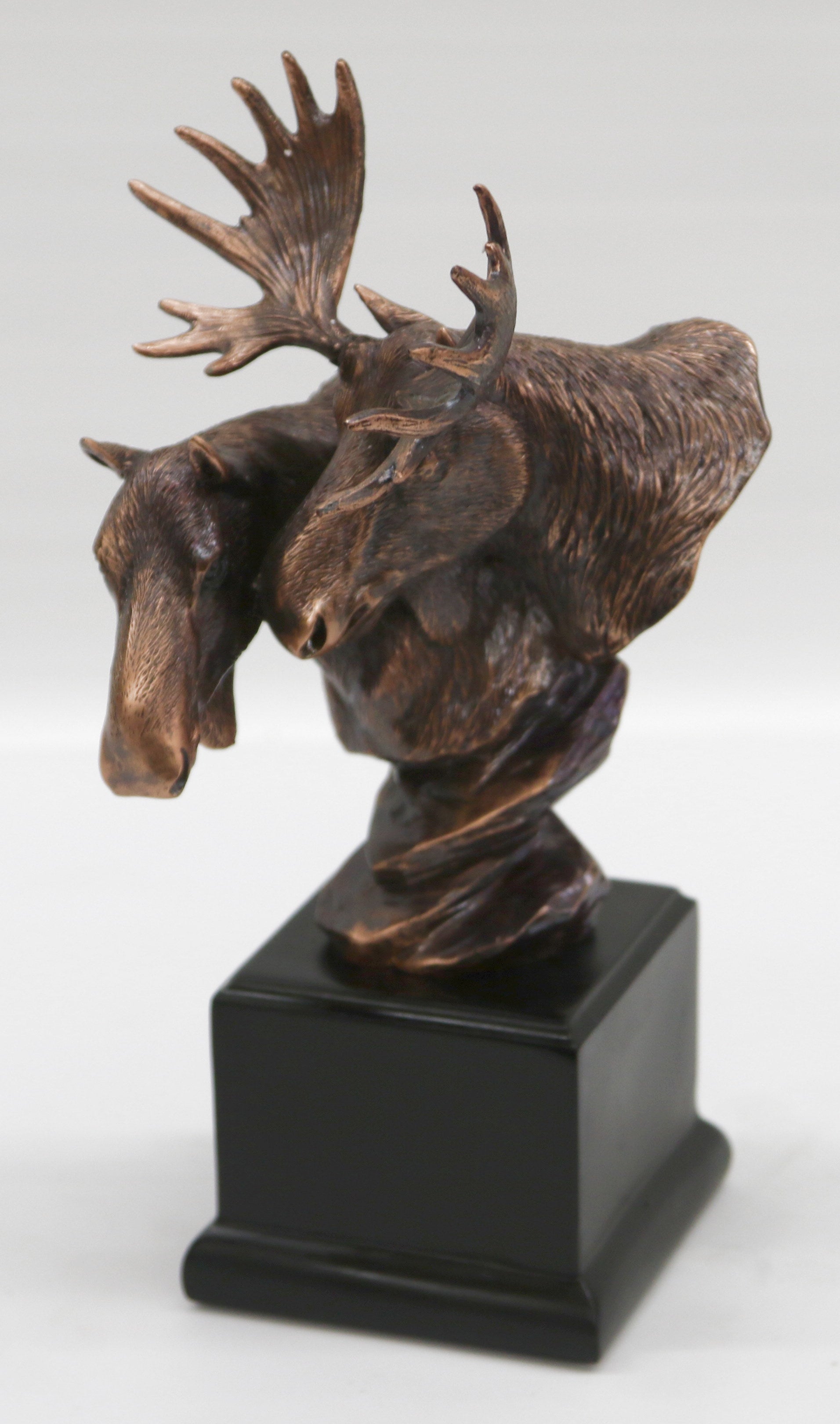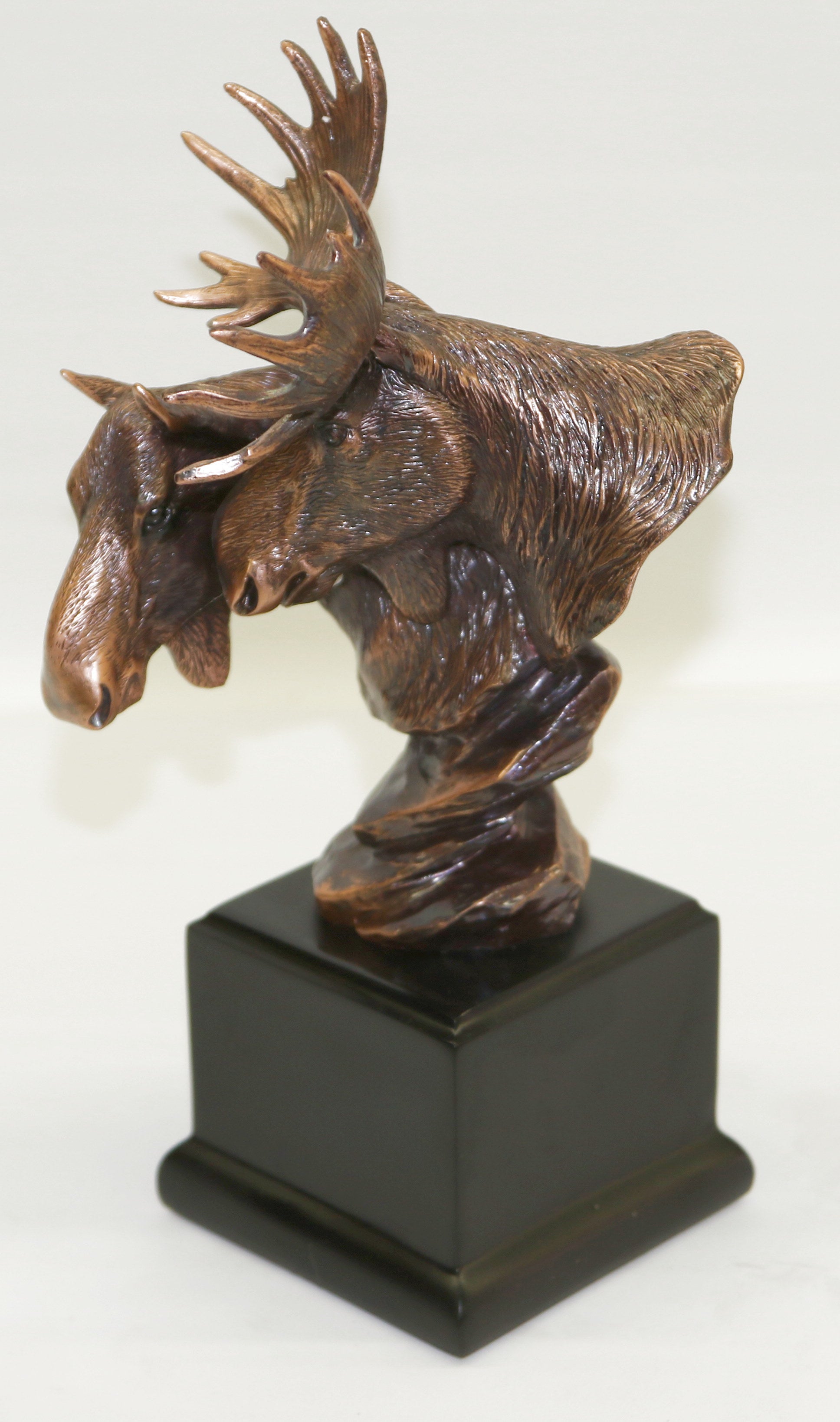 Two Moose Head Bust Bronze Finish Sculpture Sitting on Base Figurine Sale