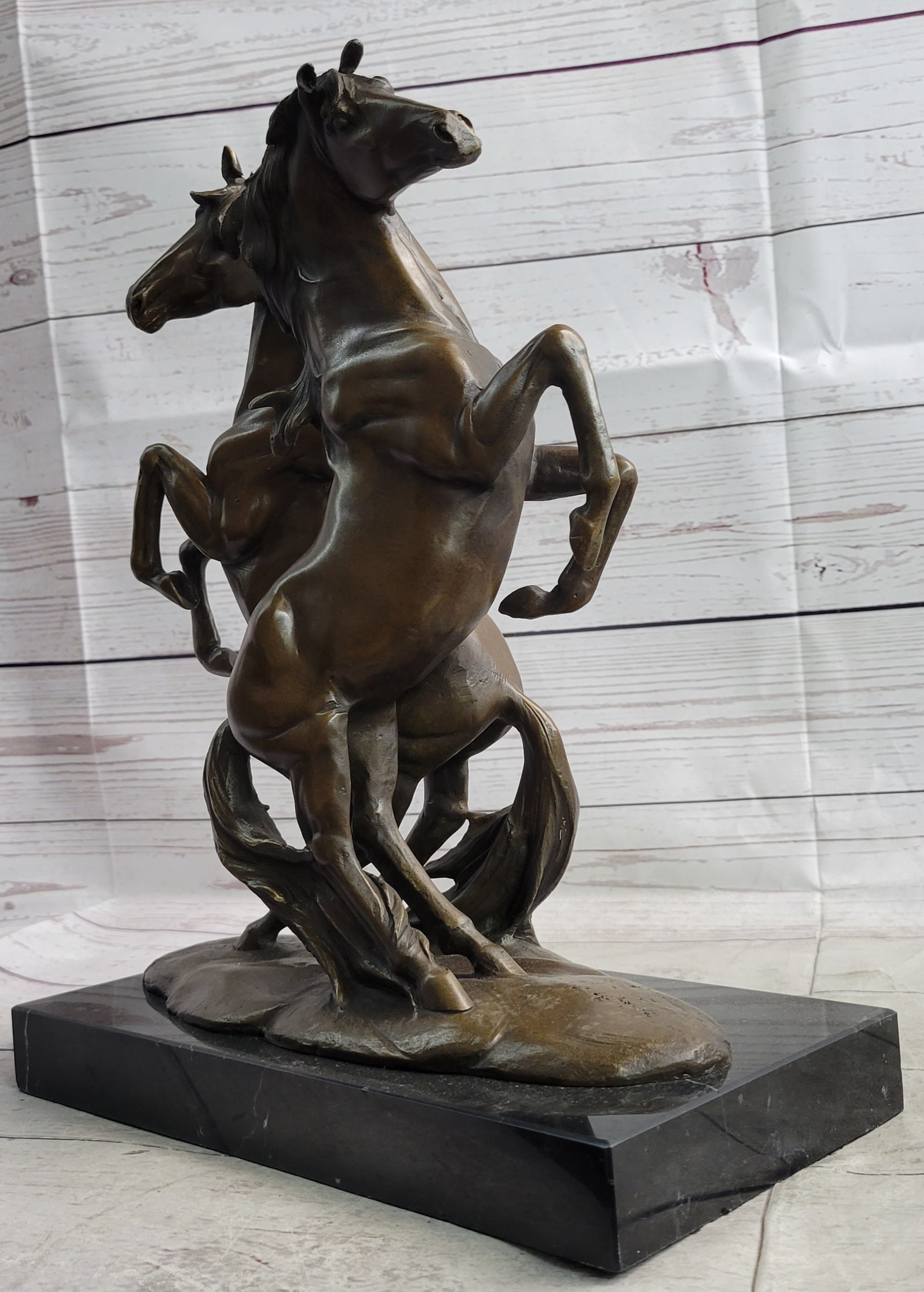 This magnificent bronze sculpture features two wild stallions captured in a dynamic and powerful pose. Handcrafted using the traditional lost wax method, this piece showcases the meticulous artistry and attention to detail of its creator. The rich brown patina enhances the lifelike quality of the sculpture, highlighting the strength and grace of the stallions.