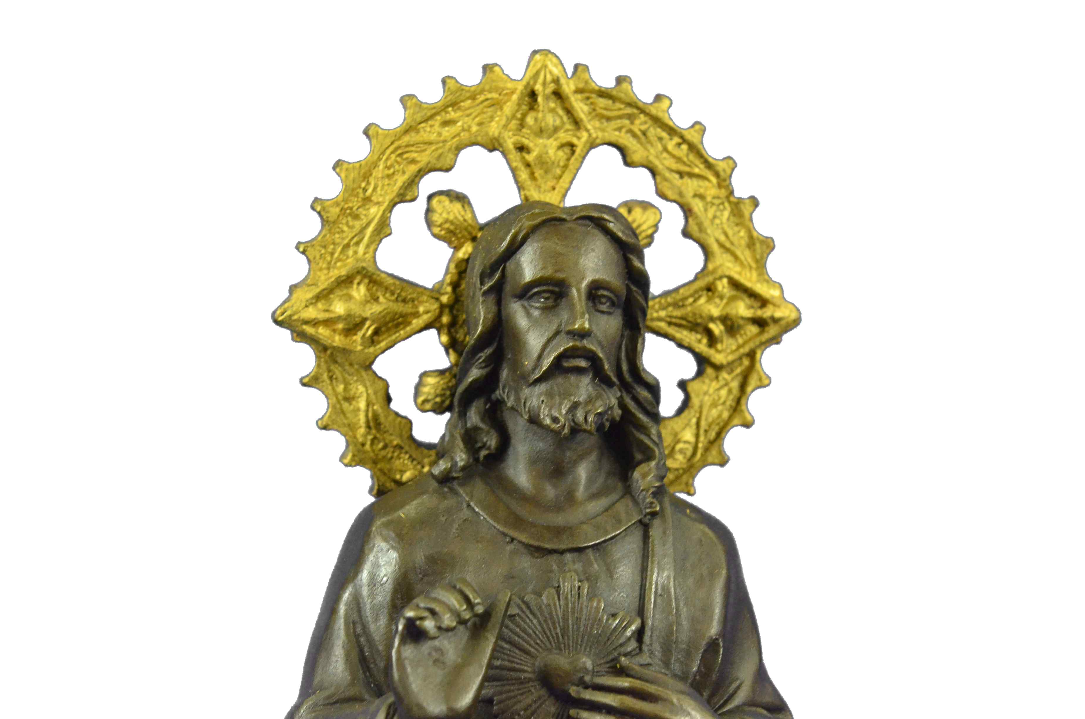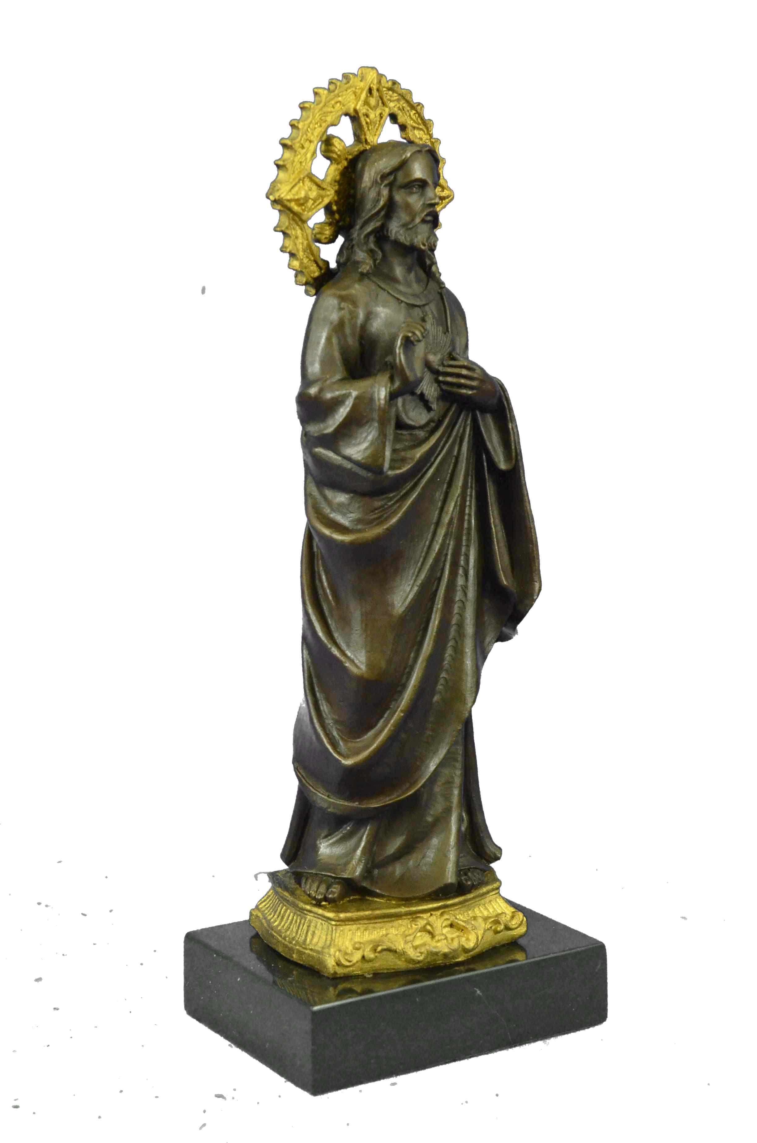 Jesus Christ sits on a pedestal entwined by a long flowing robe. He raises his hand like an antenna gathering everything in and out of his divine soul. With eyes closed, he seems to take a deep breath inward, gaining his peace, that he will bestow to the world in infinite blessings. The bronze handmade sculpture was cast using the ancient method of lost-wax casting and stained with a brown and gold patina finish for preservation. It is mounted upon a black variegated marble base with the the artist Valli`s signature.Original or Reproduction: Original
