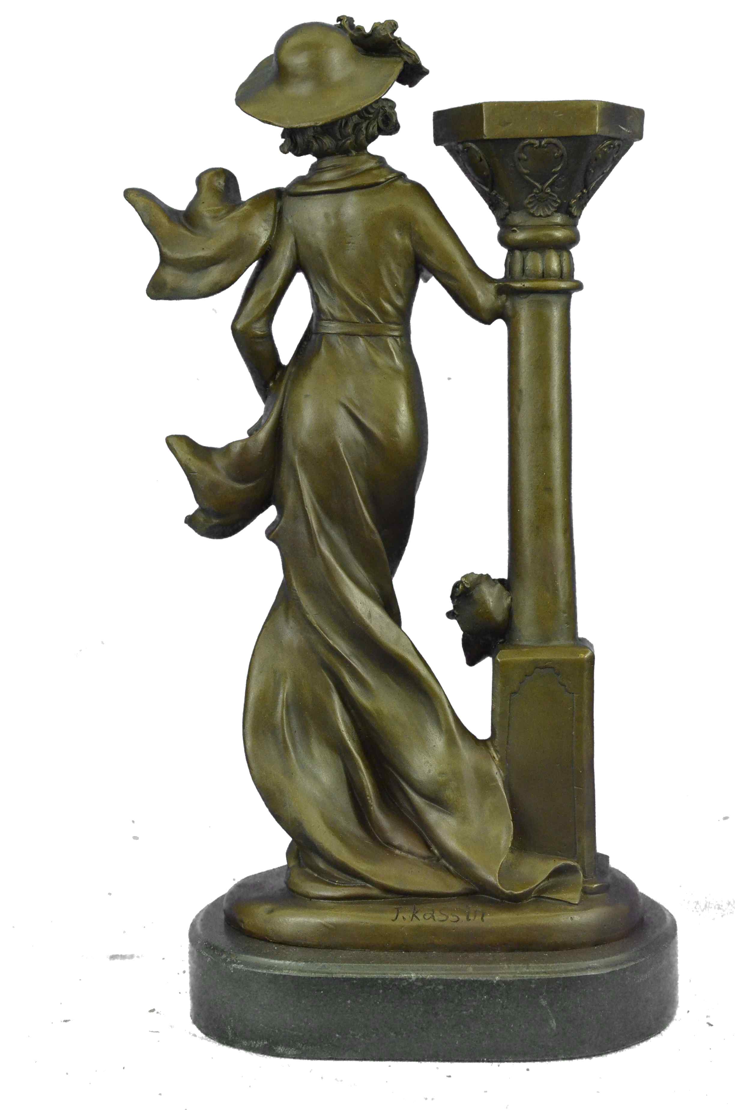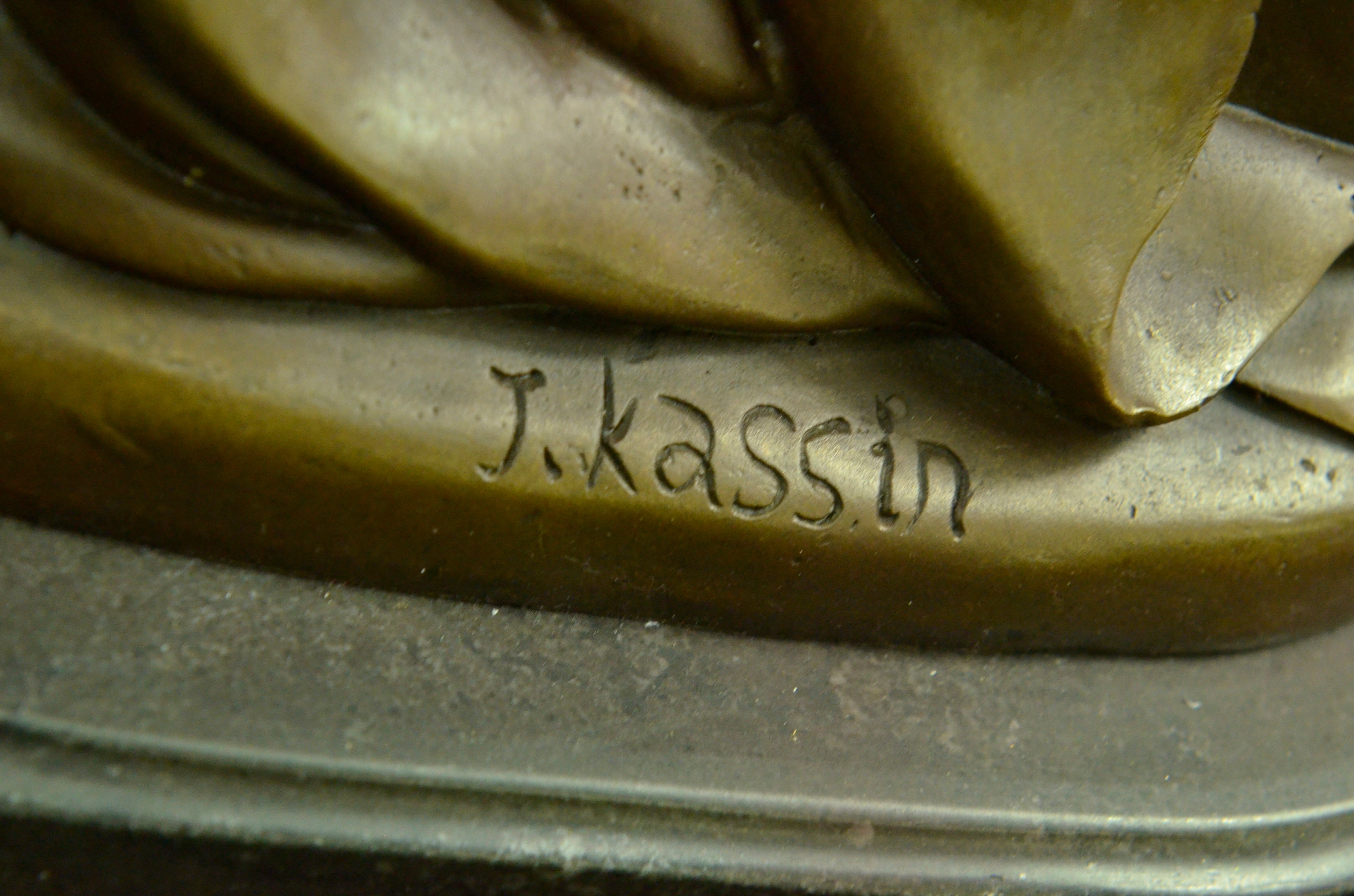This candelabra is a superb reproduction from the past. Made with solid bronze , hand-painted and antiqued, this candelabra features flowing lines and rich details. The dreamy and sensuous beauty, combined with functions for everyday use, delivers the essence of Art Nouveau and provides a captivating visual focus. Measuring approx. 17" inches in length, this candelabra is heavy and very well-made. Signed by Artist J. Kassin, a collectible dream.Original or Reproduction: Original